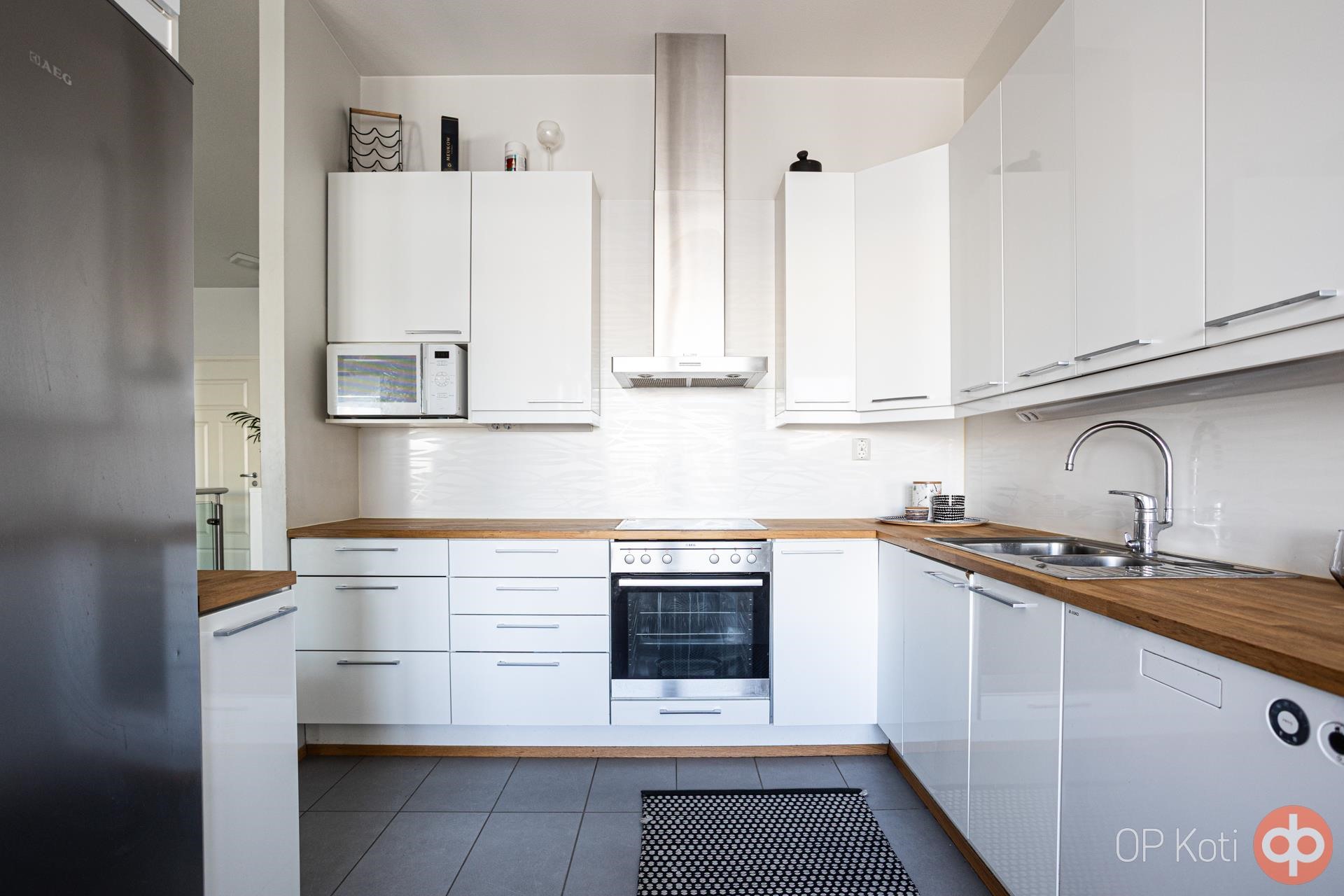 - Jääkaappi, pakastekaappi, erillisuuni, induktioliesi, liesituuletin, mikroaaltouuni, astianpesukone, kaapistot, kiinteät valaisimet.