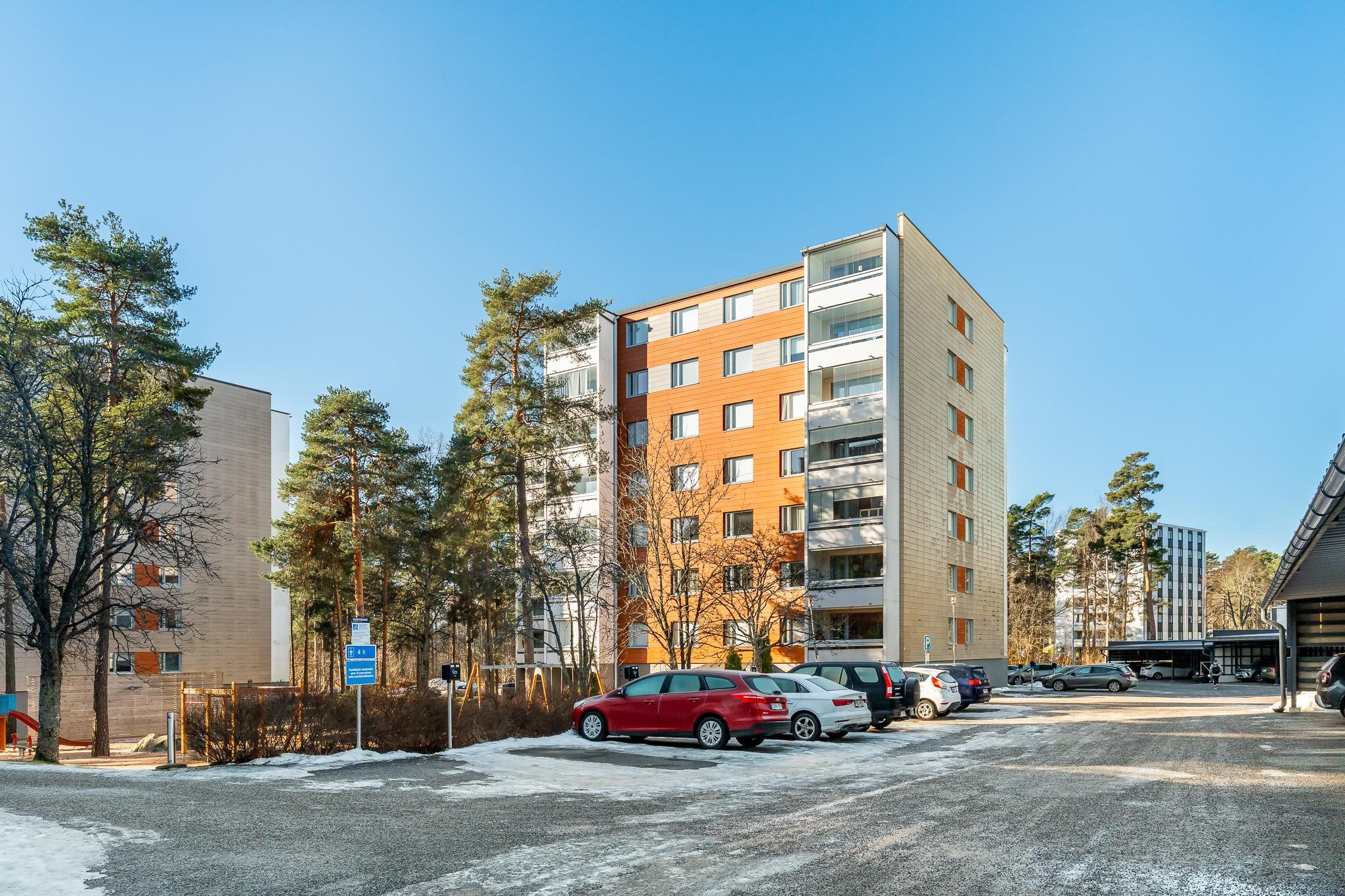 - Kulmahuoneistosta on ikkunat kahteen suuntaan. Keittiö on pohjoisen suuntaan. Olohuone, parveke ja makuuhuoneet ovat länteen. Avarat, osin metsäiset näkymät ikkunoista ja parvekkeelta.