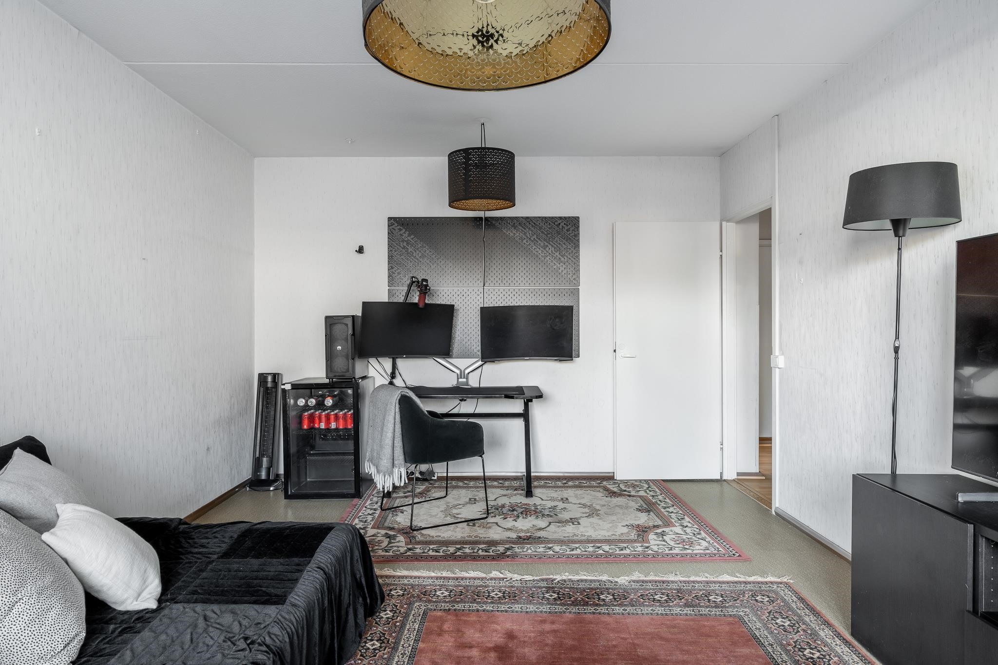 Keittiö: laminaattilattia, maali ja välitilalaatta. Olohuone: muovimatto (ap), tapetti. Makuuhuone 1: laminaattilattia (tehty muovimaton päälle), maali ja DC-fixi. Makuuhuone 2: laminaattilattia, (tehty muovimaton päälle), maali. Kylpyhuone: laatta, laatta. Eteinen: laminaatti, maali. Wc: laatta, laatta.