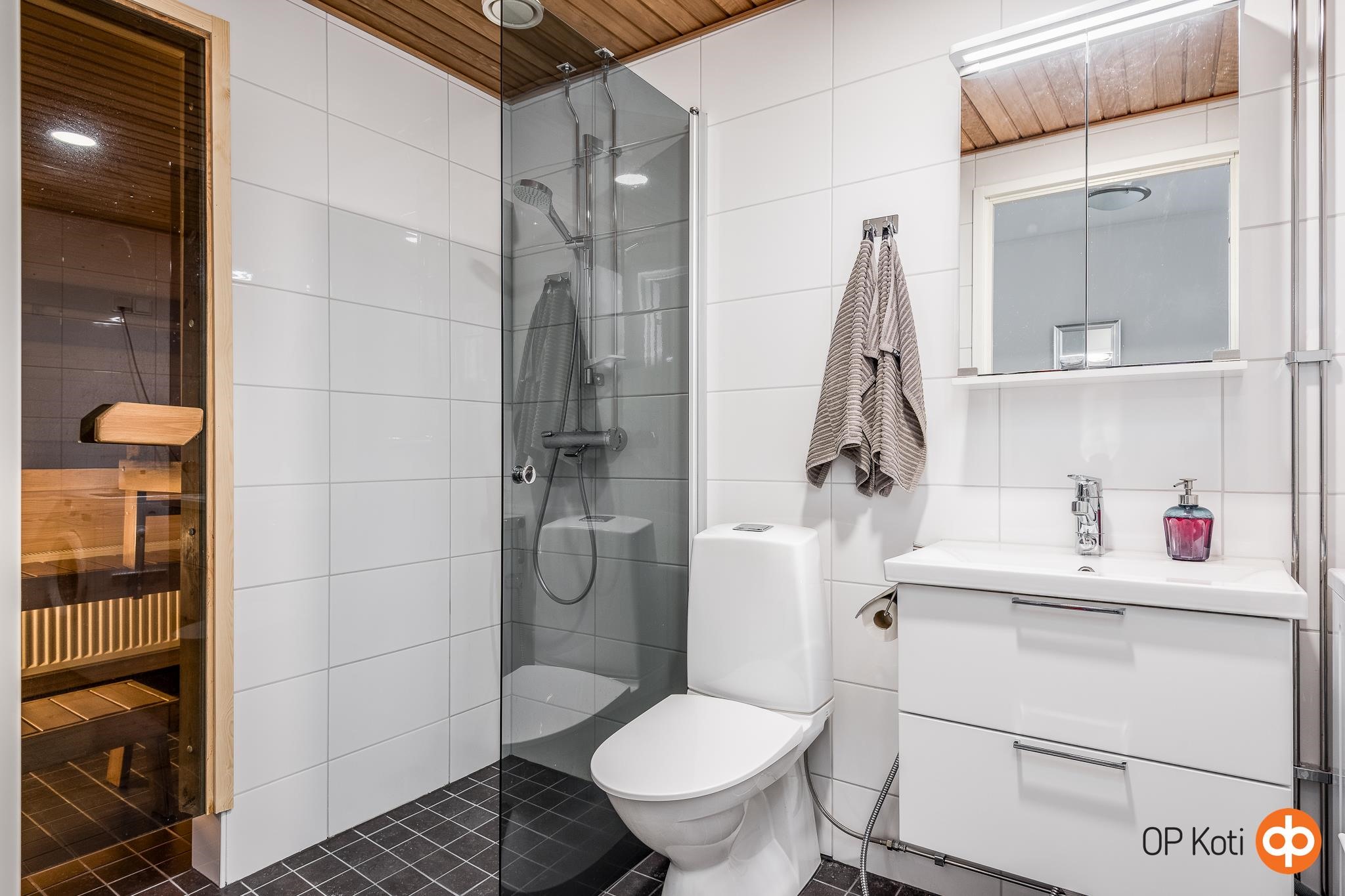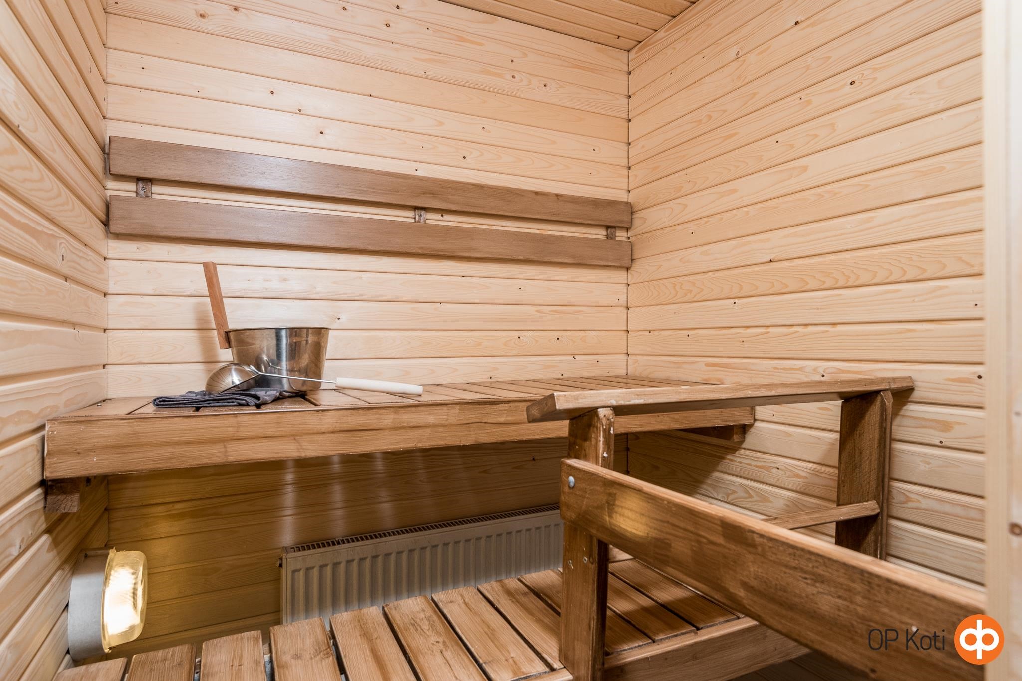 - Sauna, sähkökiuas, kylpyhuone, erillinen wc, suihku, suihkuseinä suihkuseinä, kääntyvä malli, peilikaappi kh:ssa ja wc:ssä, allaskaappi kh:ssa, pesukoneliitäntä kkh:ssa, kiinteät valaisimet, vesikiertoinen pyyhekuivain kylpyhuoneessa. Sauna ja kylpyhuone on uusittu täysin toukokuussa 2025 ammattiliikkeen toimesta (Rakennusinssi Oy).