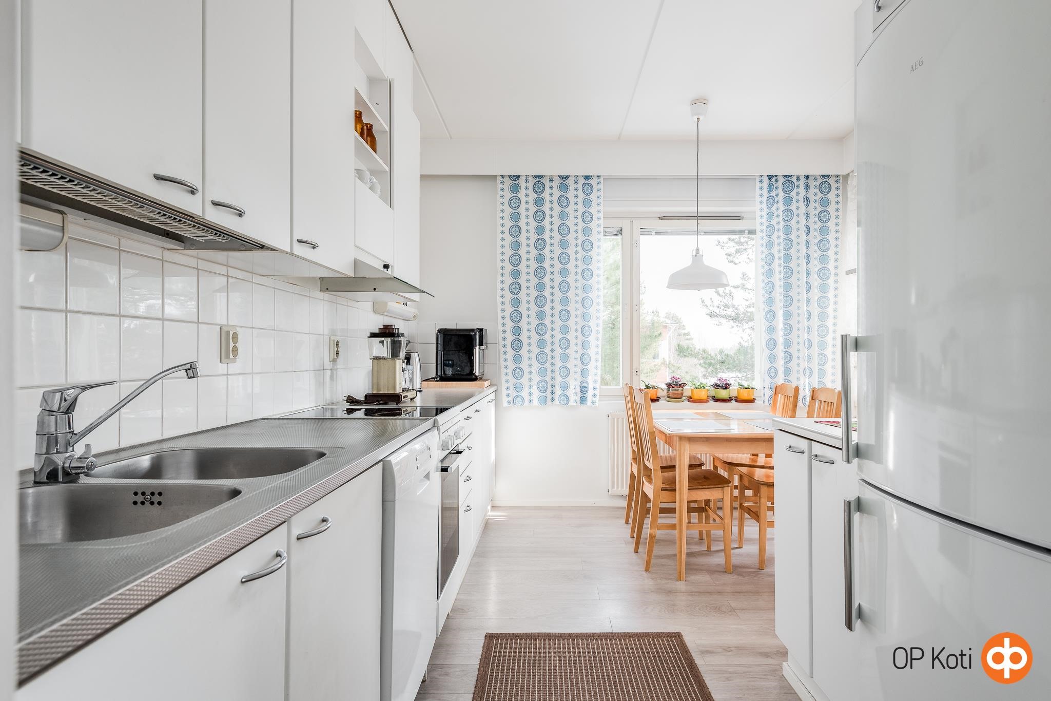 - Jääkaappipakastin uusittu 2019, merkki AEG, keraaminen liesi uusittu 2019, merkki AEG, liesituuletin, astianpesukone uusittu 2019, merkki AEG, kaapistot valkeat sileäpintaiset ovet, kiinteät valaisimet.