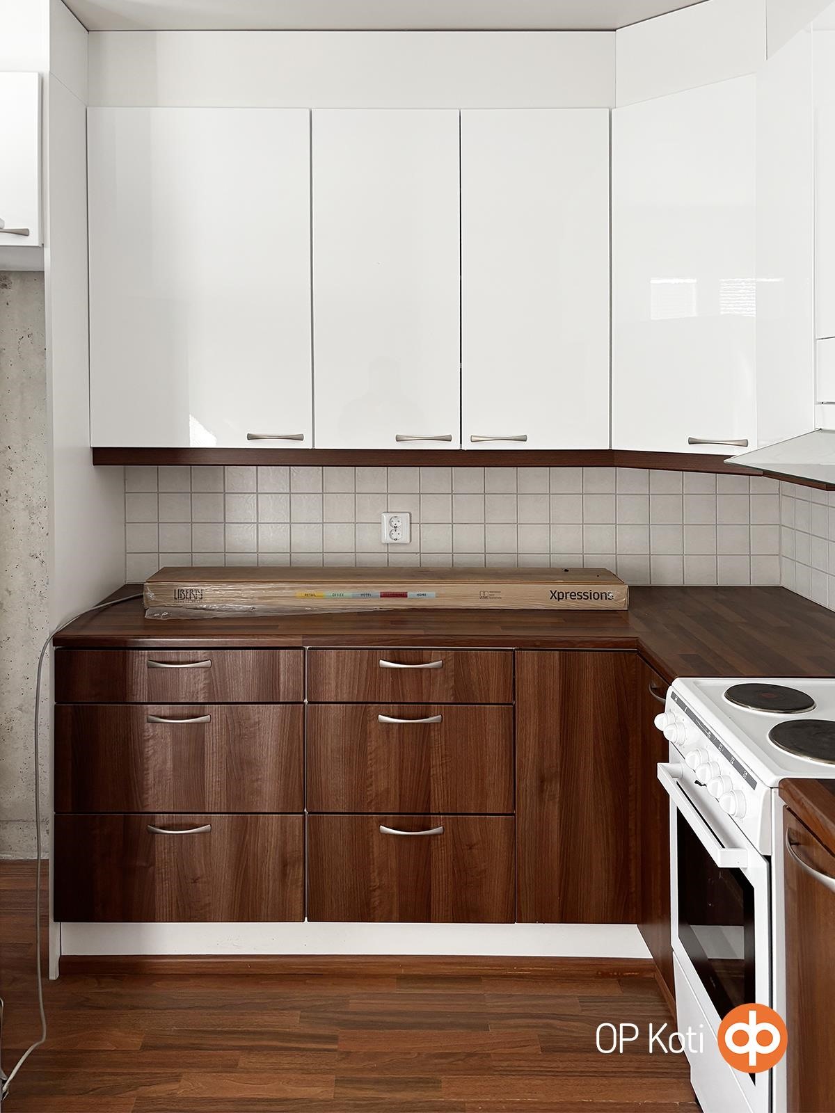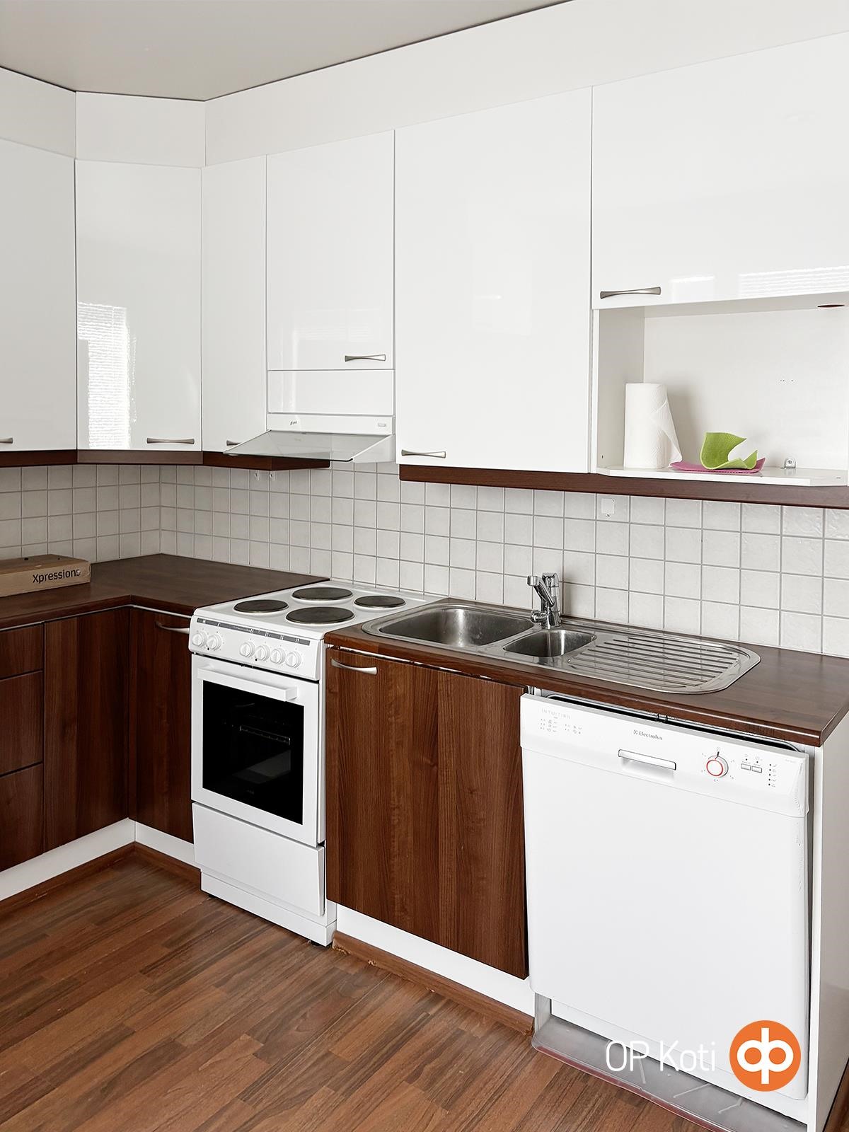 - Jääkaappipakastin, sähköliesi, liesikupu, astianpesukone, kaapistot, kiinteät valaisimet.