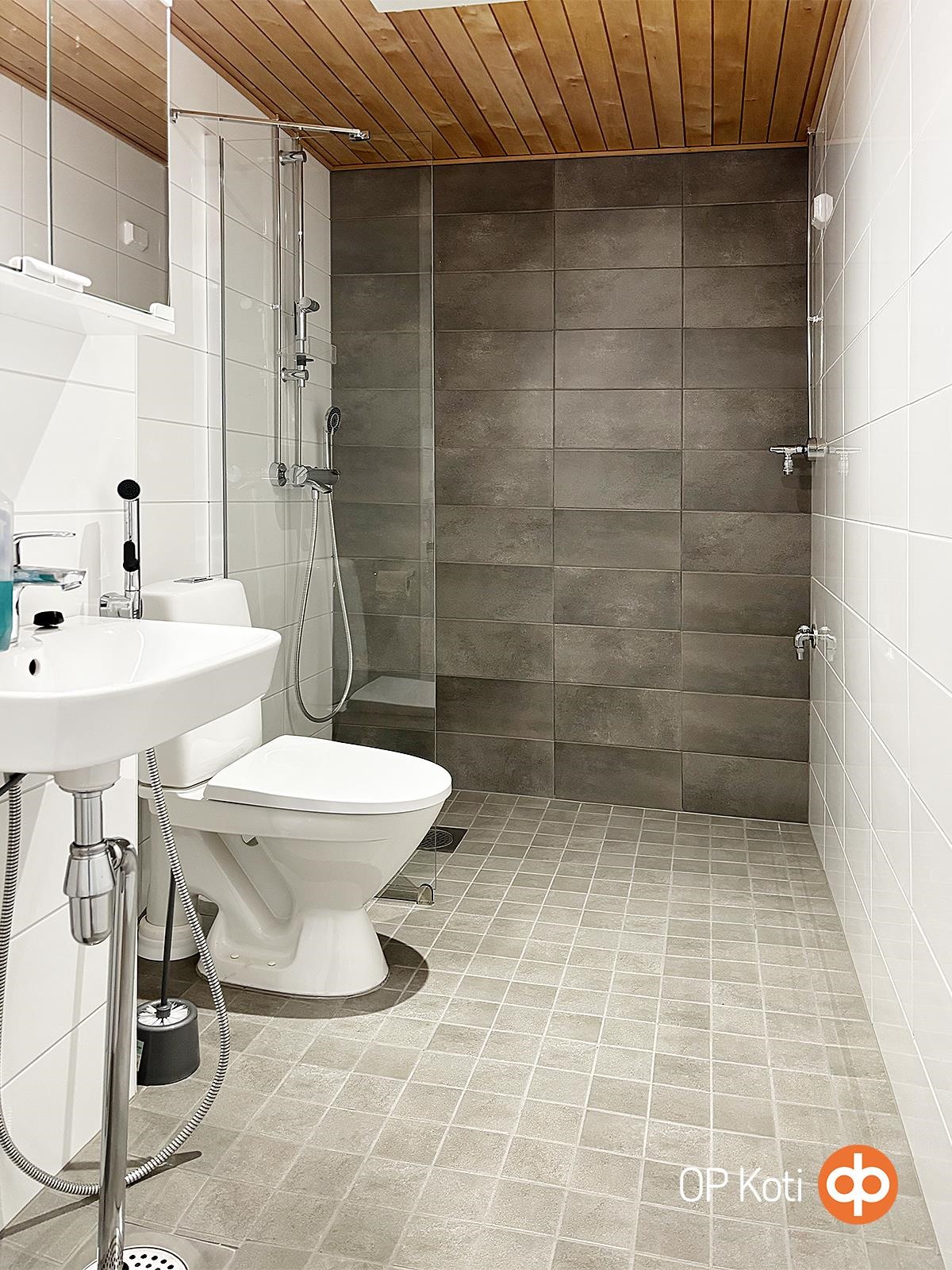- Kylpyhuone, suihku, suihkuseinä, peilikaappi, pesukoneliitäntä, kiinteät valaisimet.