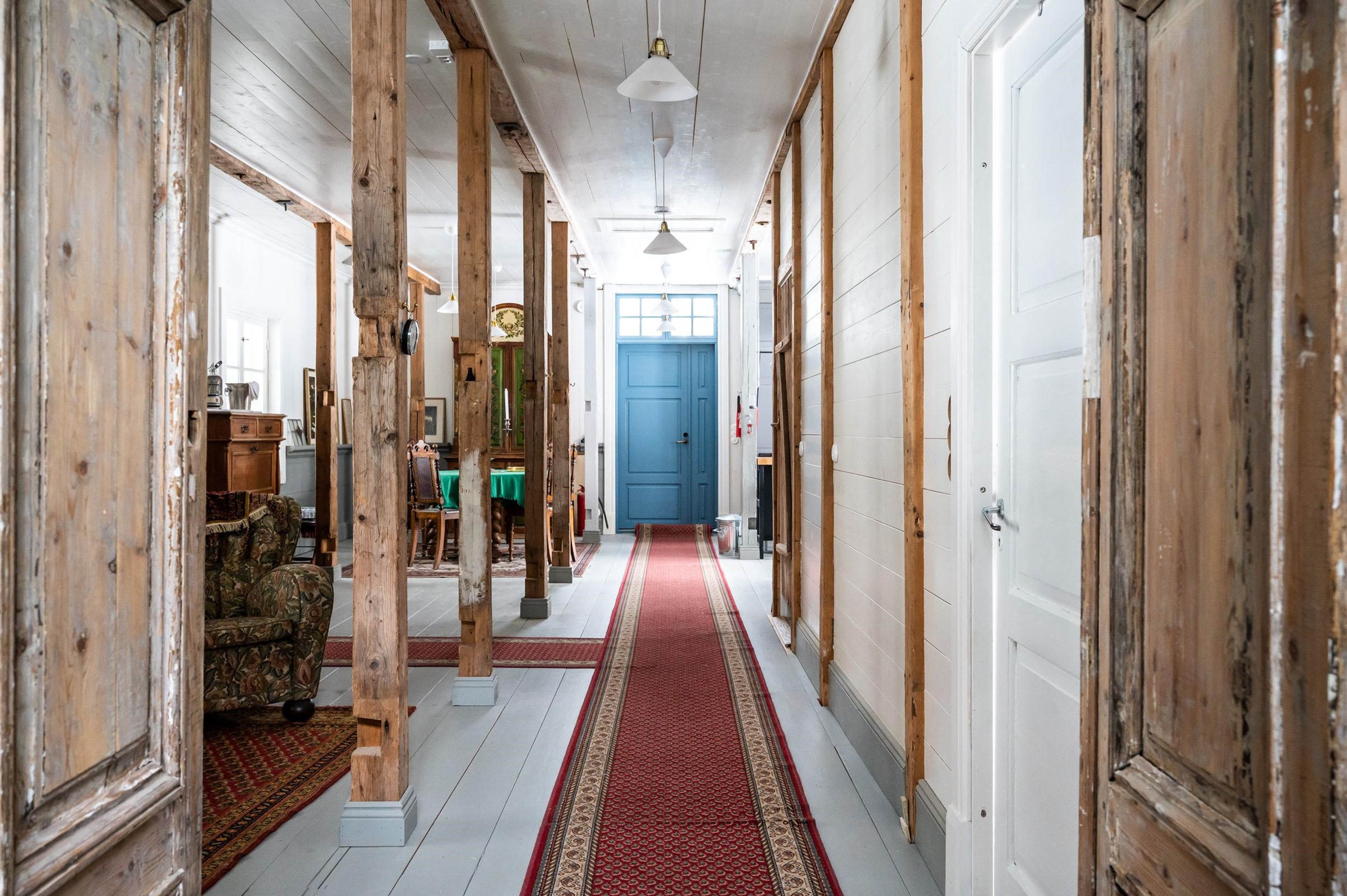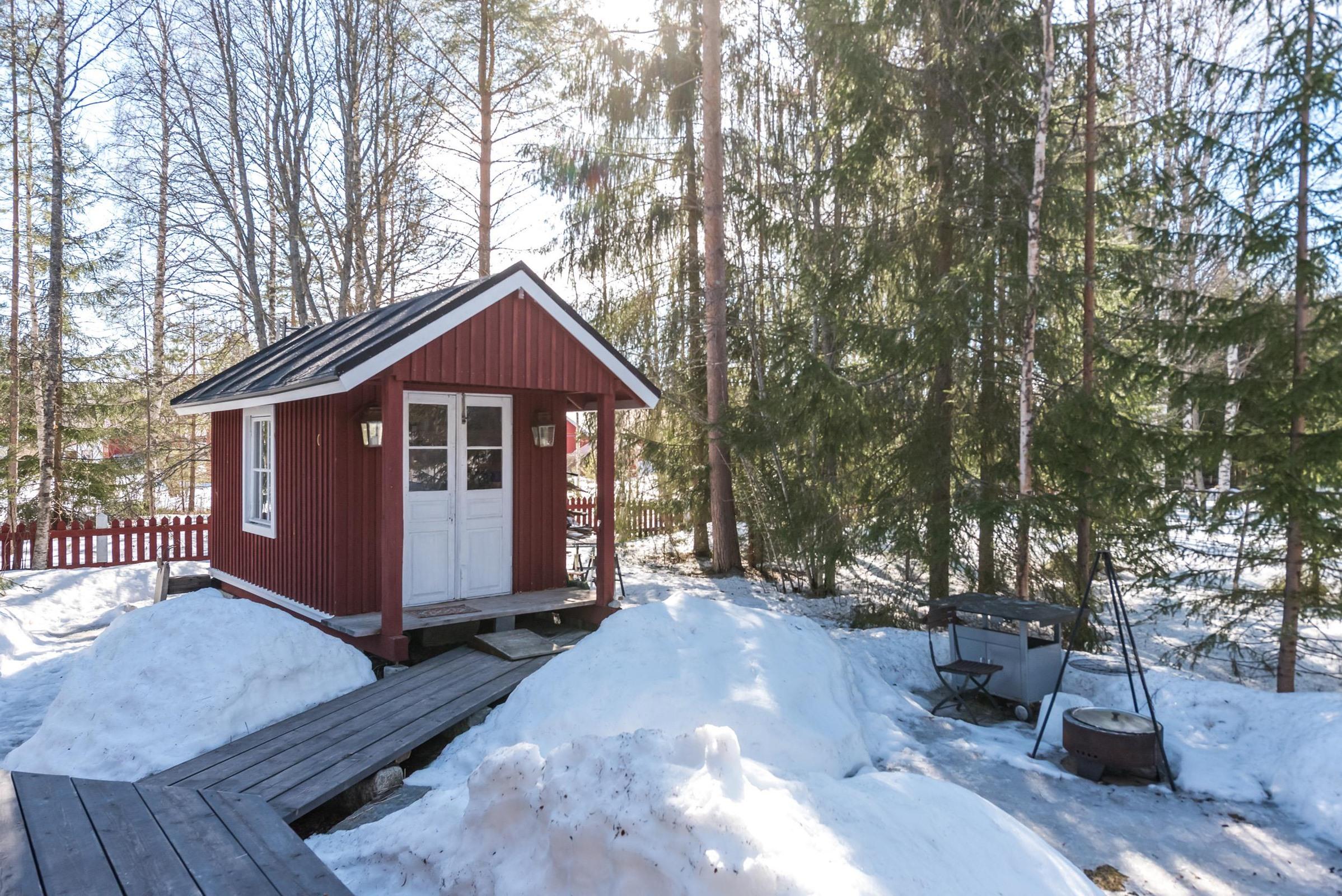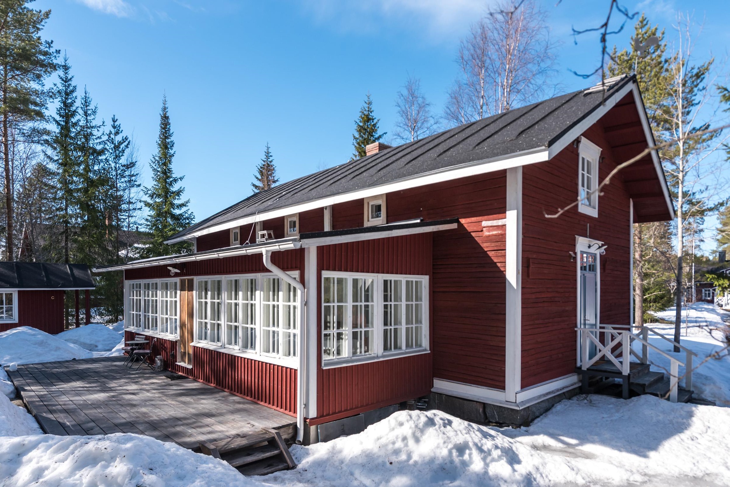 Upea punainen hirsitalo, jossa historia ja nykyaika kohtaavat.