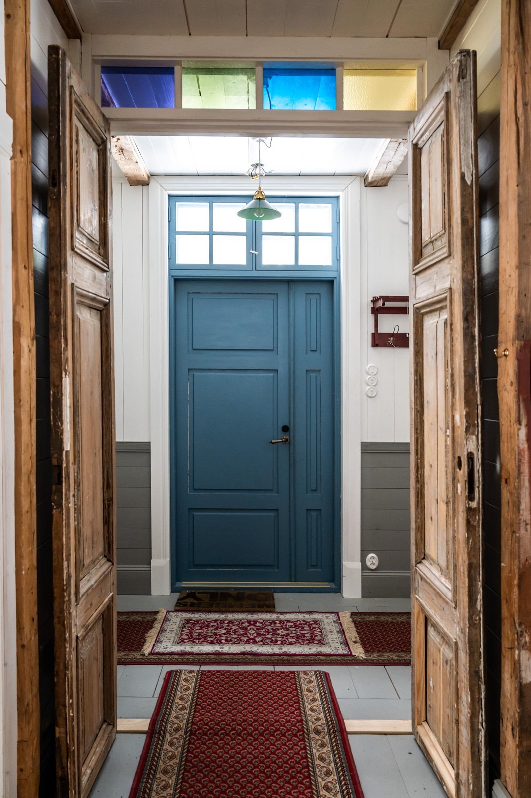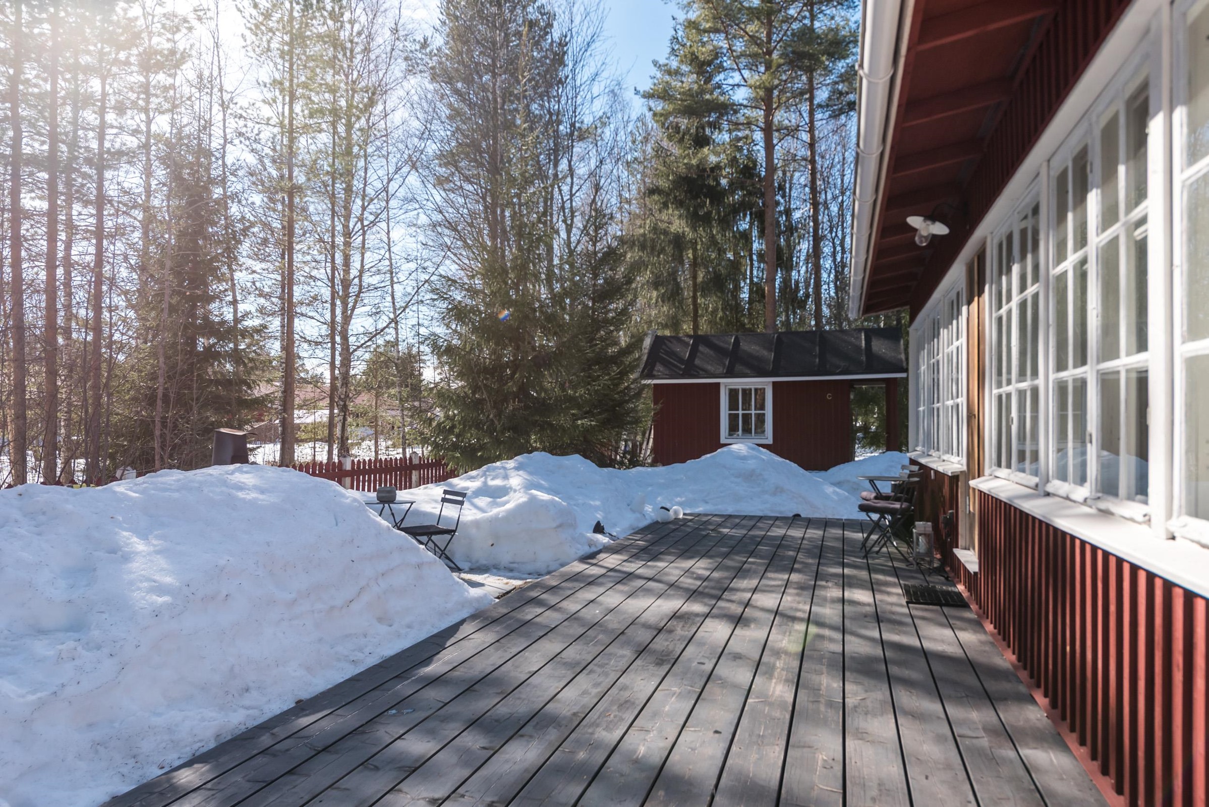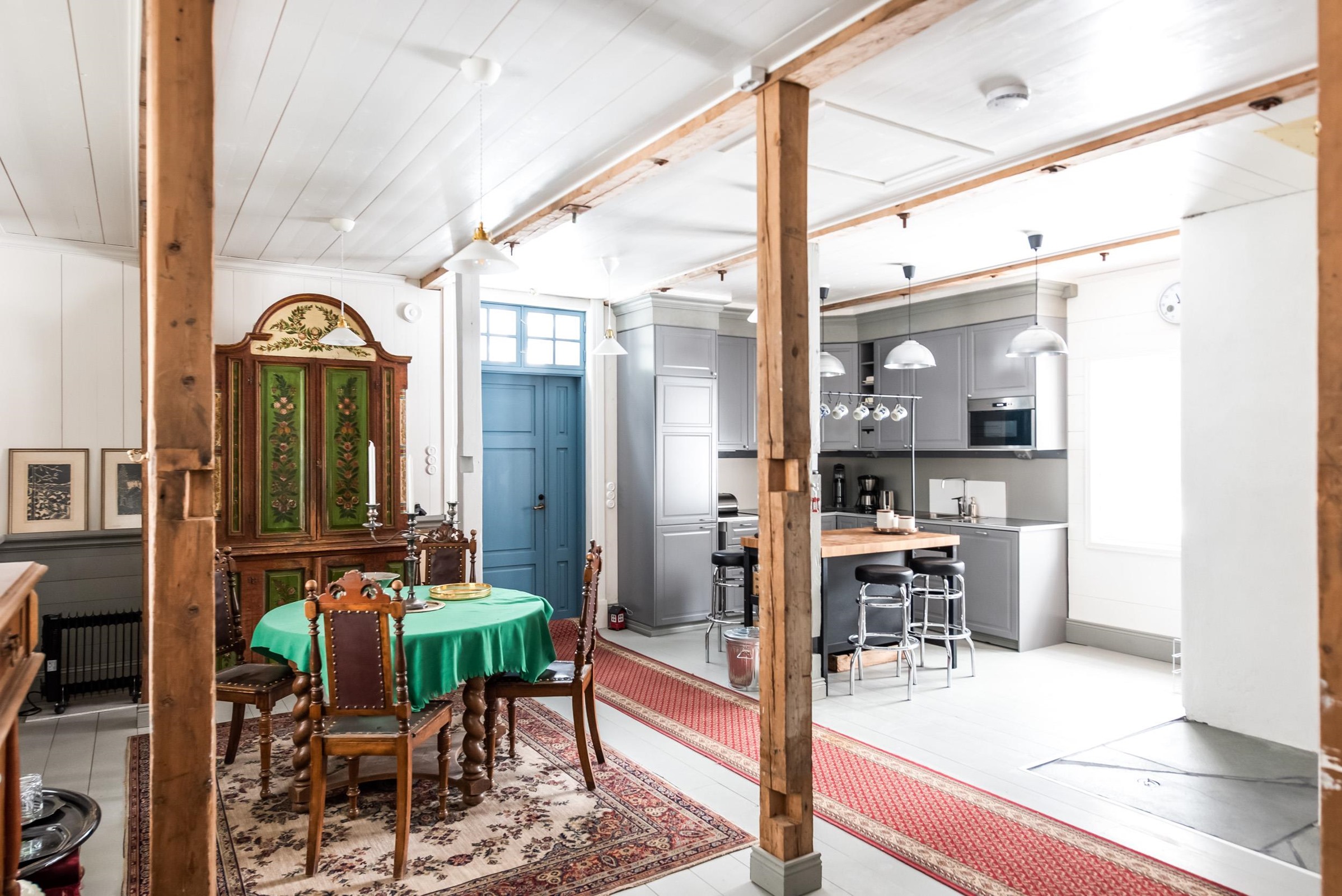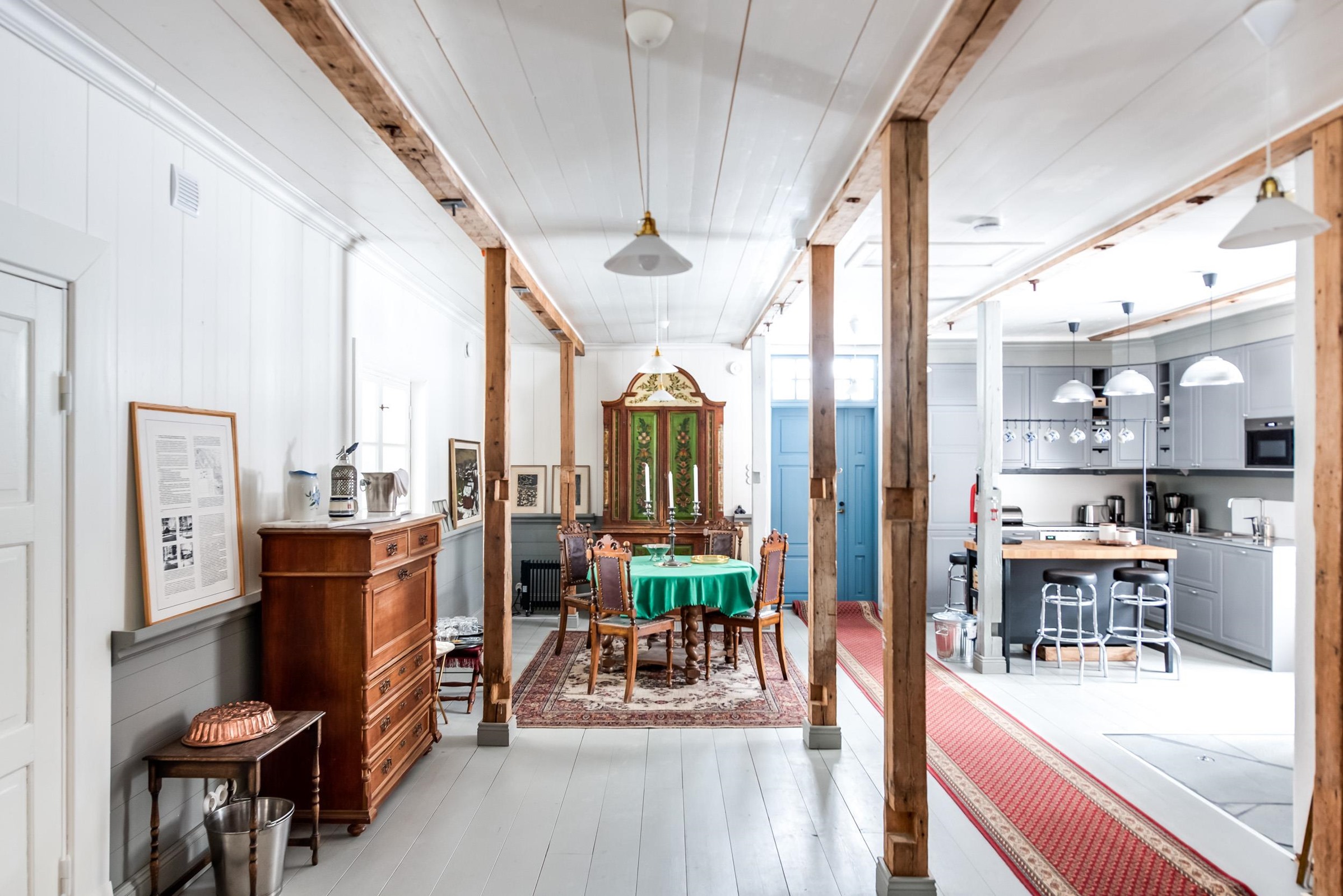 Upea punainen hirsitalo, jossa historia ja nykyaika kohtaavat.