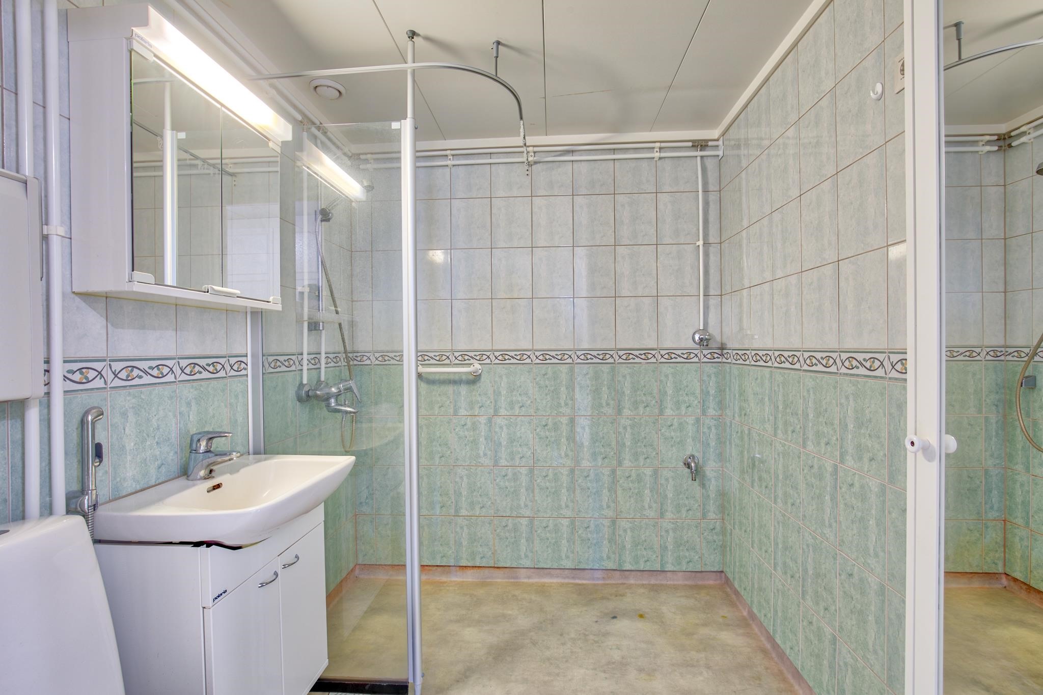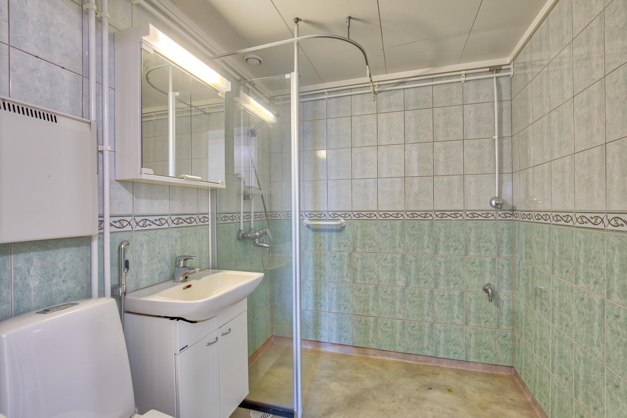 - Kylpyhuone, suihku, peilikaappi, allaskaappi, pesukoneliitäntä, kiinteät valaisimet.