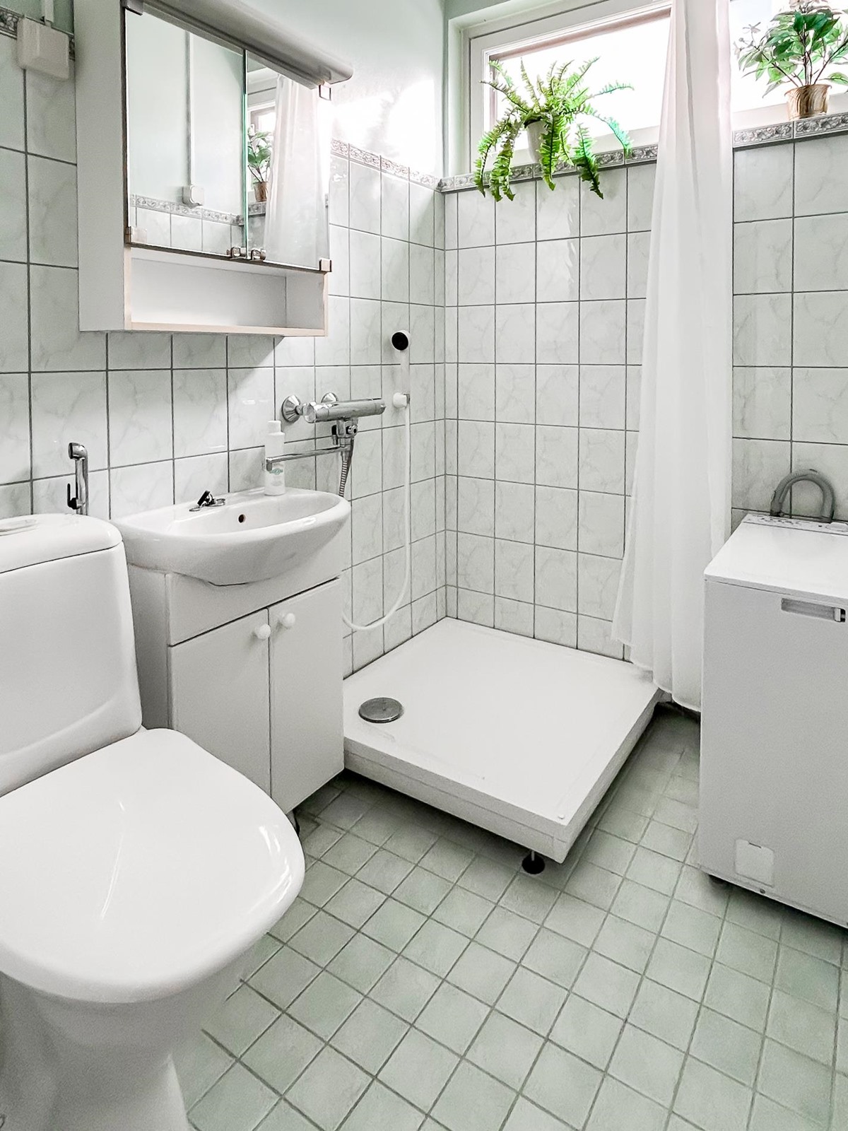 - Kylpyhuone, peilikaappi, pesukoneliitäntä, kiinteät valaisimet.