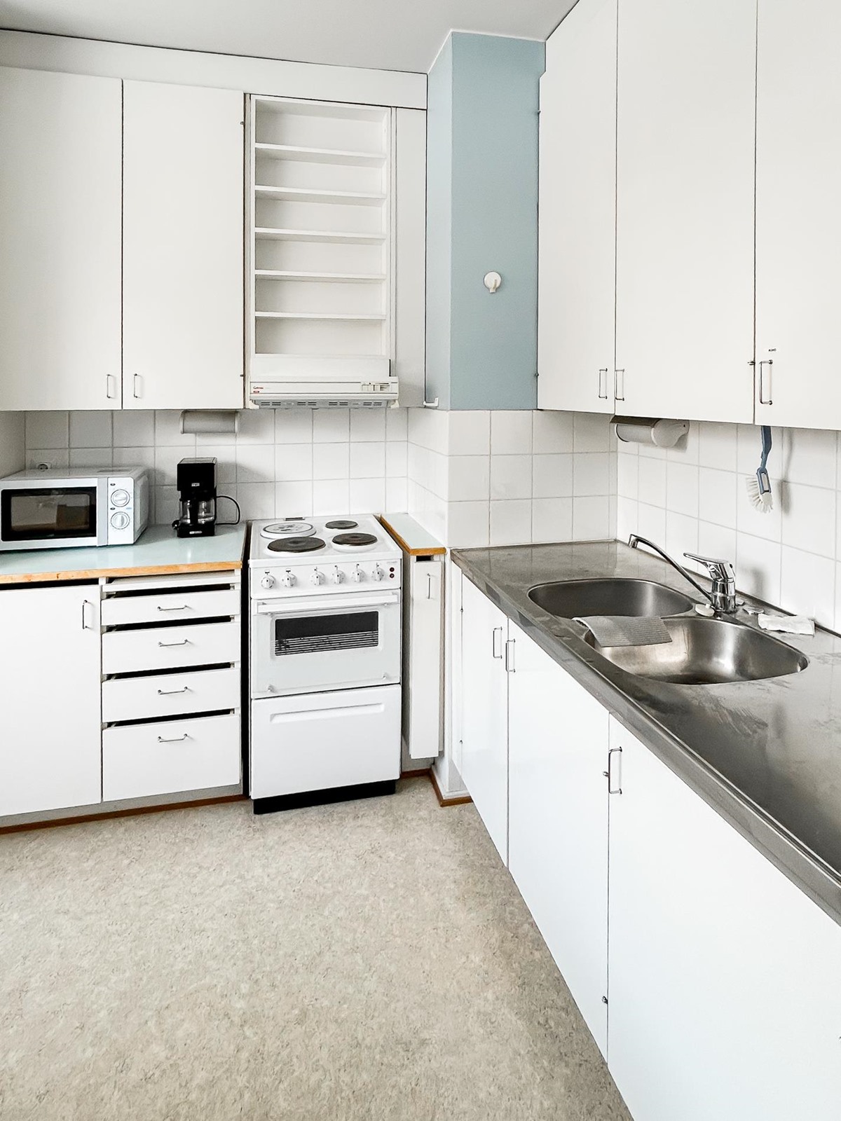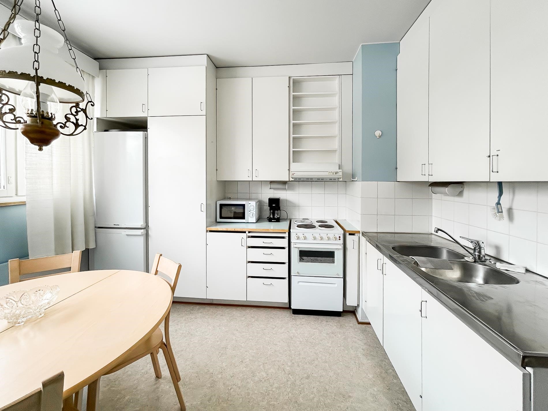 - Jääkaappi, pakastekaappi, sähköliesi, liesituuletin, kaapistot, kiinteät valaisimet.