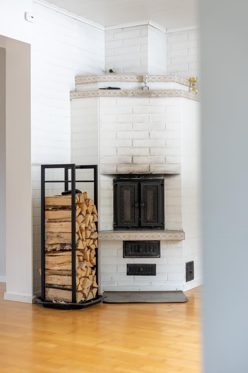 Varaava takka ja ilmalämpöpumppu niin asuinrakennuksessa kuin myös talousrakennuksessa pitävät asumiskustannukset kurissa ja tunnelman miellyttävänä ympäri vuoden.