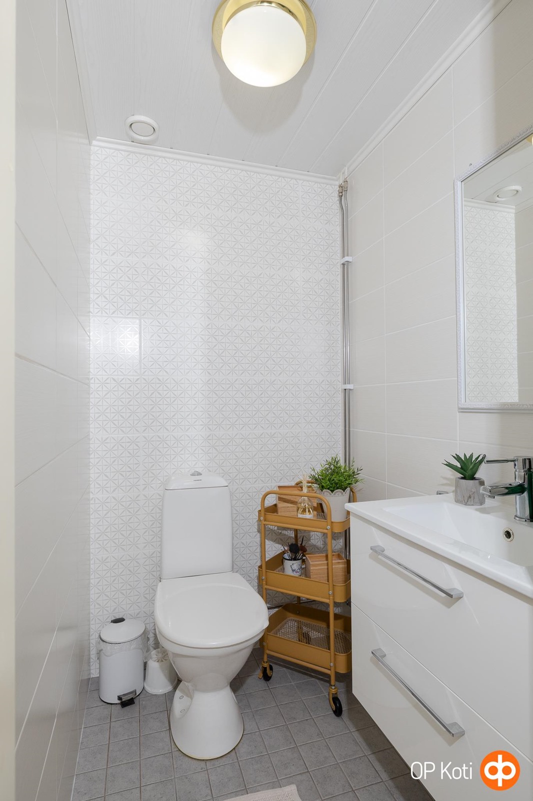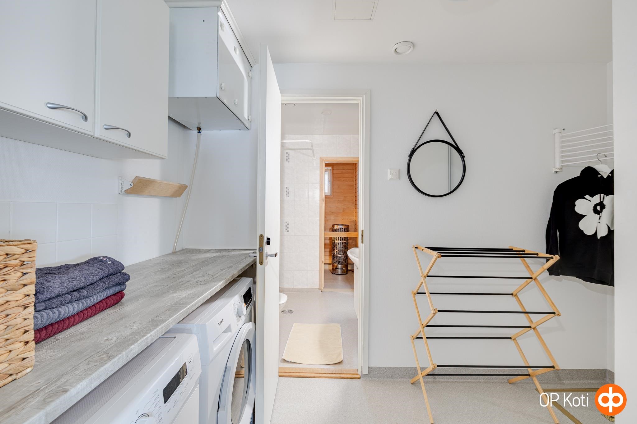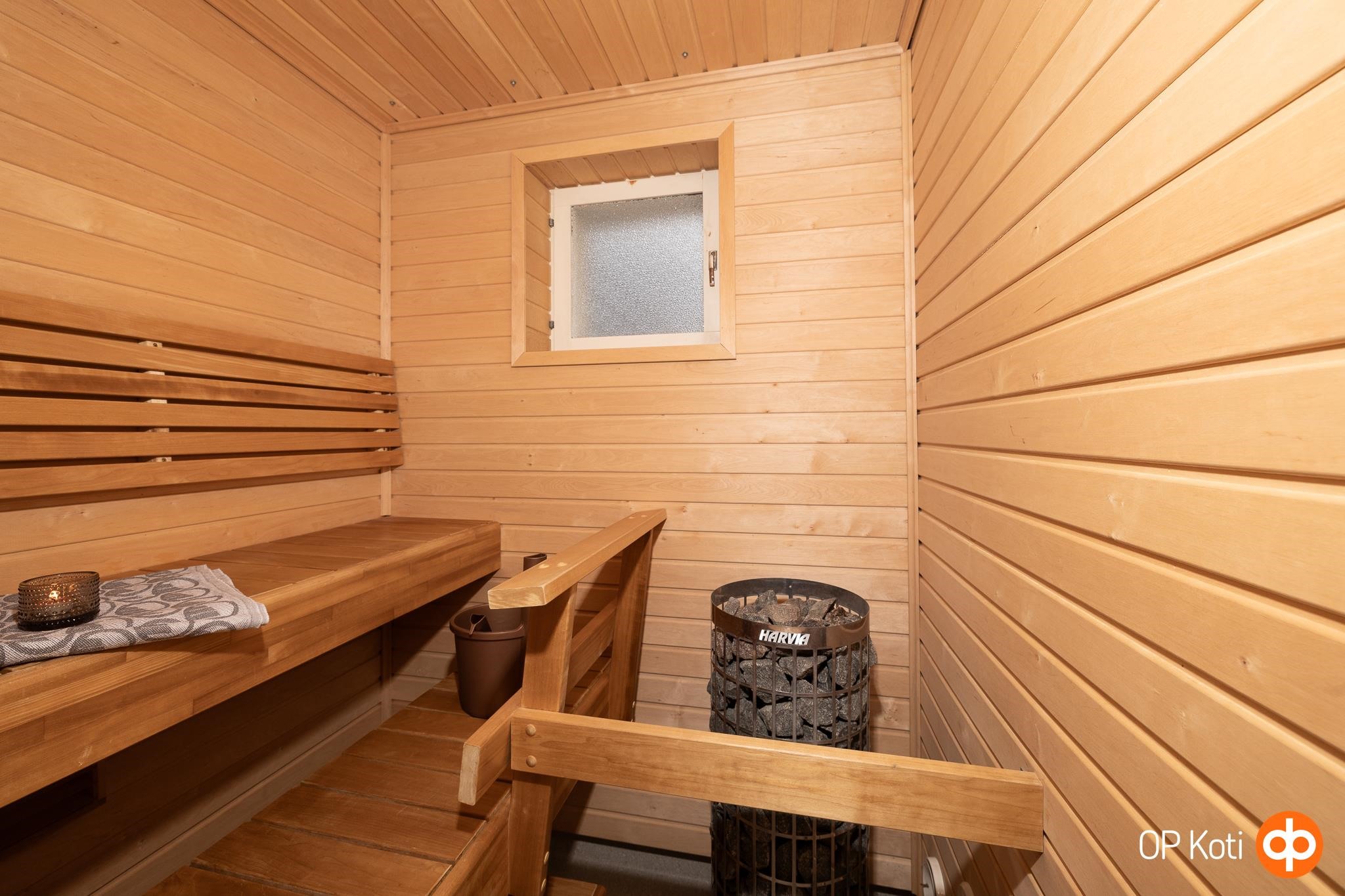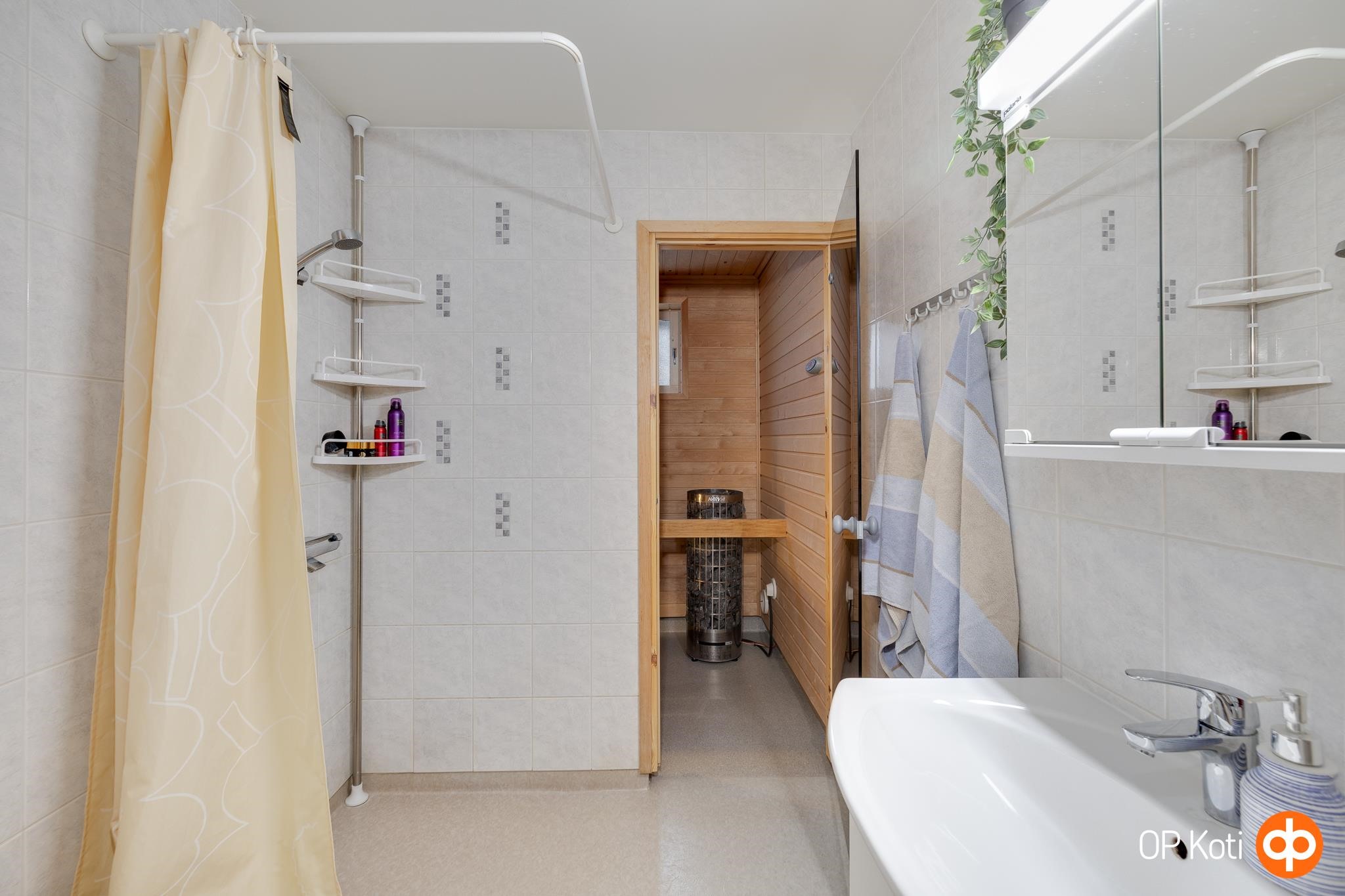 - Sauna, sähkökiuas, kylpyhuone, erillinen wc, suihku (-verho), peilikaappi, kaapit, allaskaappi, pesukoneliitäntä, lattialämmitys (kylpyhuoneessa), kiinteät valaisimet.