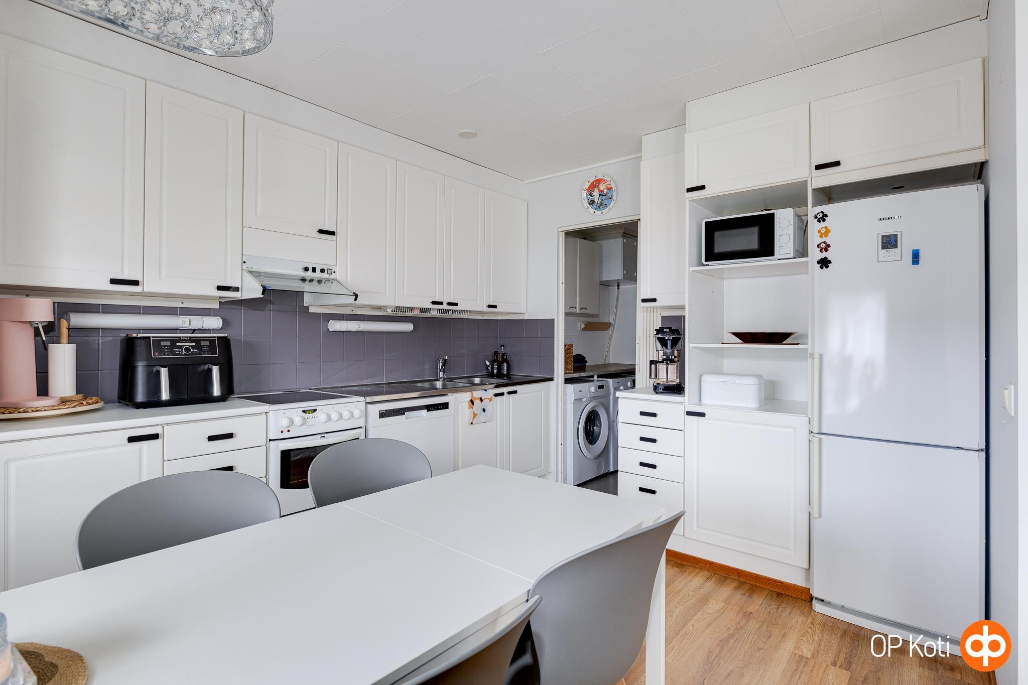 - Jääkaappipakastin, keraaminen liesi, liesituuletin, astianpesukone (2024), kaapistot, kiinteät valaisimet. Keittiökaapin ovet maalattu ja vetimet uusittu 2022. Kaakelit maalattu 2022.