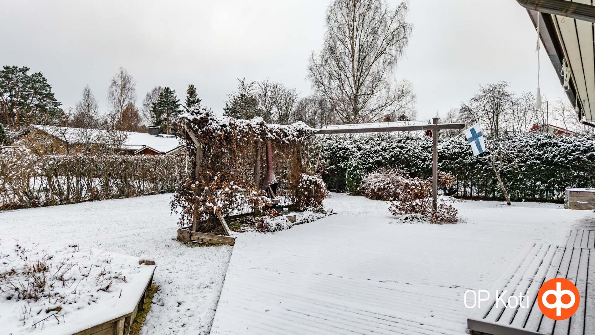 Pihapiiri on erityisen viehättävä ja tarjoaa runsaasti tilaa nauttia ulkoilmasta. Vehreältä pihalta löytyvät marjapensaat sekä omenapuut, jotka tuovat kesäisin satoa ja tunnelmaa.
