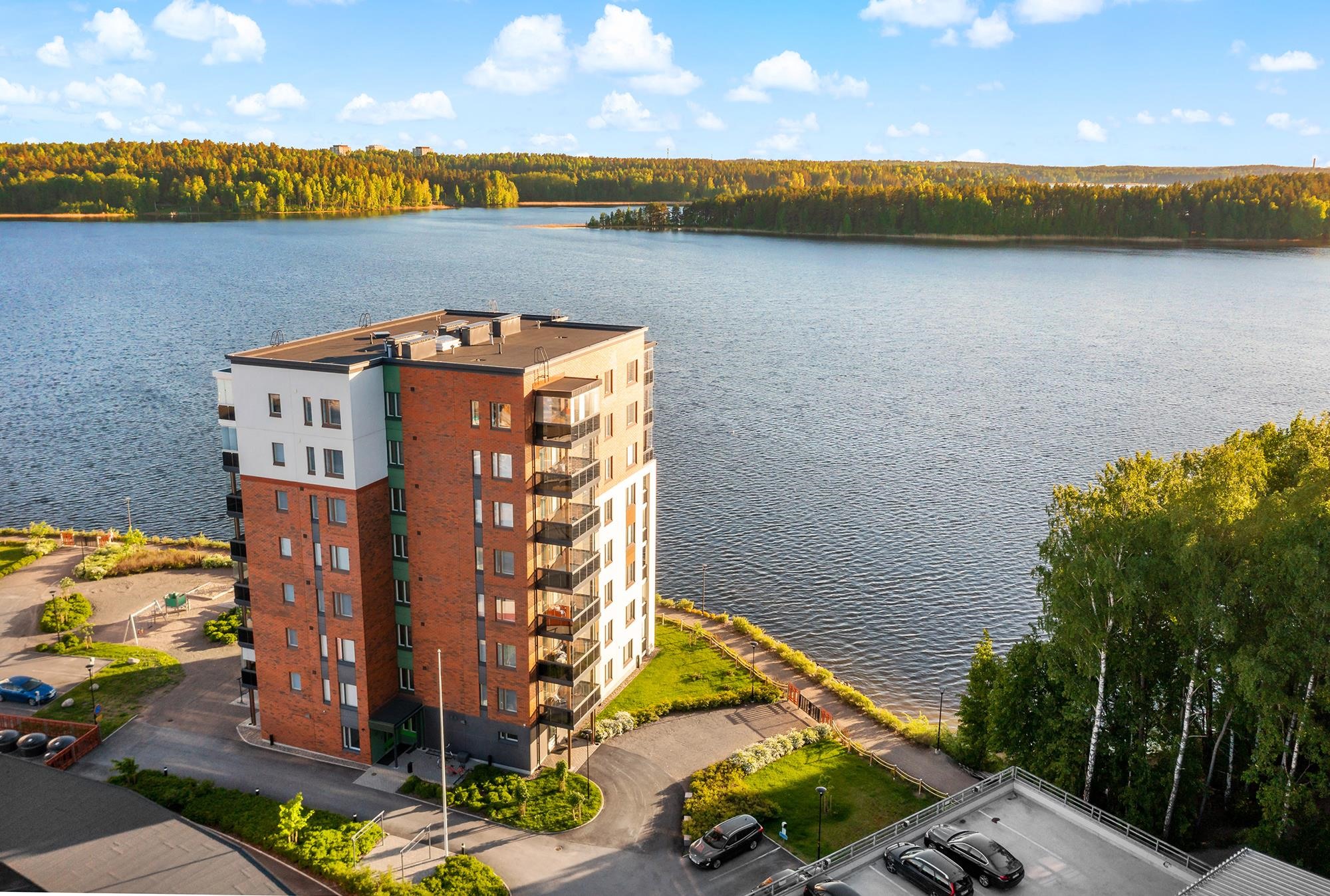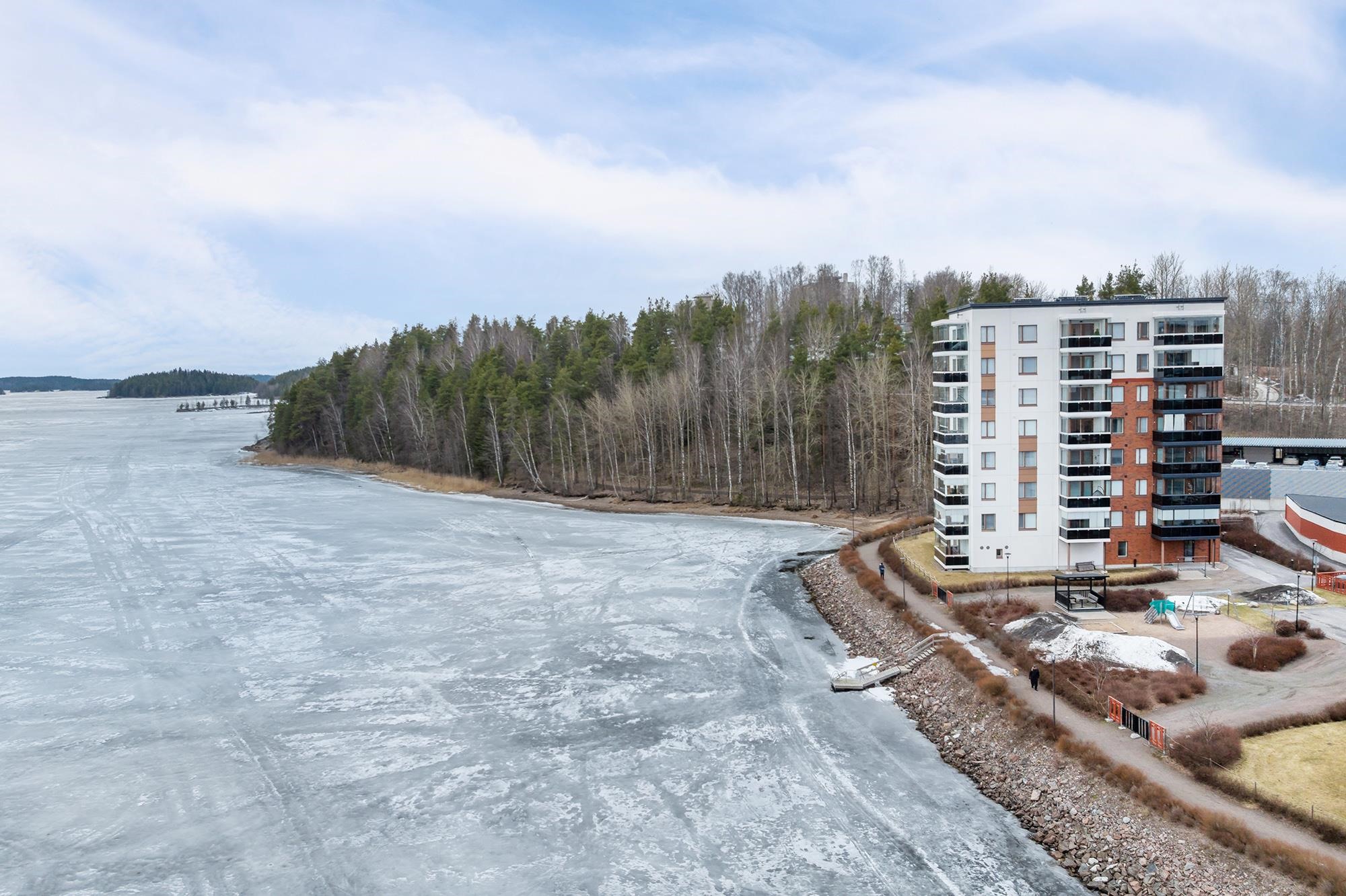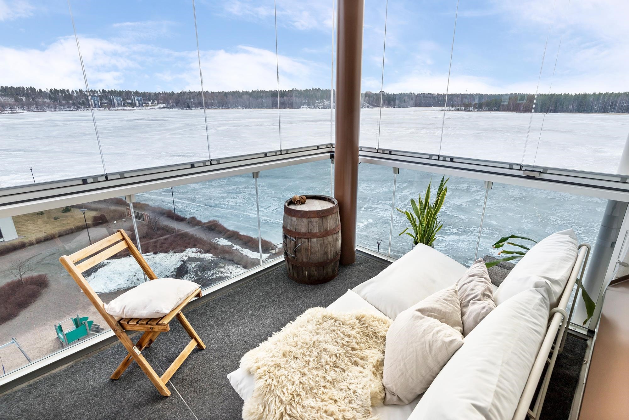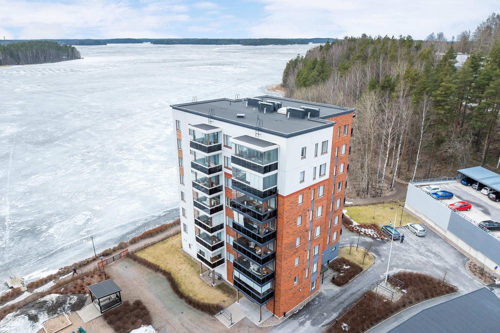 Viidennen kerroksen asunnosta avautuvat esteettömät näkymät suoraan Saimaalle, ja suuri lasitettu parveke tarjoaa täydellisen paikan nauttia järvimaisemasta vuoden ympäri.