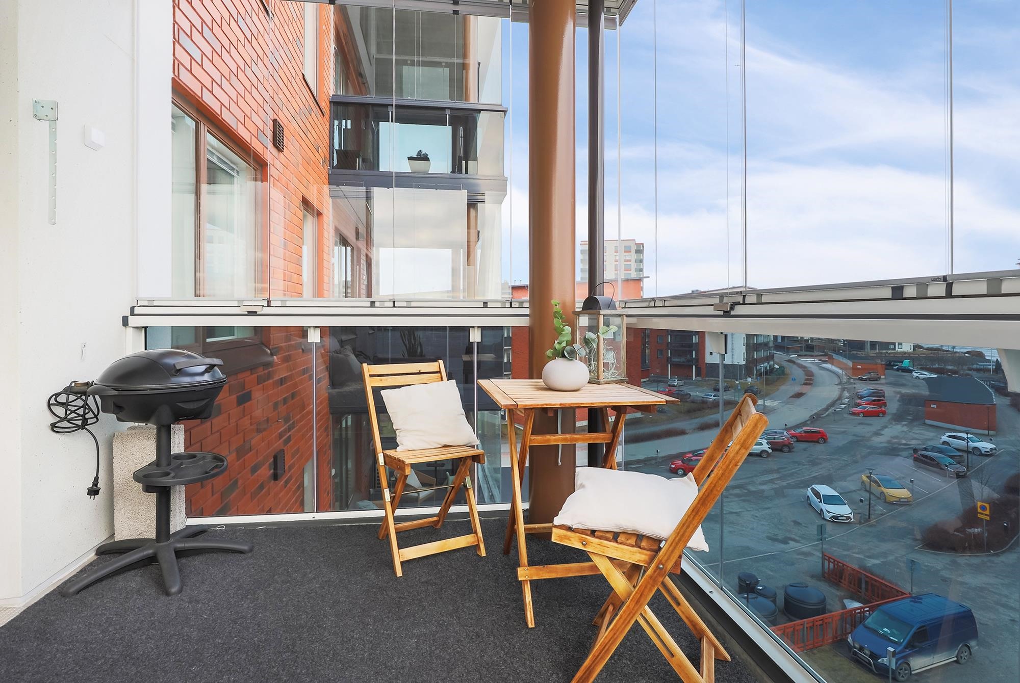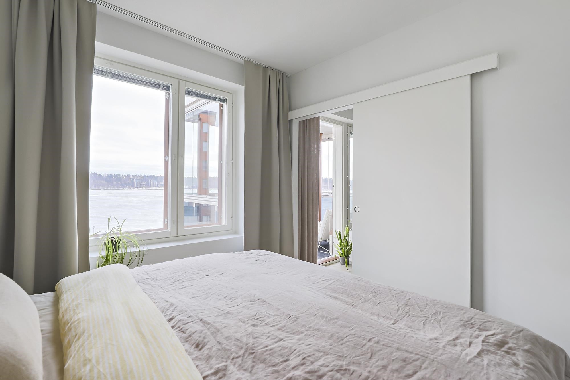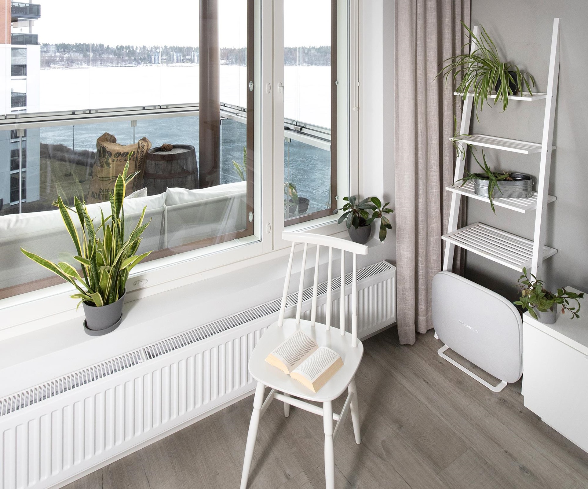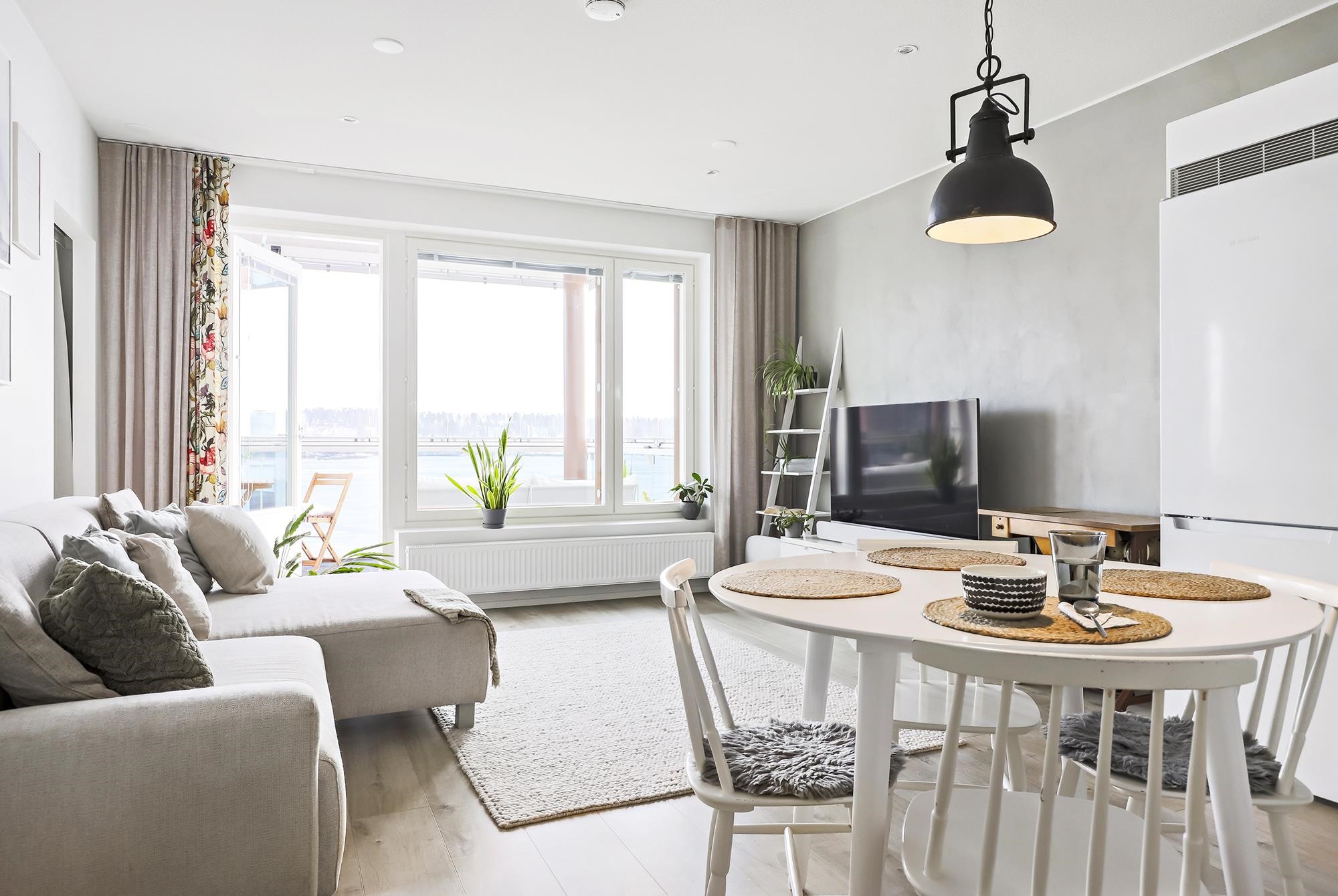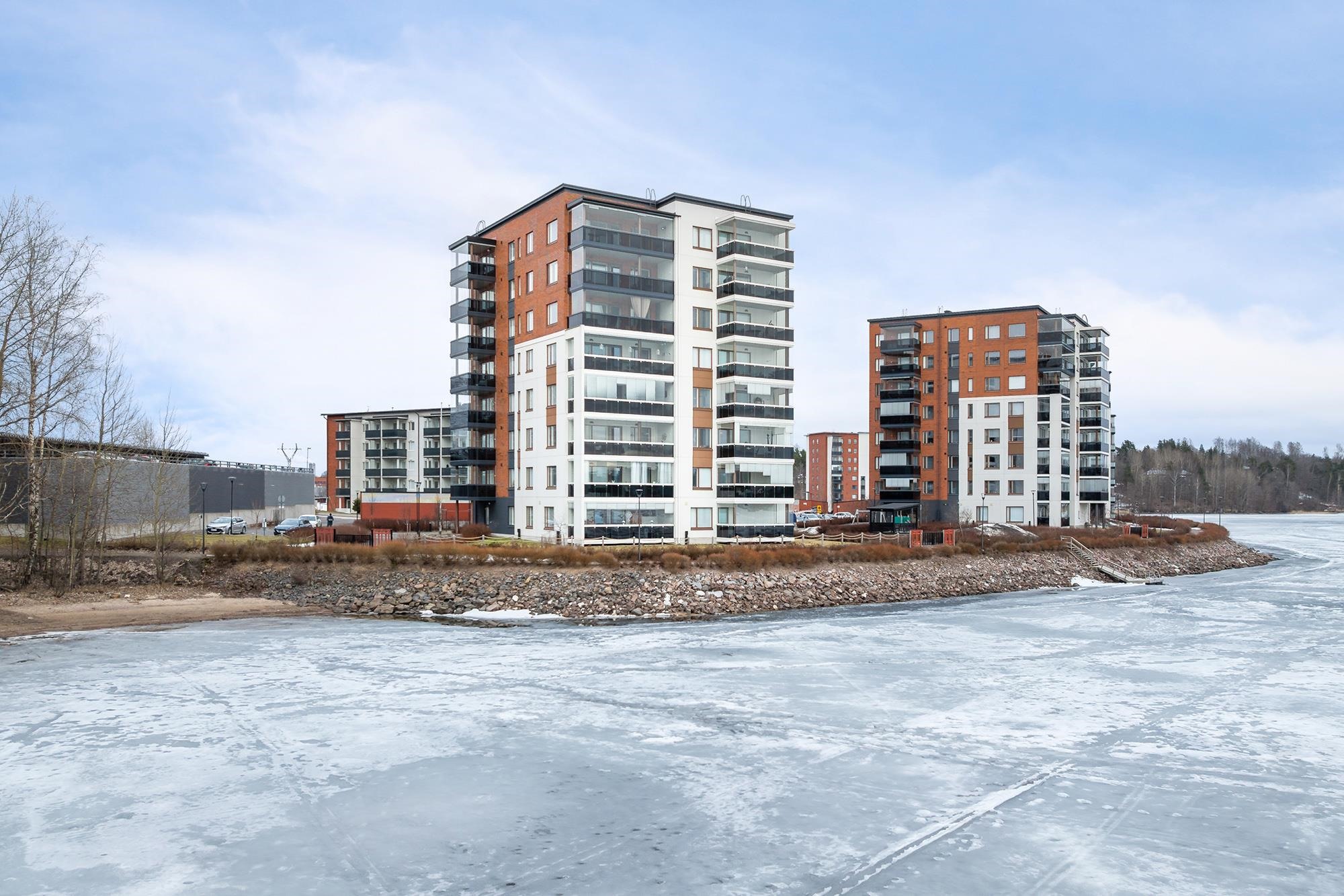 Viidennen kerroksen asunnosta avautuvat esteettömät näkymät suoraan Saimaalle, ja suuri lasitettu parveke tarjoaa täydellisen paikan nauttia järvimaisemasta vuoden ympäri.