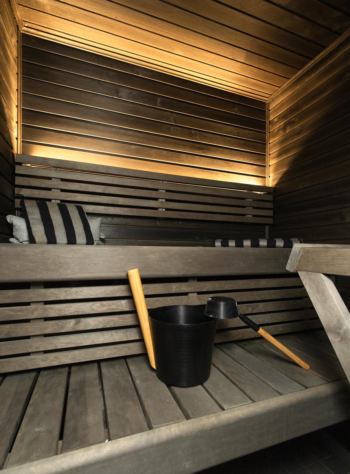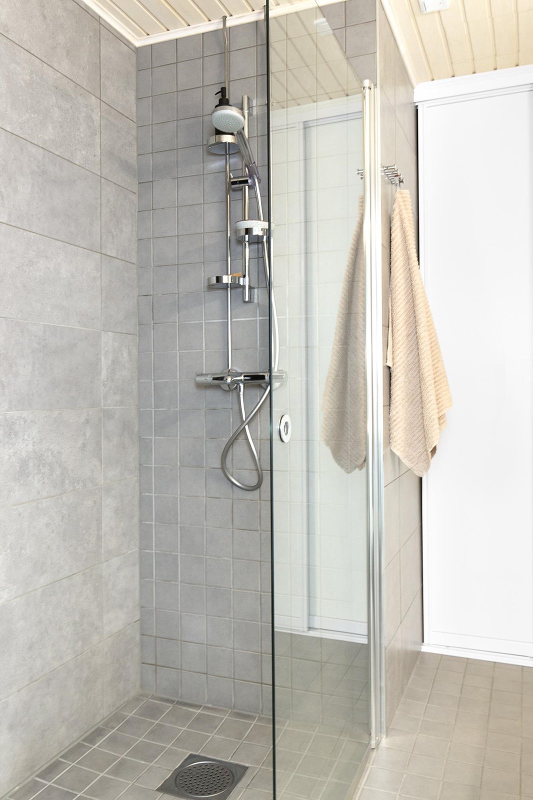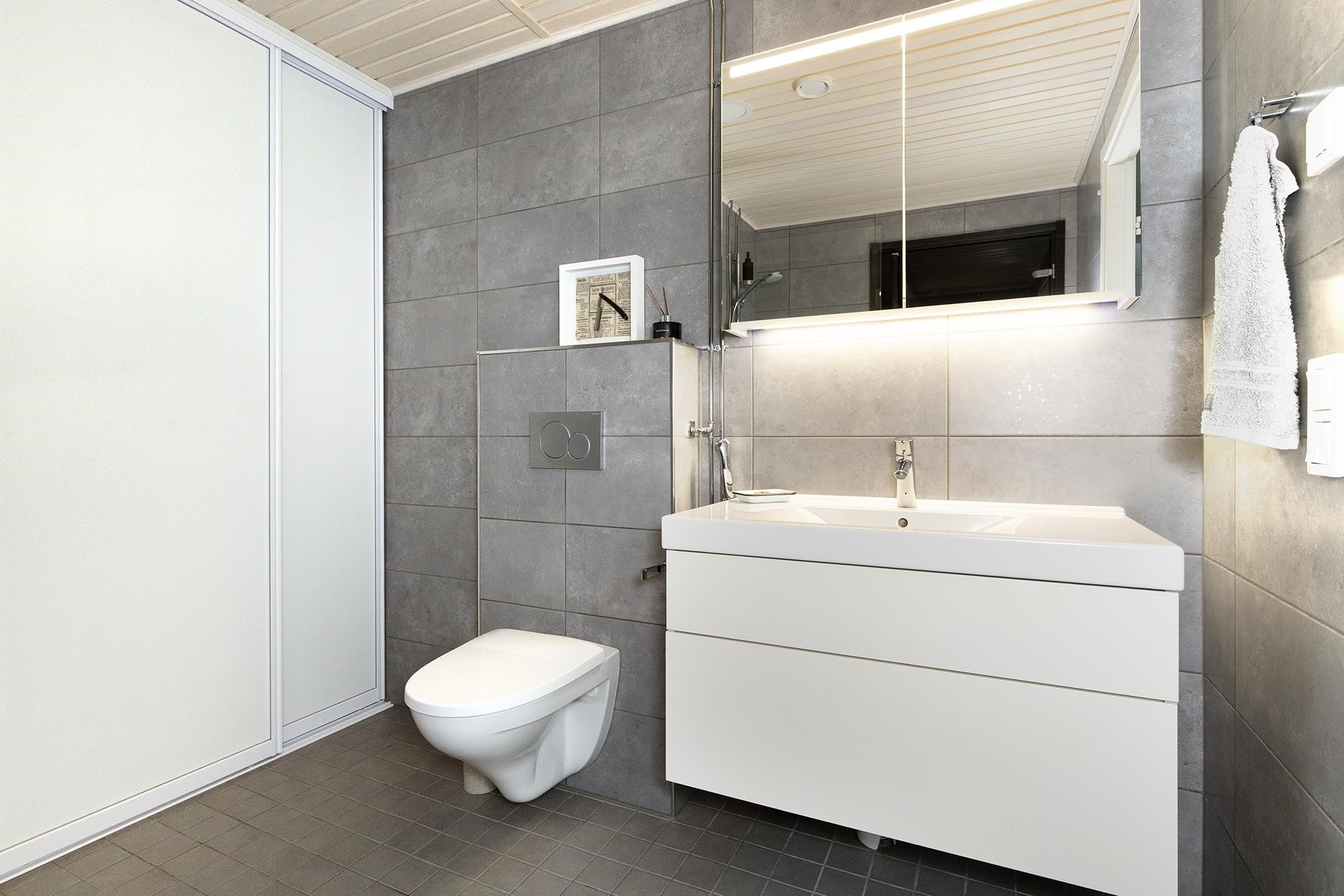 - Sauna Haapapanelointi; saunan seinät ja katto on sävytetty mustaksi, saunan lauteet, ritilä ja selkänojat harmaiksi., sähkökiuas, kylpyhuone, suihku, suihkuseinä, peilikaappi 90cm Ido, kaapit koko seinän levyinen kaapisto kylpyhuoneessa, jonne mahtuu pesukone ja kuivausrumpu ja runsaasti säilytystilaa, allaskaappi Ido, pesukoneliitäntä, lattialämmitys, kiinteät valaisimet Alaslasketuissa katoissa LED-valaisin, kehys valkoinen.