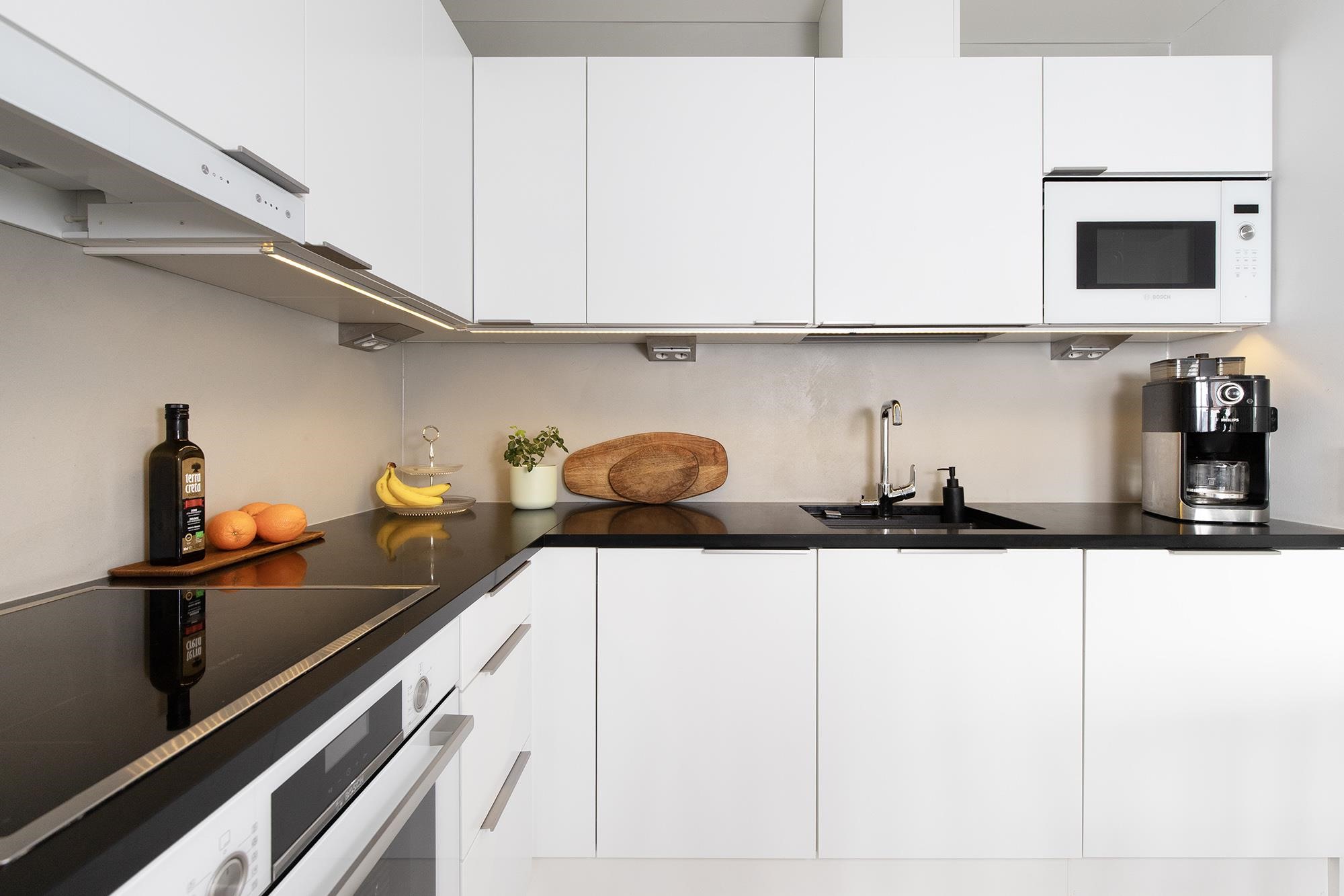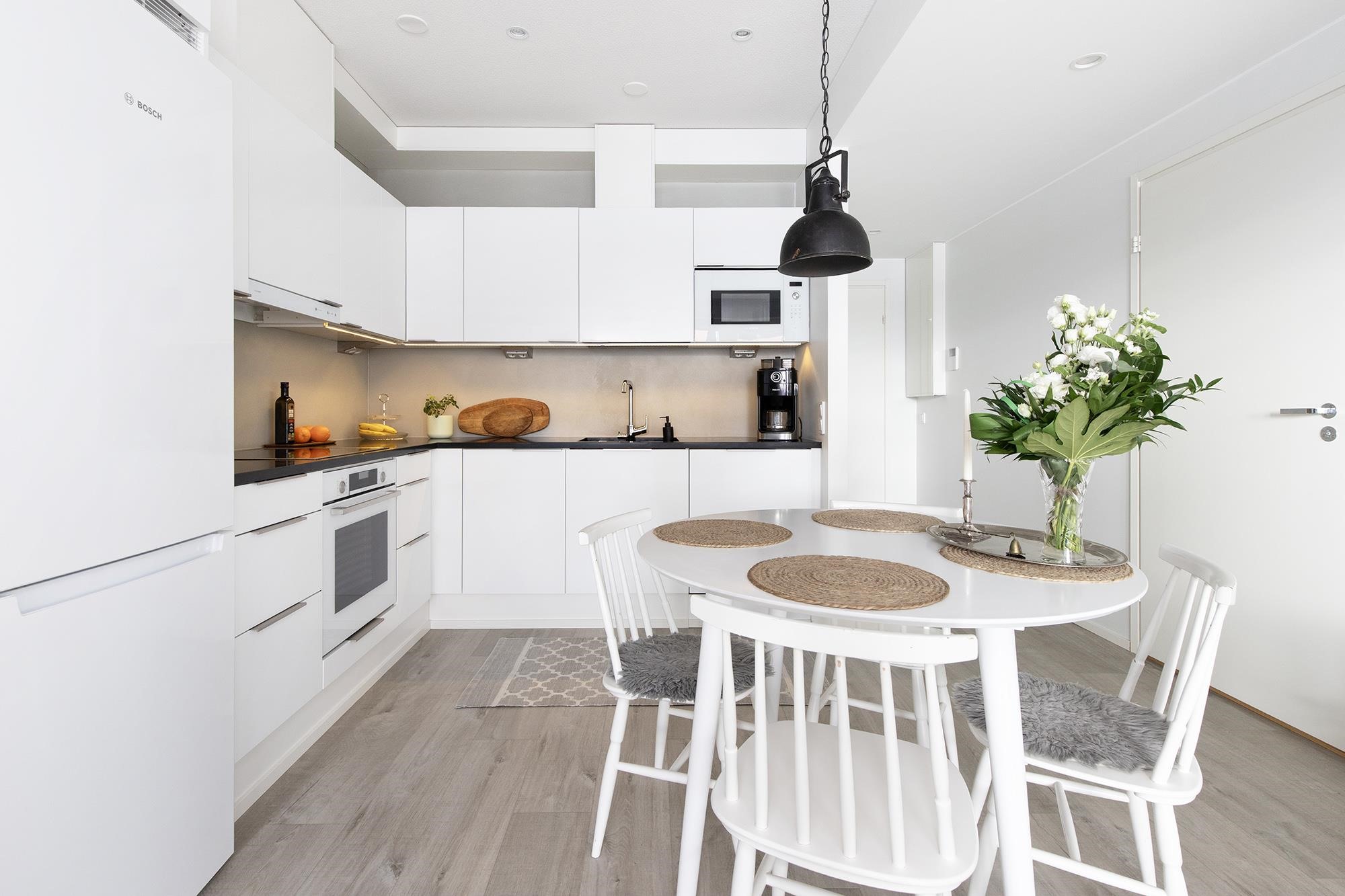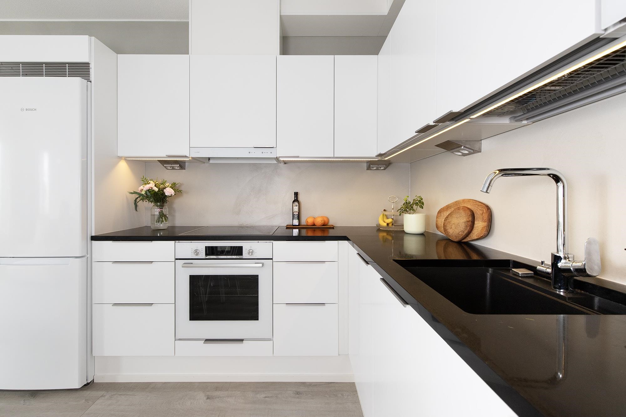 - Jääkaappipakastin KGN36NW30, Bosch, BSH, erillisuuni Bosch, induktioliesi 60cm, Bosch, liesituuletin, mikroaaltouuni Bosch, astianpesukone kalusteisiin sijoitettava, Bosch, kaapistot Novart Petra, sileä, valkoinen matta, kiinteät valaisimet. Keittiöallas Stala musta, alta asennettu kivitasoon. Kalusteväli Deco-Cire mikrosementti.