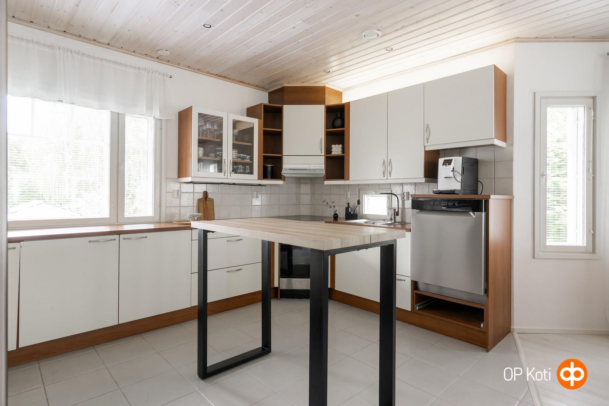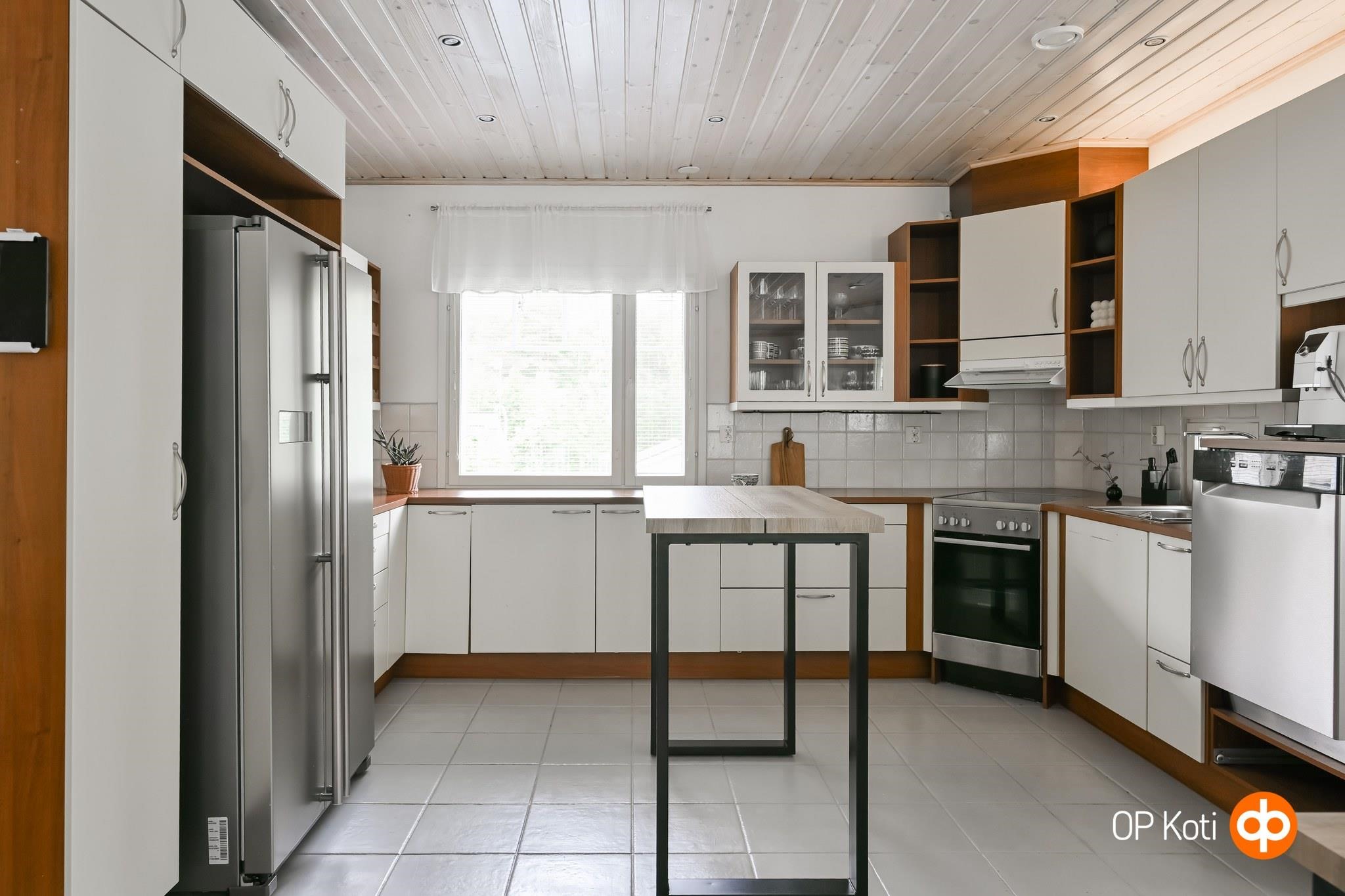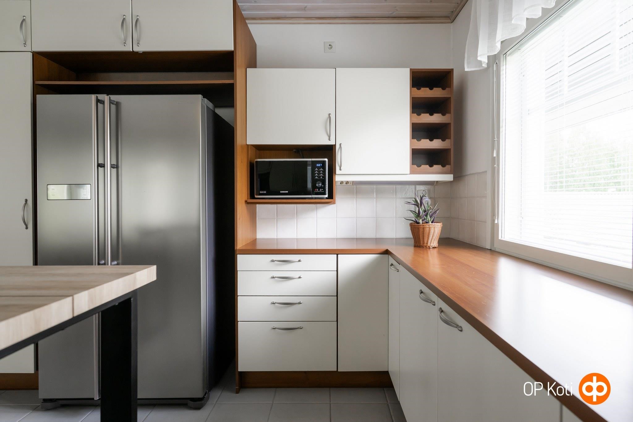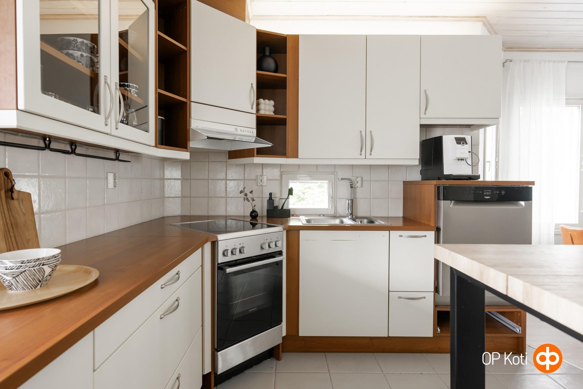 - Jääkaappi, pakastekaappi, erillisuuni, keraaminen liesi, astianpesukone, kaapistot, kiinteät valaisimet.