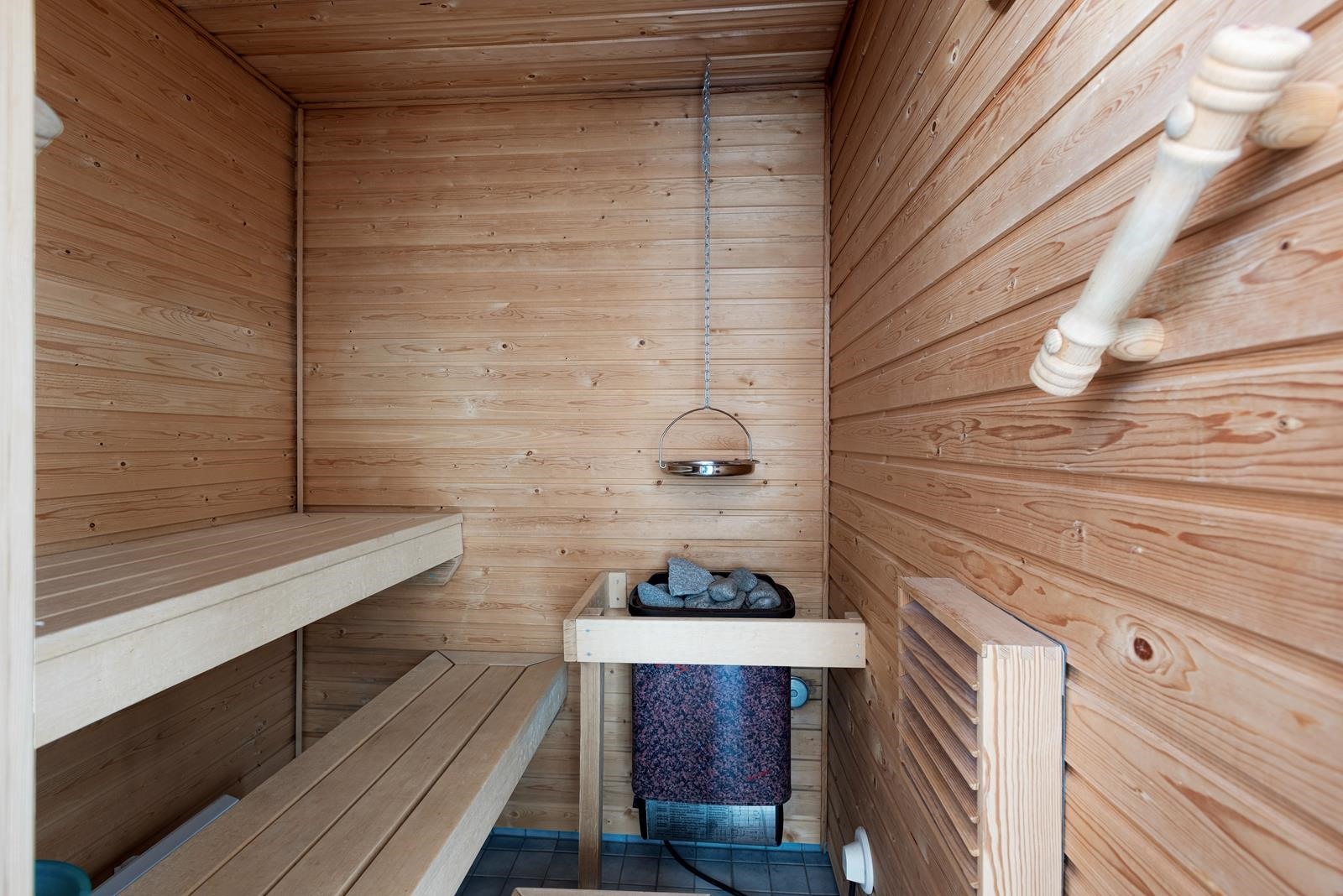 - Sauna, sähkökiuas, kylpyhuone, erillinen wc, suihku, pesukoneliitäntä.