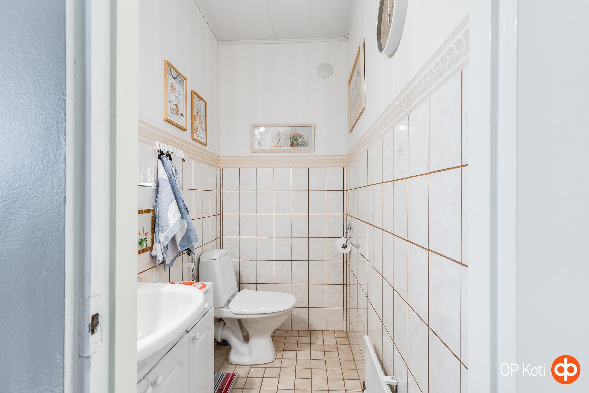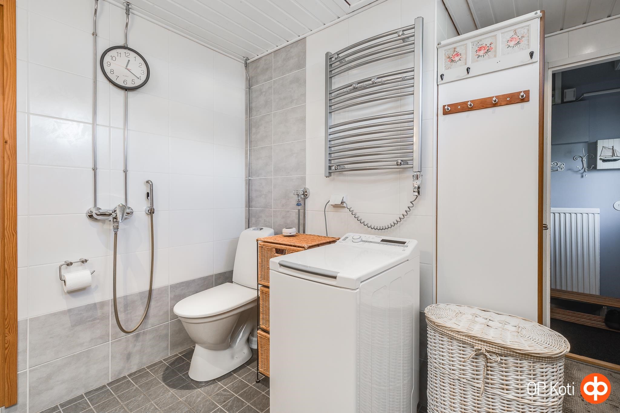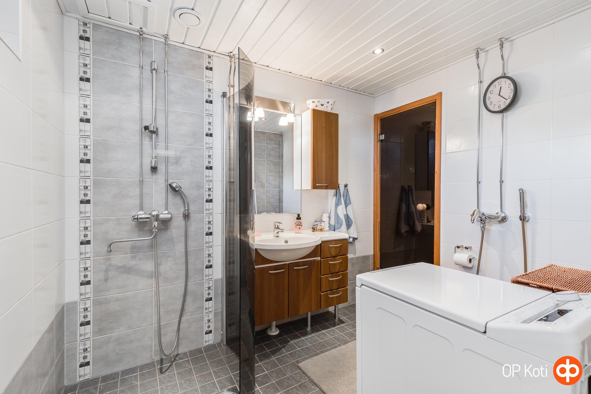 - Sauna, sähkökiuas ainavalmis, kylpyhuone, erillinen wc yläkerrassa, suihku, suihkuseinä, peilit yläkerran wc:ssä, peilikaappi pesuhuoneessa, allaskaappi yläkerran wc:ssä ja pesuhuoneessa, lattialämmitys pesuhuoneessa, kiinteät valaisimet. Kylpyhuone/sauna remontoitu 2010, silikonit vaihdettu 06/2025