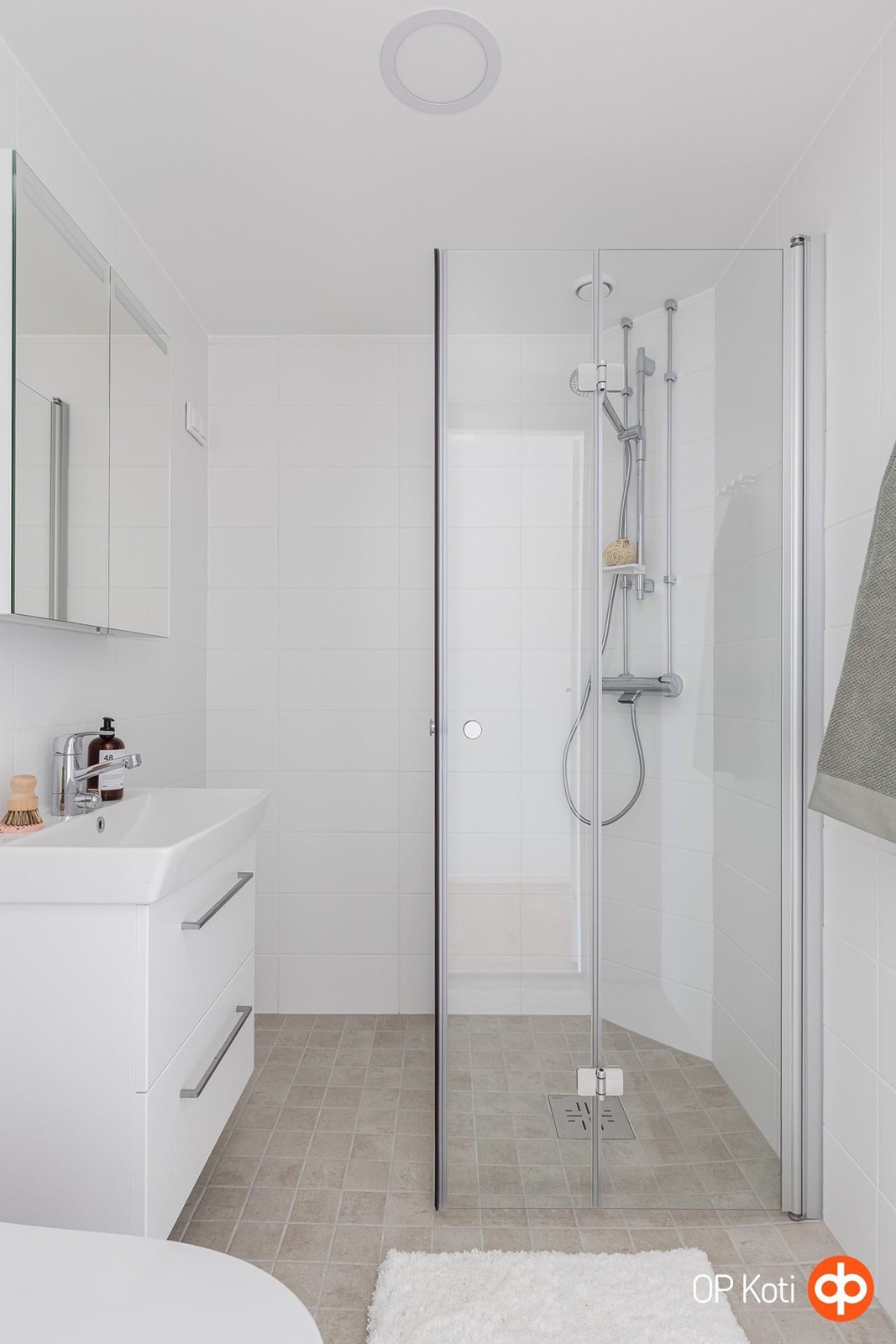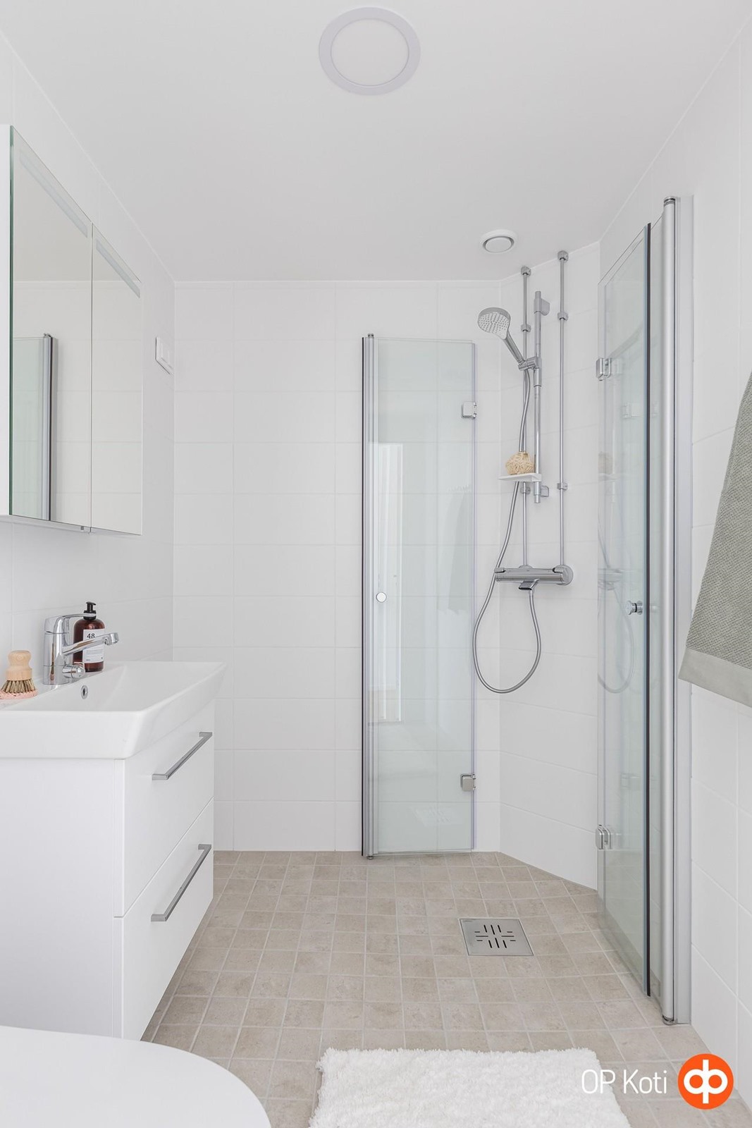 - kokonaan sivuun taittuvat suihkuseinät(2kpl), peilikaappi, allaskaappi, pesukoneliitäntä: hanassa veden otto ja altaan hajulukkoon veden poisto, vesikiertoinen lattialämmitys, kiinteät valaisimet, sähkökäyttöinen pyyhekuivain.
