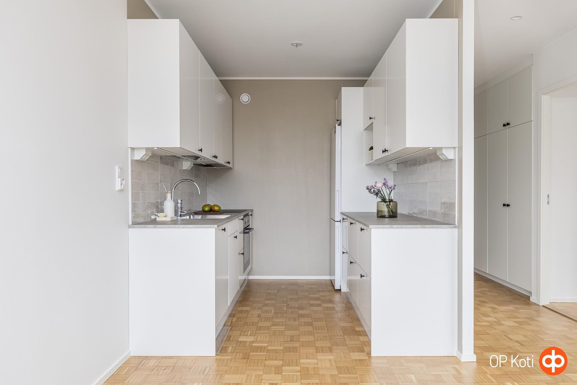 - jääkaappipakastin, erillisuuni, induktioliesi, liesituuletin, astianpesukone, kaapistot, kiinteät valaisimet koko keittiö on uusittu koneineen 2026.