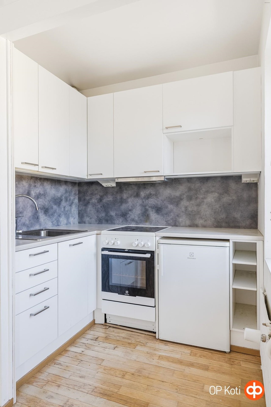 - Jääkaappi pakastelokerolla, keraaminen liesi, liesituuletin, kaapistot, kiinteät valaisimet.