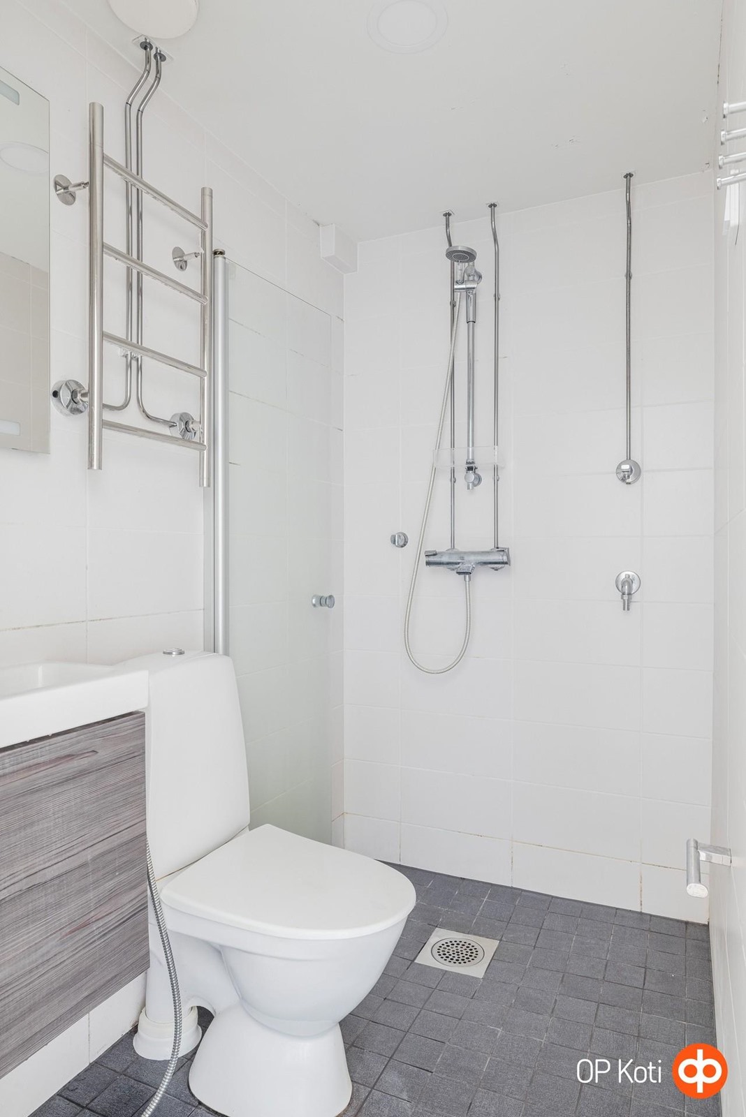 - Kylpyhuone, suihku, suihkuseinä, peilit, allaskaappi, pesukoneliitäntä, kiinteät valaisimet. Pyyhepatteri vesikiertoinen