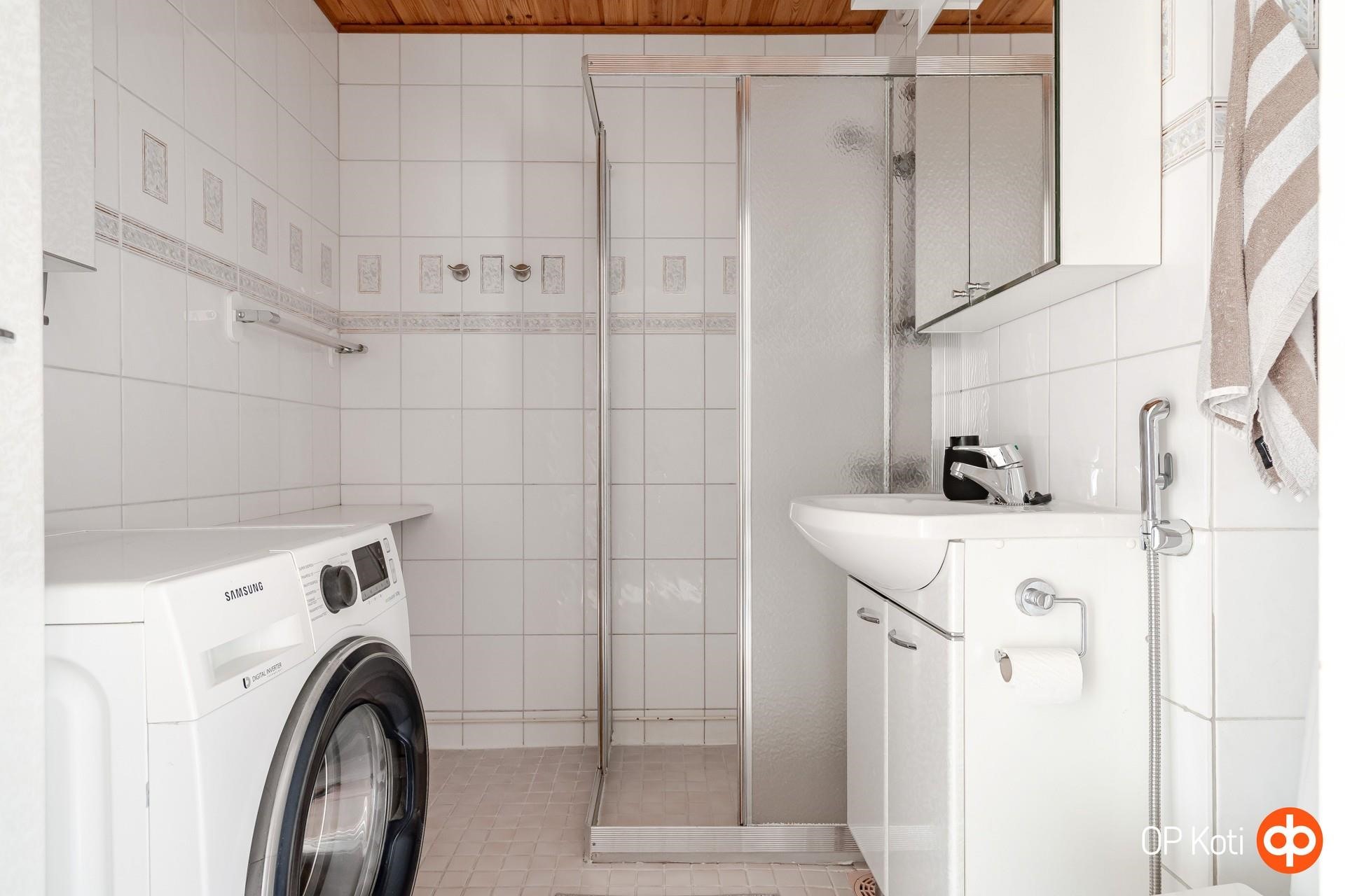 - Kylpyhuone, suihku, suihkuseinä, peilikaappi, kaapit korkea kaappi, pyykkikaapit, lääkekaappi, allaskaappi, pesukoneliitäntä, lattialämmitys sähköinen mukavuuslämmitys keittiössä ja kylpyhuoneessa, kiinteät valaisimet.