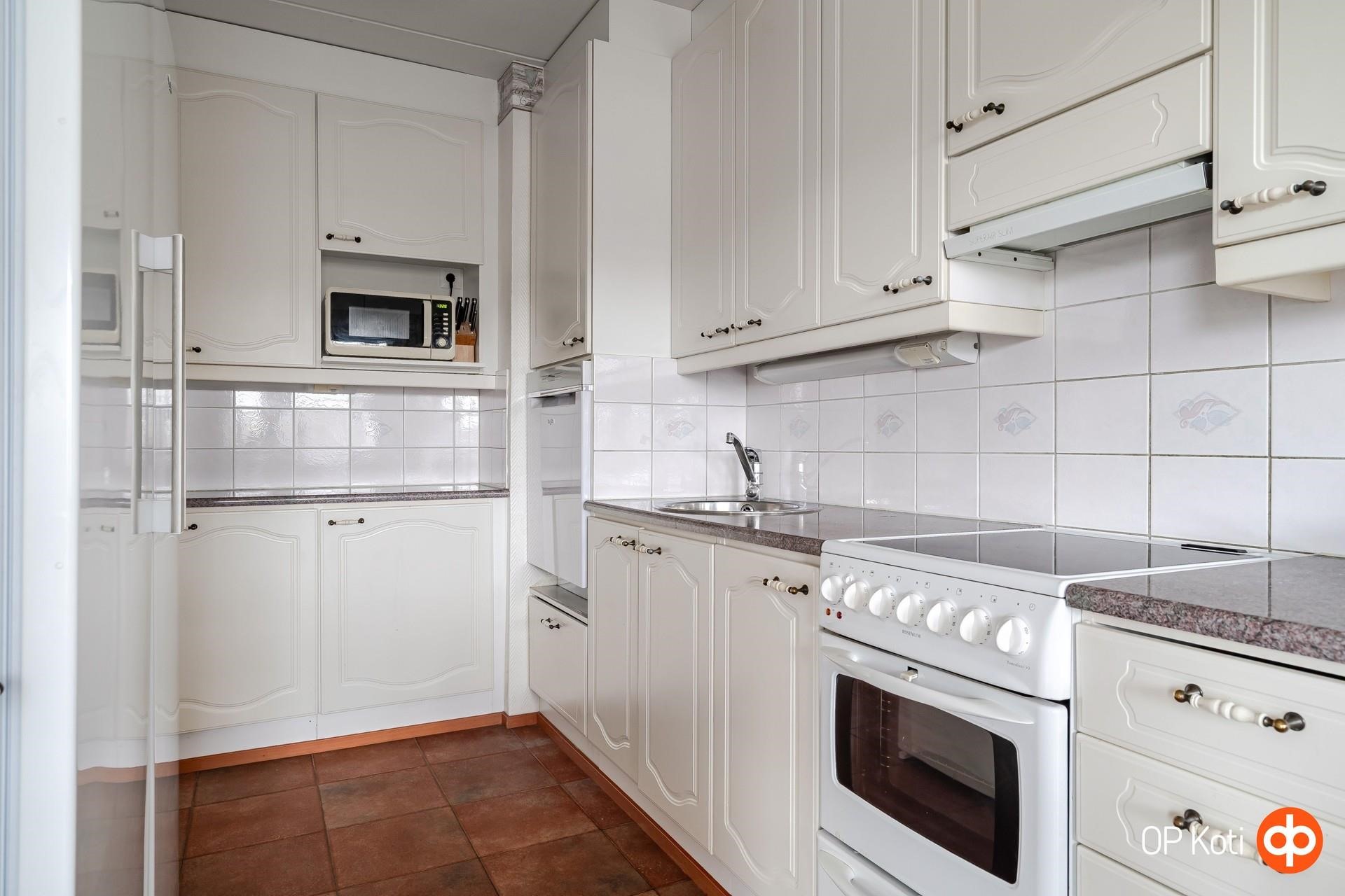 - Jääkaappi täyskorkea, pakastekaappi täyskorkea, lattialiesi keraaminen, liesituuletin suodatin, astianpesukone, kaapistot valkoiset kaapistot, kiinteät valaisimet.