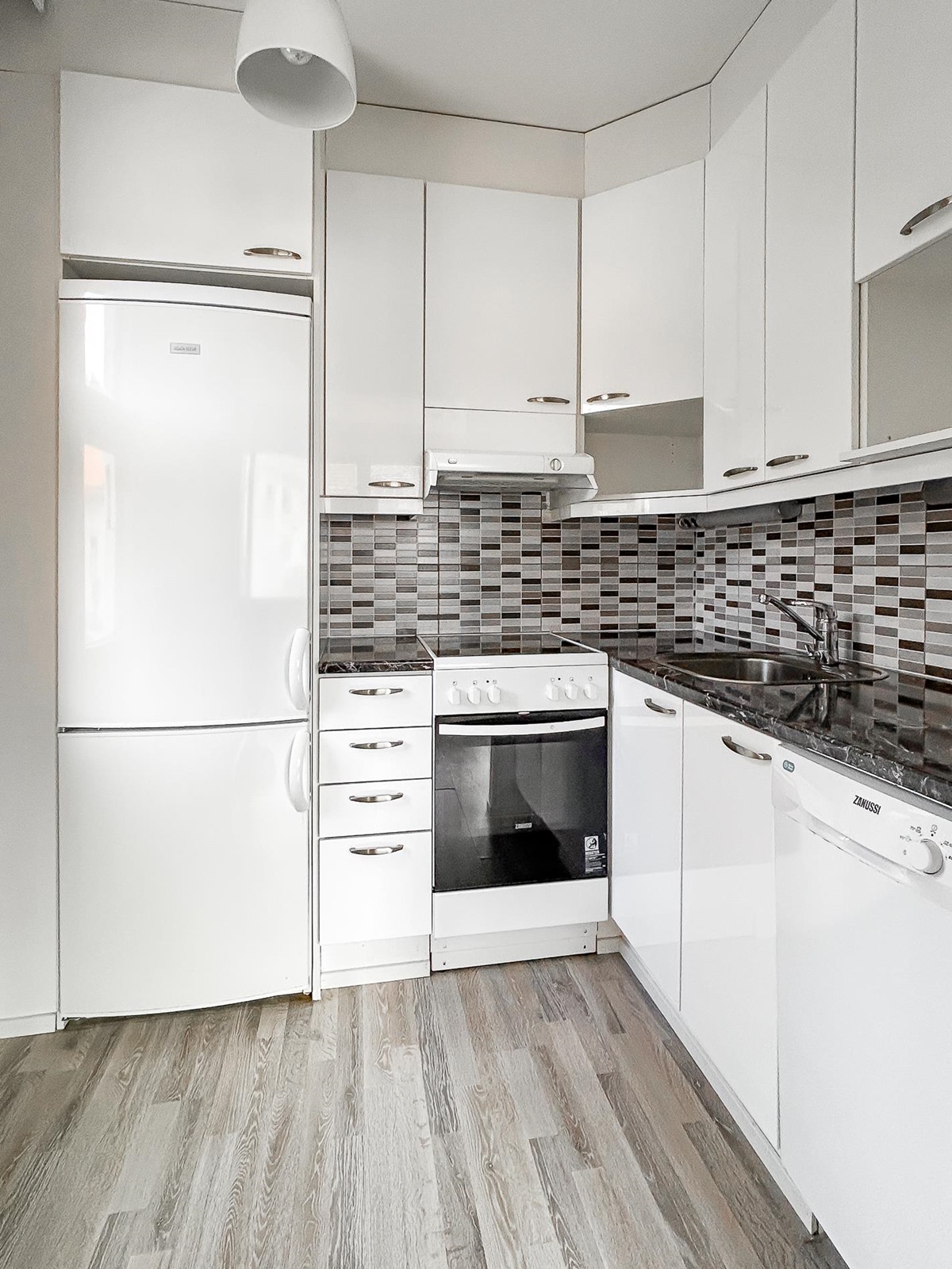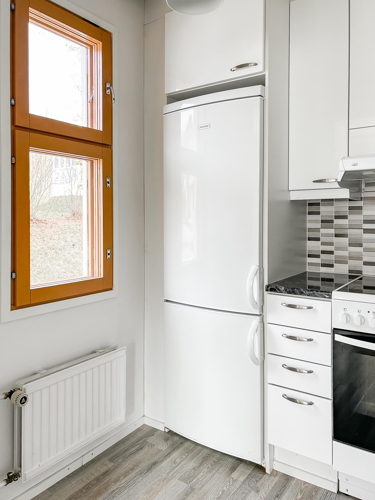 - Jääkaappipakastin, keraaminen liesi, liesituuletin, astianpesukone, kaapistot, kiinteät valaisimet.
