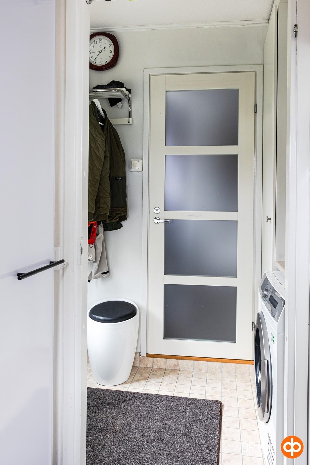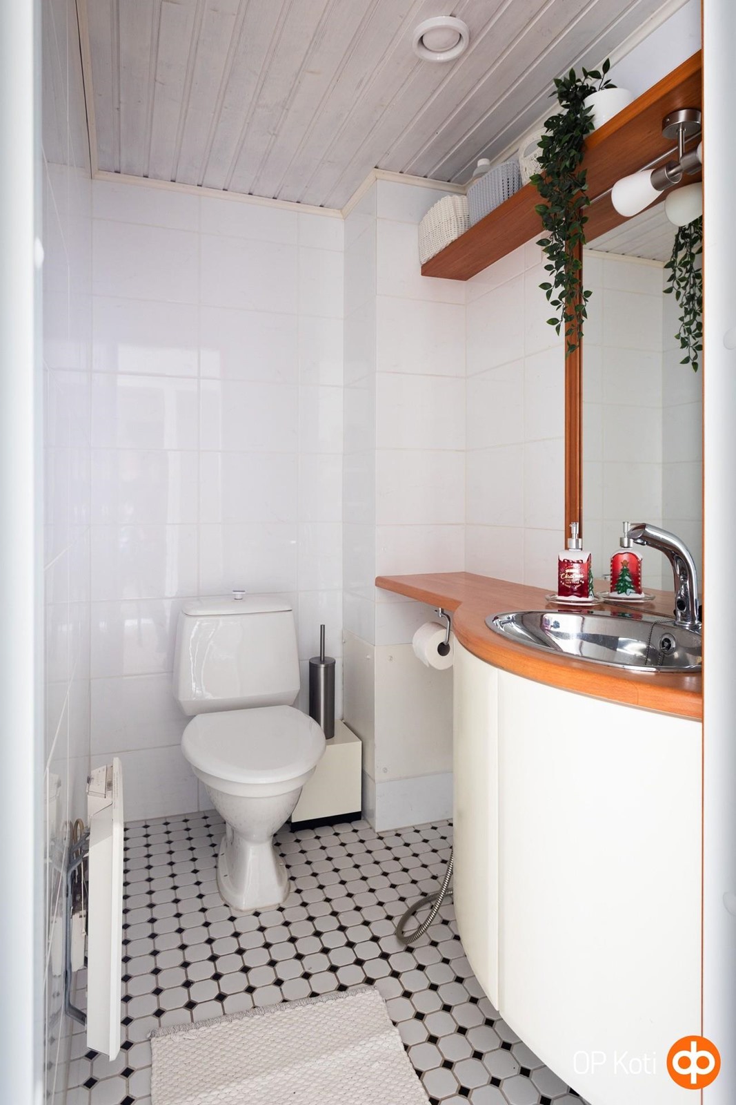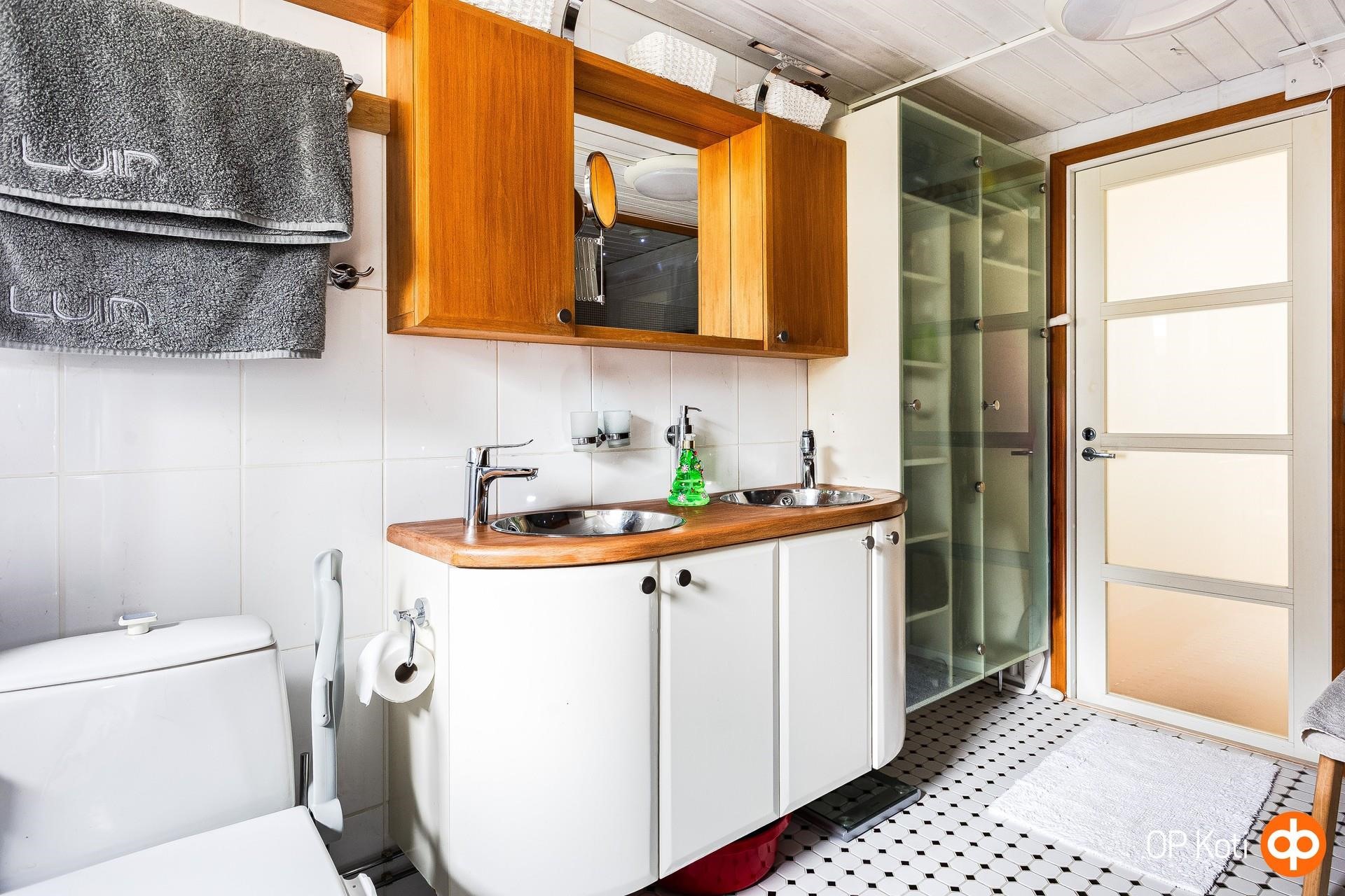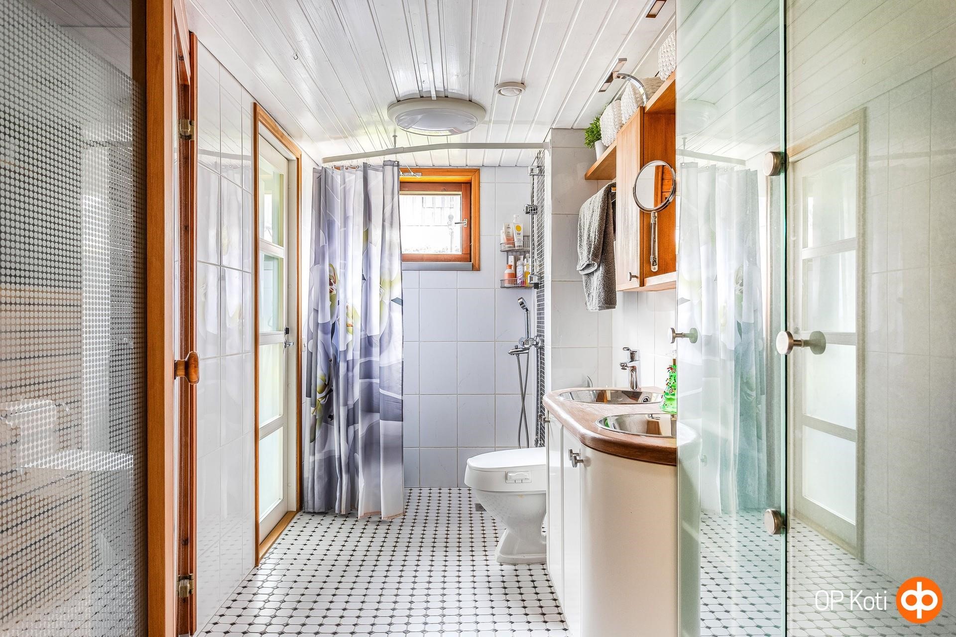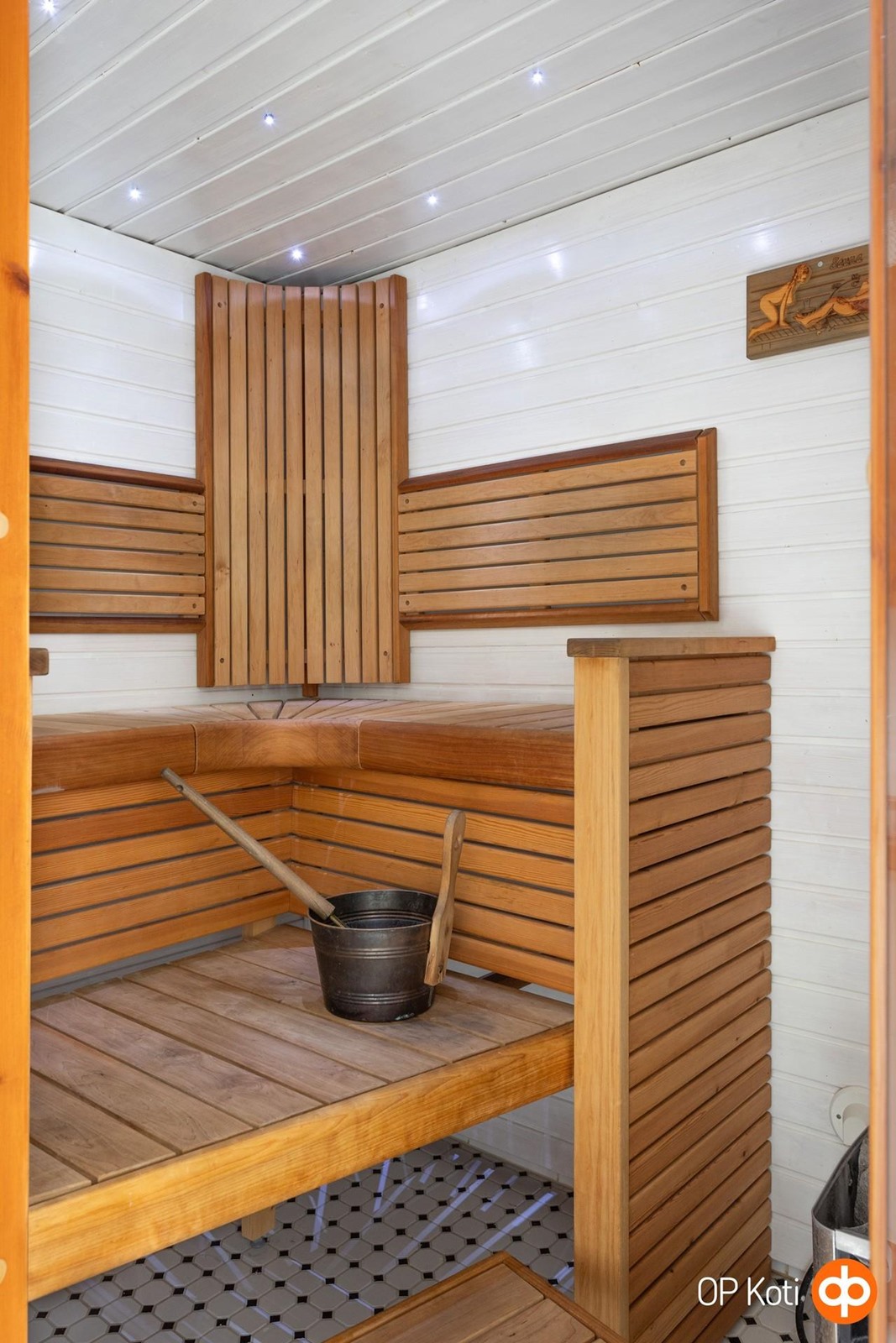 - Sauna, sähkökiuas, kylpyhuone, erillinen wc, suihku, peilikaappi, allaskaappi kh; ssa 2 allaskaappia, pesukoneliitäntä, lattialämmitys, kiinteät valaisimet. Kh ja wc remontoitu 2004, saunan lauteet käsitelty 2 kertaa vuodessa, kh hanat uusittu 2023