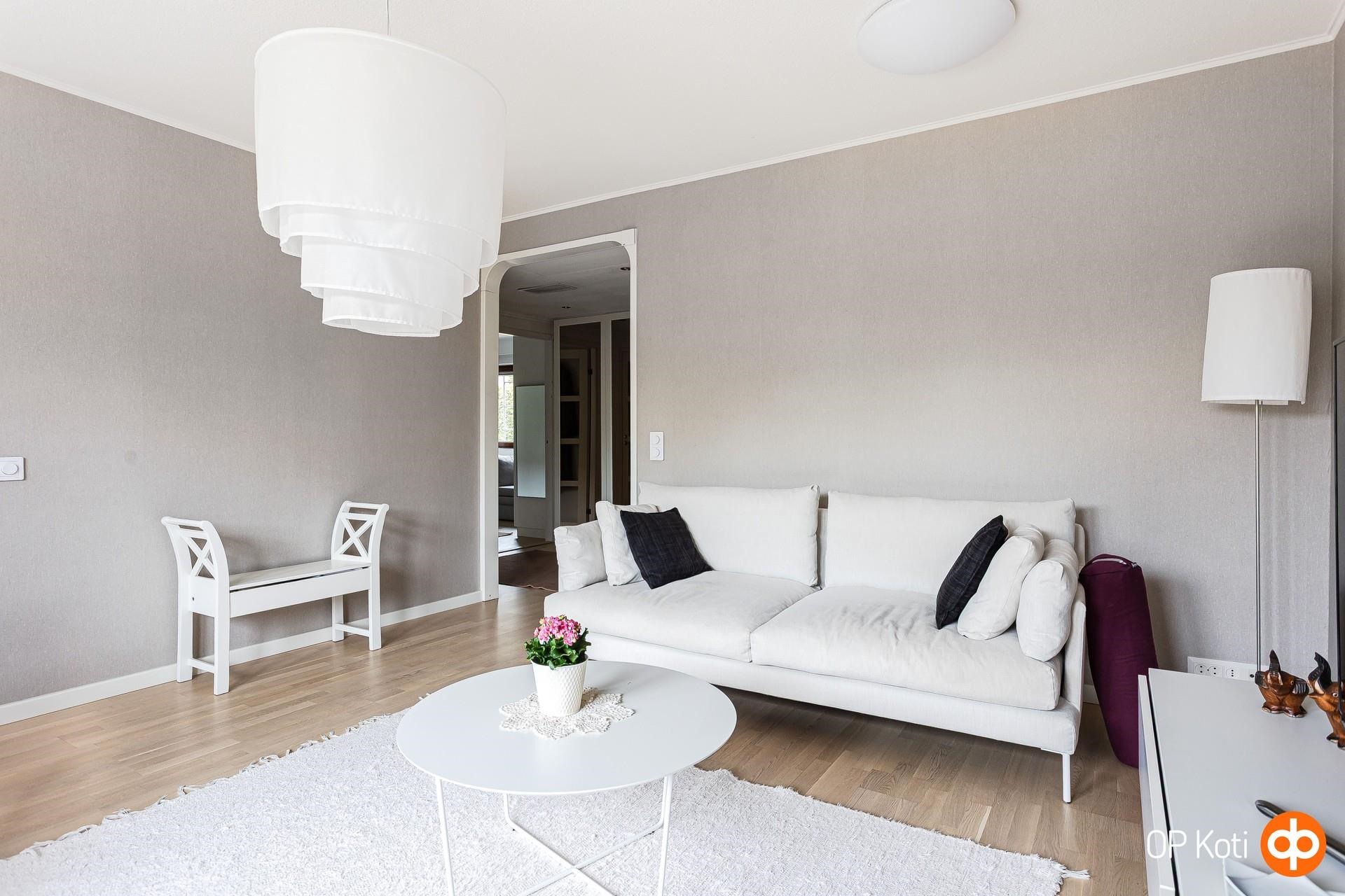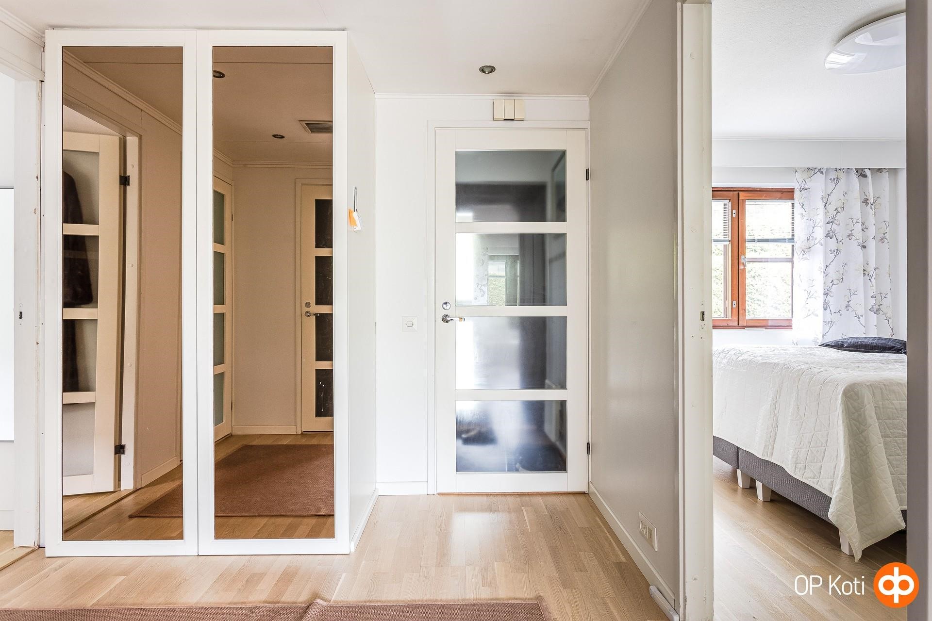 Keittiö: seinät maali (arkkitehdin valkoinen), lattia parketti (uusittu 2016). Olohuone: seinät maali/tapetti, lattia parketti (uusittu 2016). Makuuhuone 1: seinät maali/tapetti, lattia parketti. Makuuhuone 2: seinät maali/tapetti, lattia parketti. Kodinhoitohuone: seinät maali, lattia laatta. Sauna: seinät paneli, lattia laatta. Kylpyhuone: seinät ja lattia laatta. Eteinen: seinät nmaali, laminaatti. Wc: seinät ja lattia laatta.