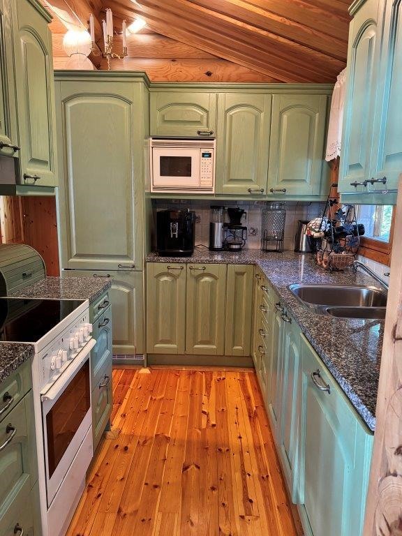 - Jääkaappipakastin integroitu, keraaminen liesi, leivinuuni, mikroaaltouuni integroitu, astianpesukone integroitu, kaapistot, kiinteät valaisimet, pöytätasojen materiaali.