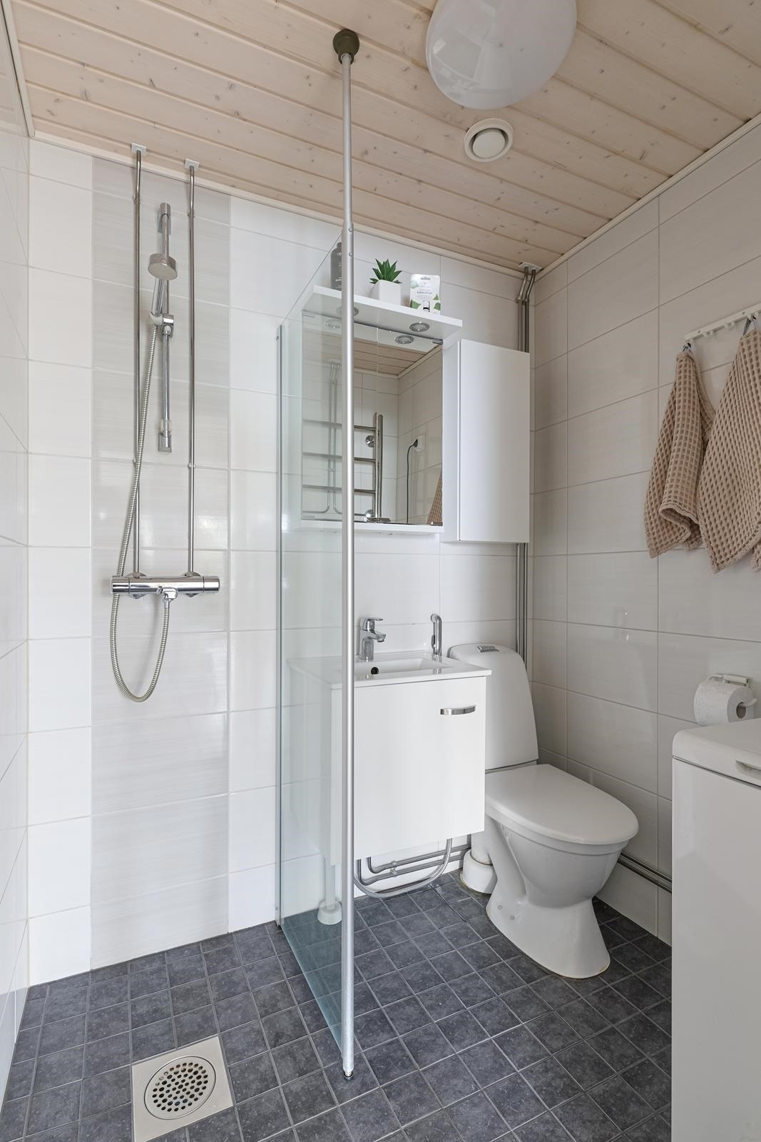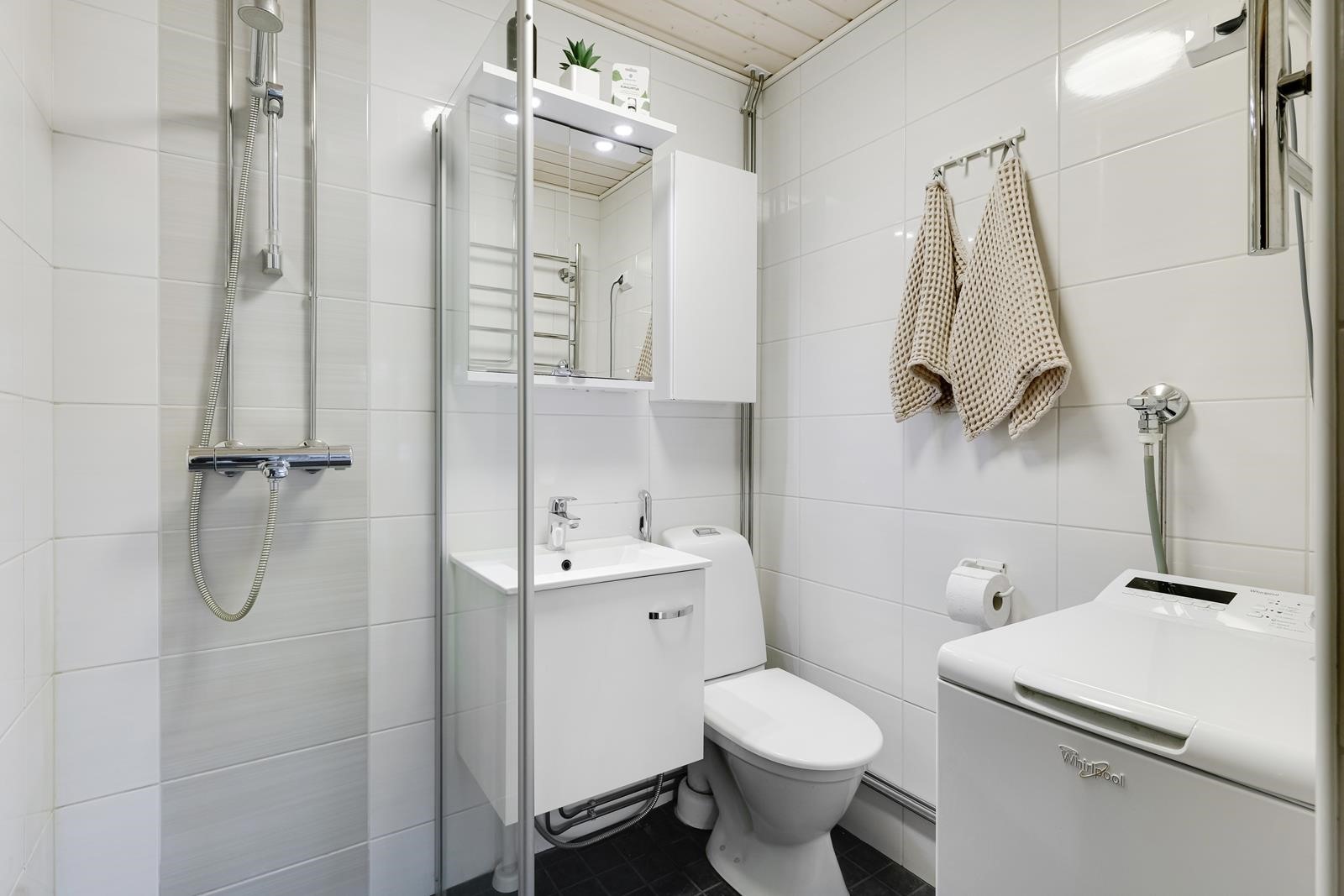 - Sauna, sähkökiuas, kylpyhuone, suihku, allaskaappi, lattialämmitys, kiinteät valaisimet.
