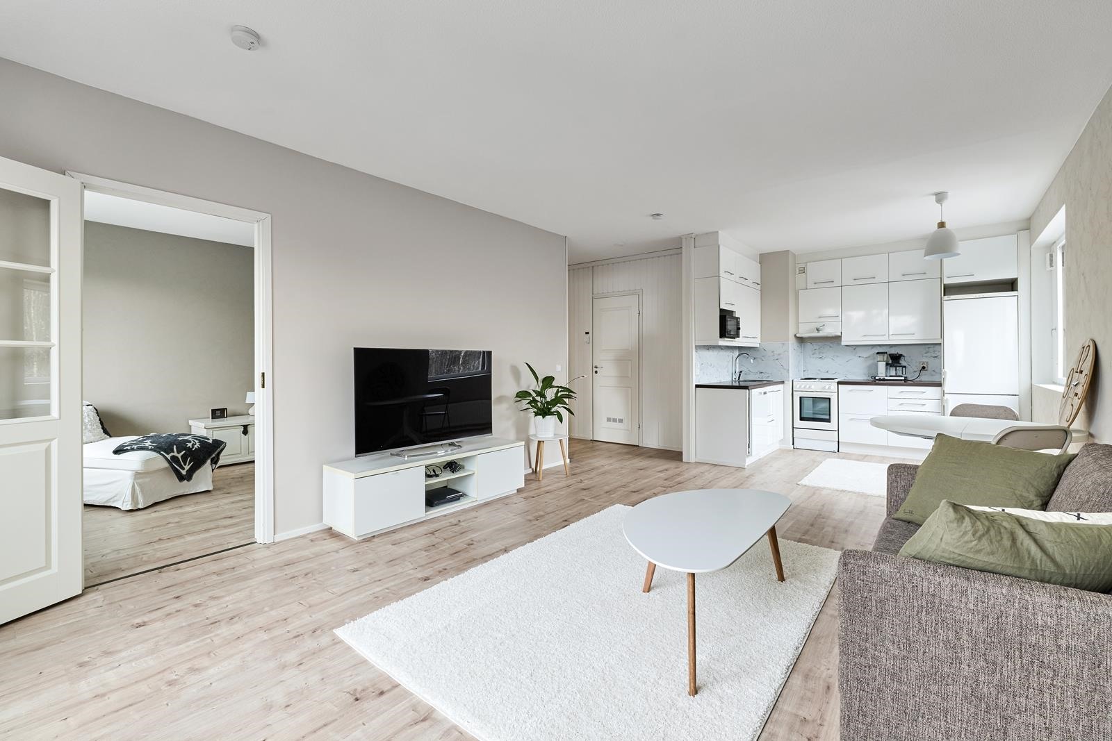 Keittiö ja olohuone yhtenäistä avaraa tilaa. Kylpyhuone remontoitu viemärisaneerauksen yhteydessä v. 2019.