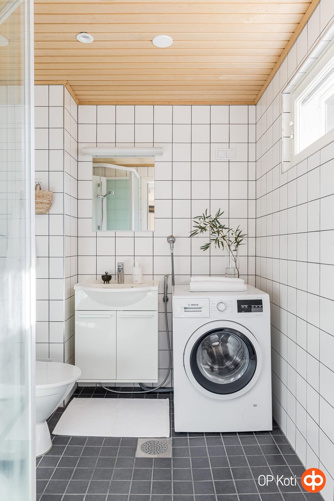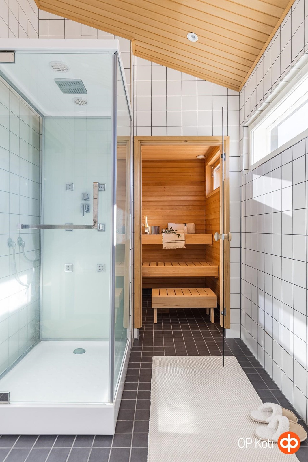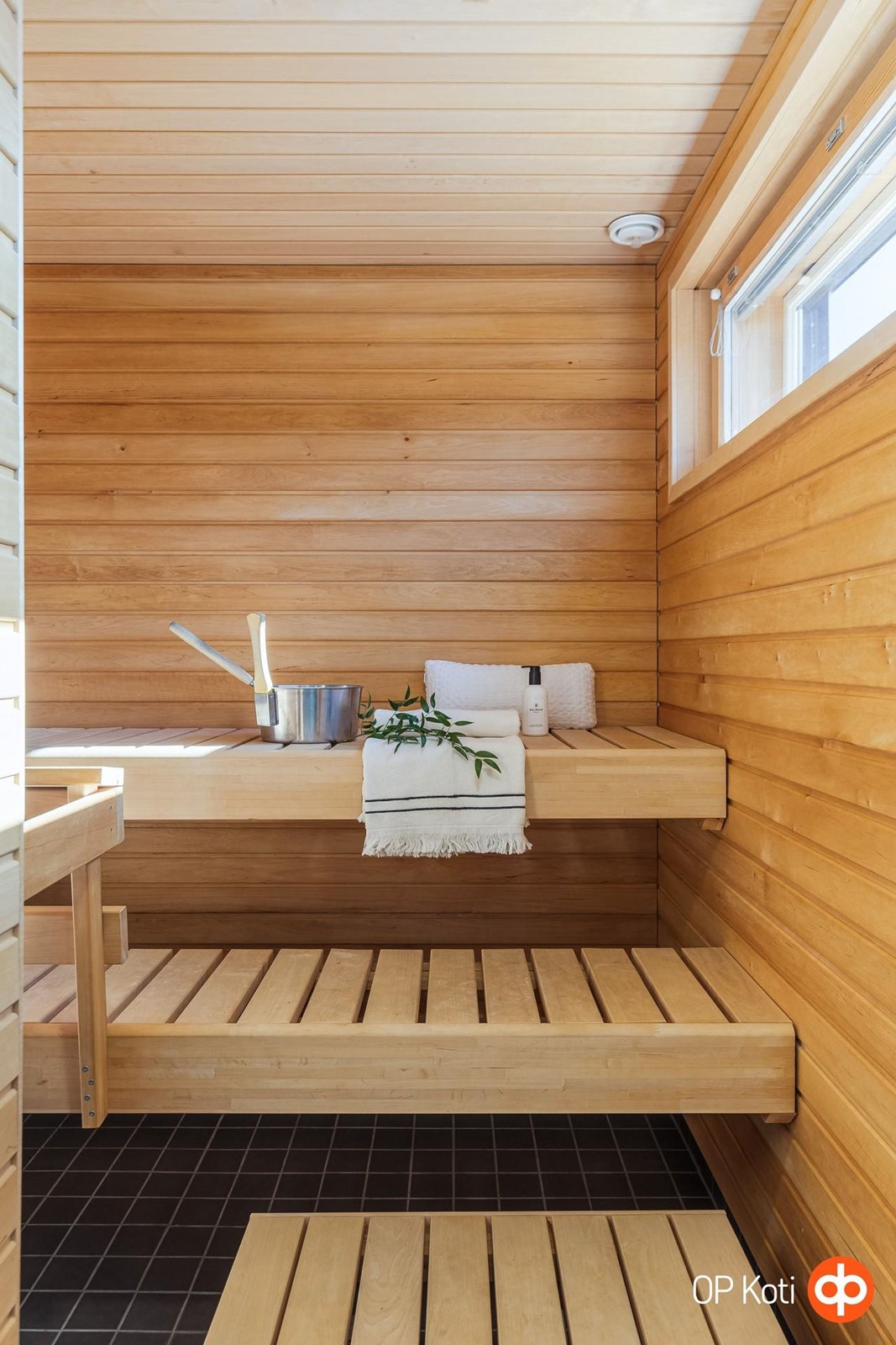 - Sauna, sähkökiuas, suihku, suihkukaappi suihkukaapit molemmissa kph:ssa, peilit, kaapit, allaskaappi, pesukoneliitäntä molemmissa kph:ssa, lattialämmitys, kiinteät valaisimet.