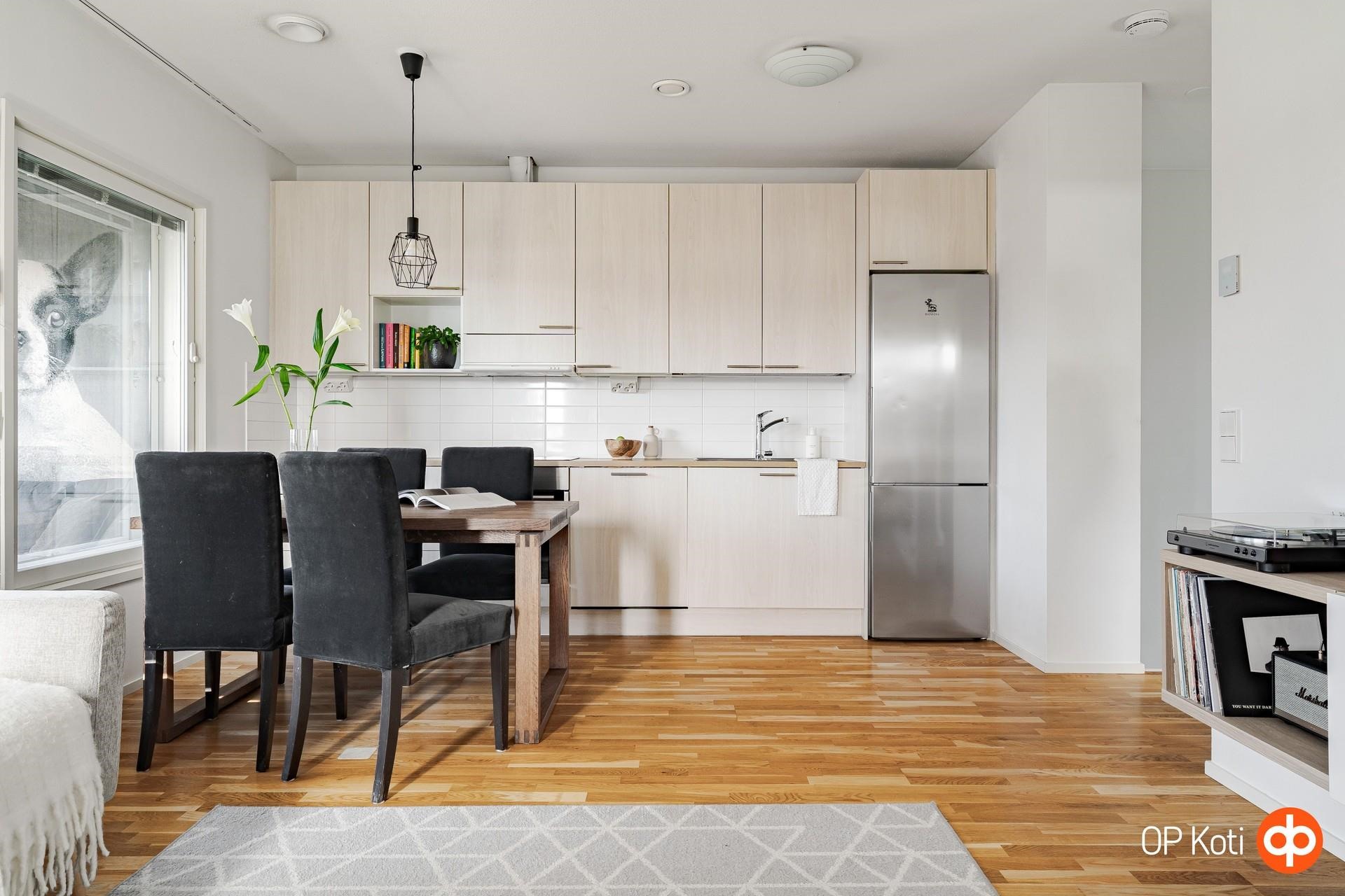 - Jääkaappipakastin, erillisuuni, liesitaso induktio, liesituuletin, astianpesukone integroitu, kaapistot, kiinteät valaisimet. Puustelli-keittiö