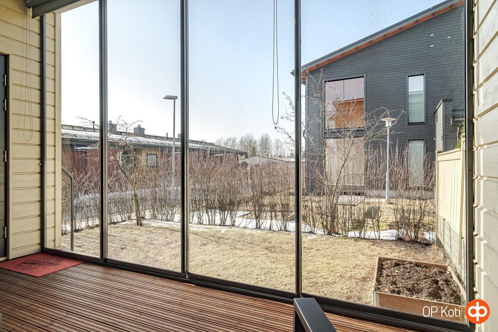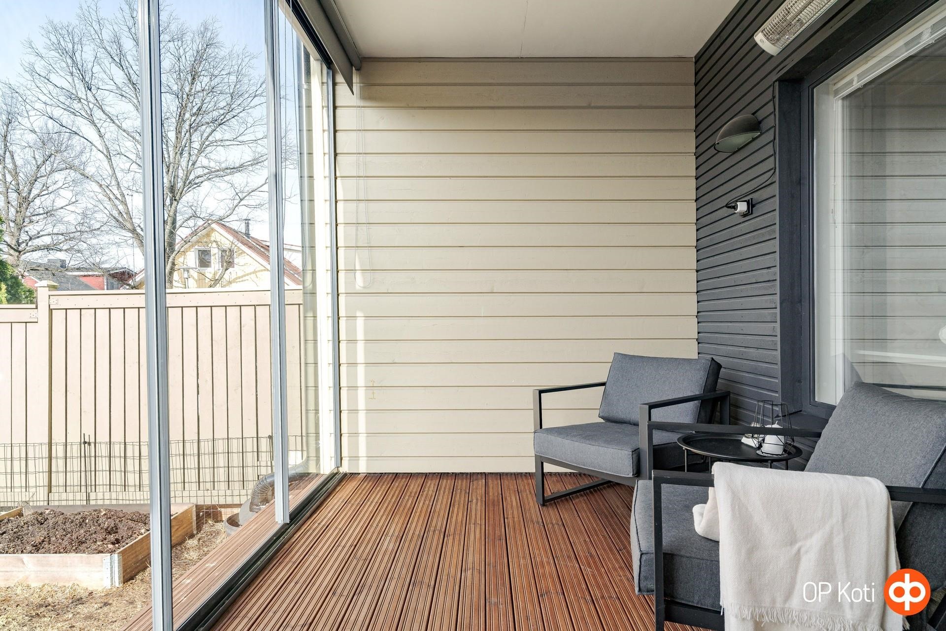 Asunnon oleskelutilat jatkuvat luontevasti ulos: käytössäsi on lasitettu parveke, lasitettu terassi, oma piha sekä ulkovarasto. Parveke ja piha avautuvat ihanteellisesti ilta-aurinkoon, mikä tekee niistä täydelliset paikat rentoutumiseen ja kesäiltojen viettoon.