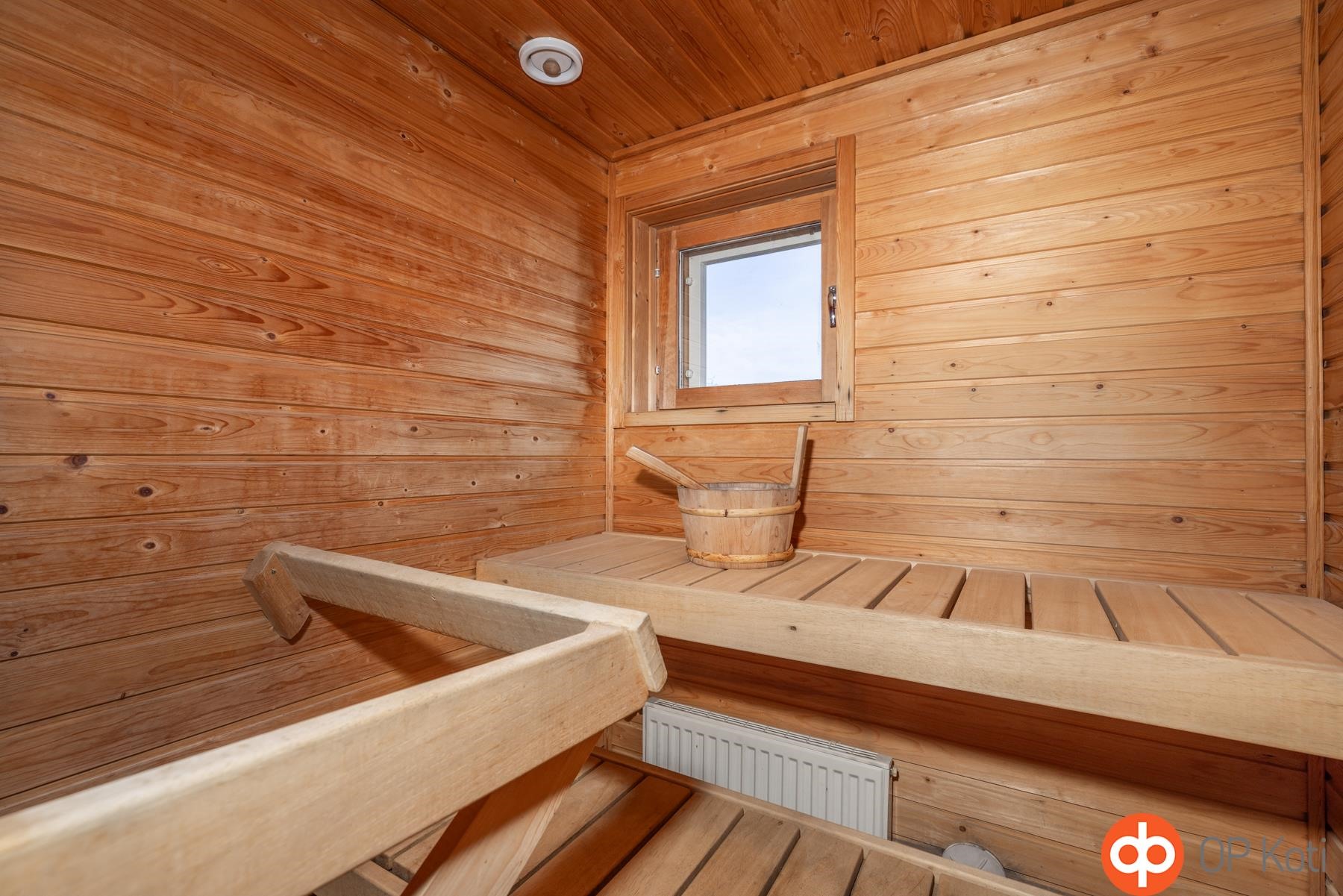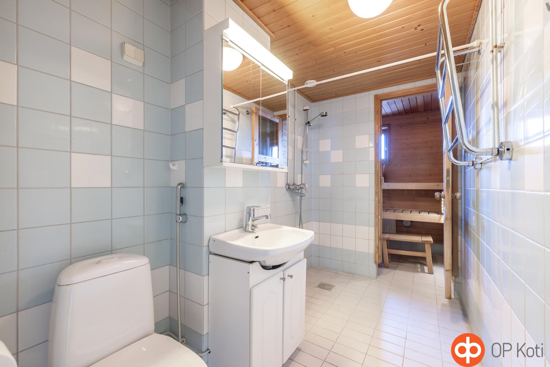 - Sauna, sähkökiuas, suihku, peilit, pesukoneliitäntä, lattialämmitys kph, kiinteät valaisimet.