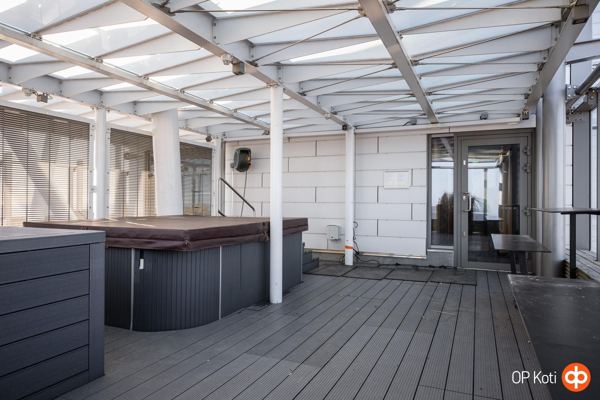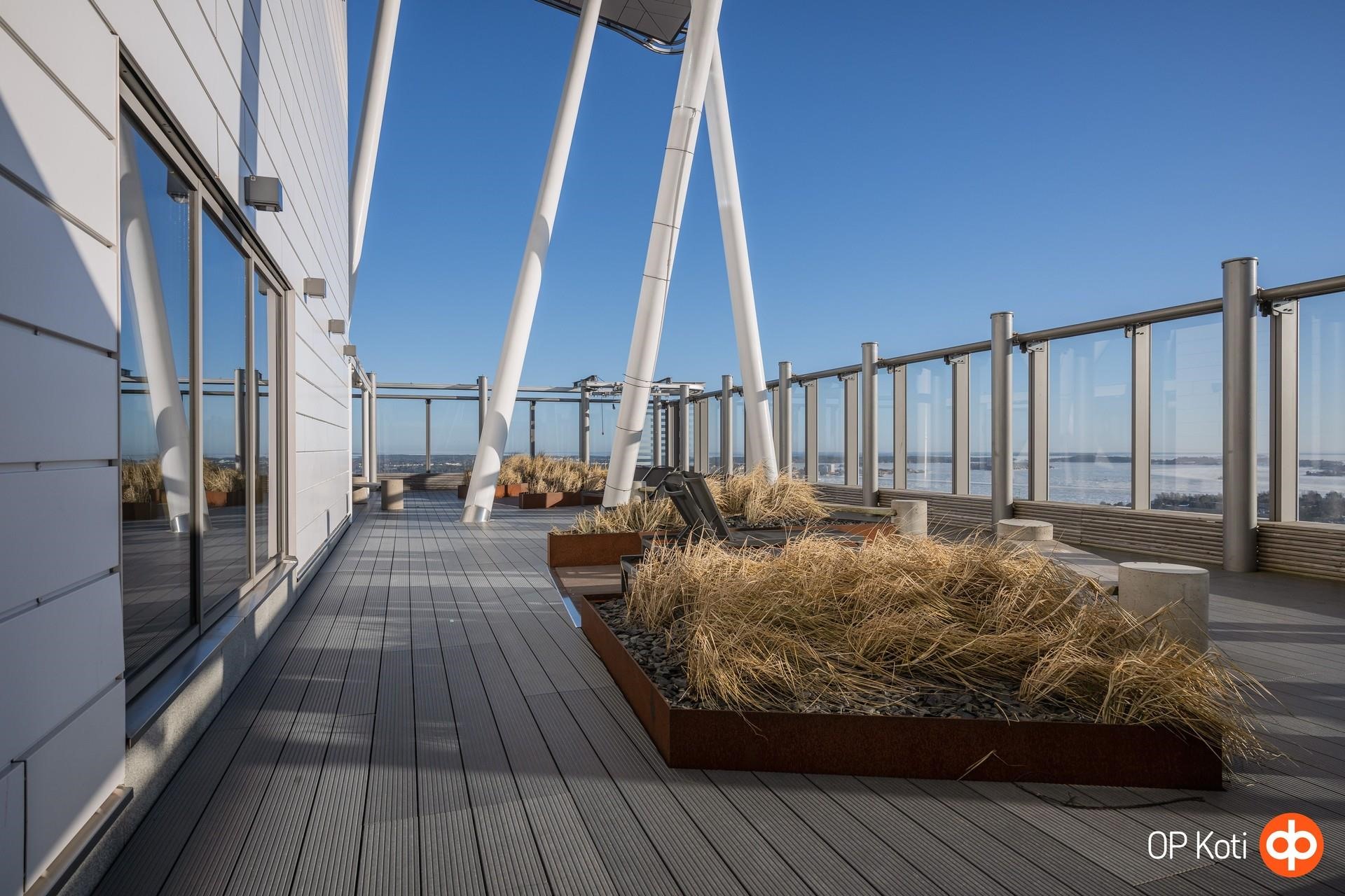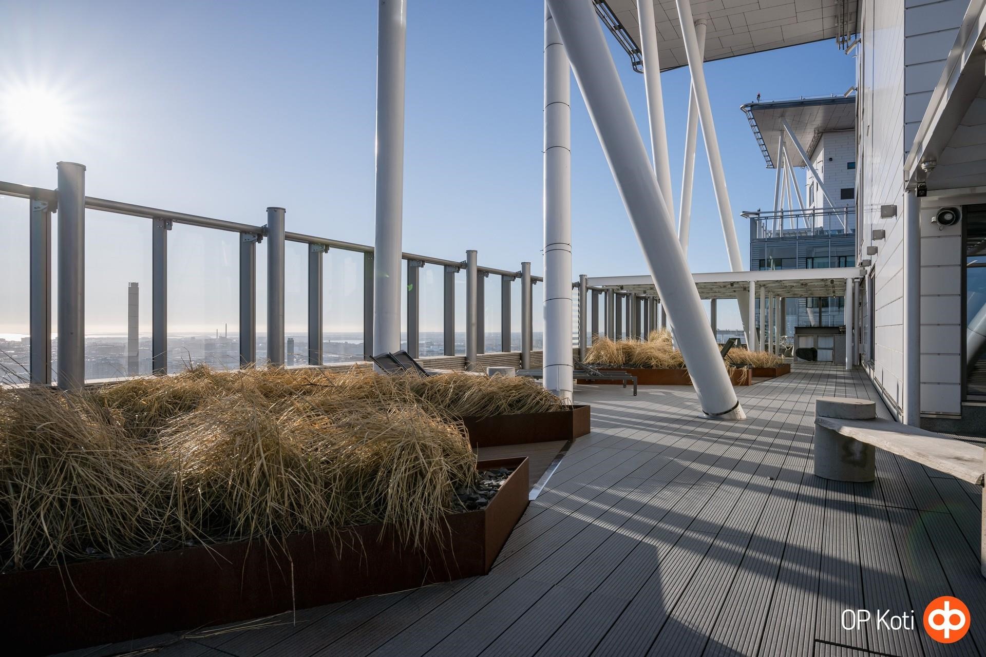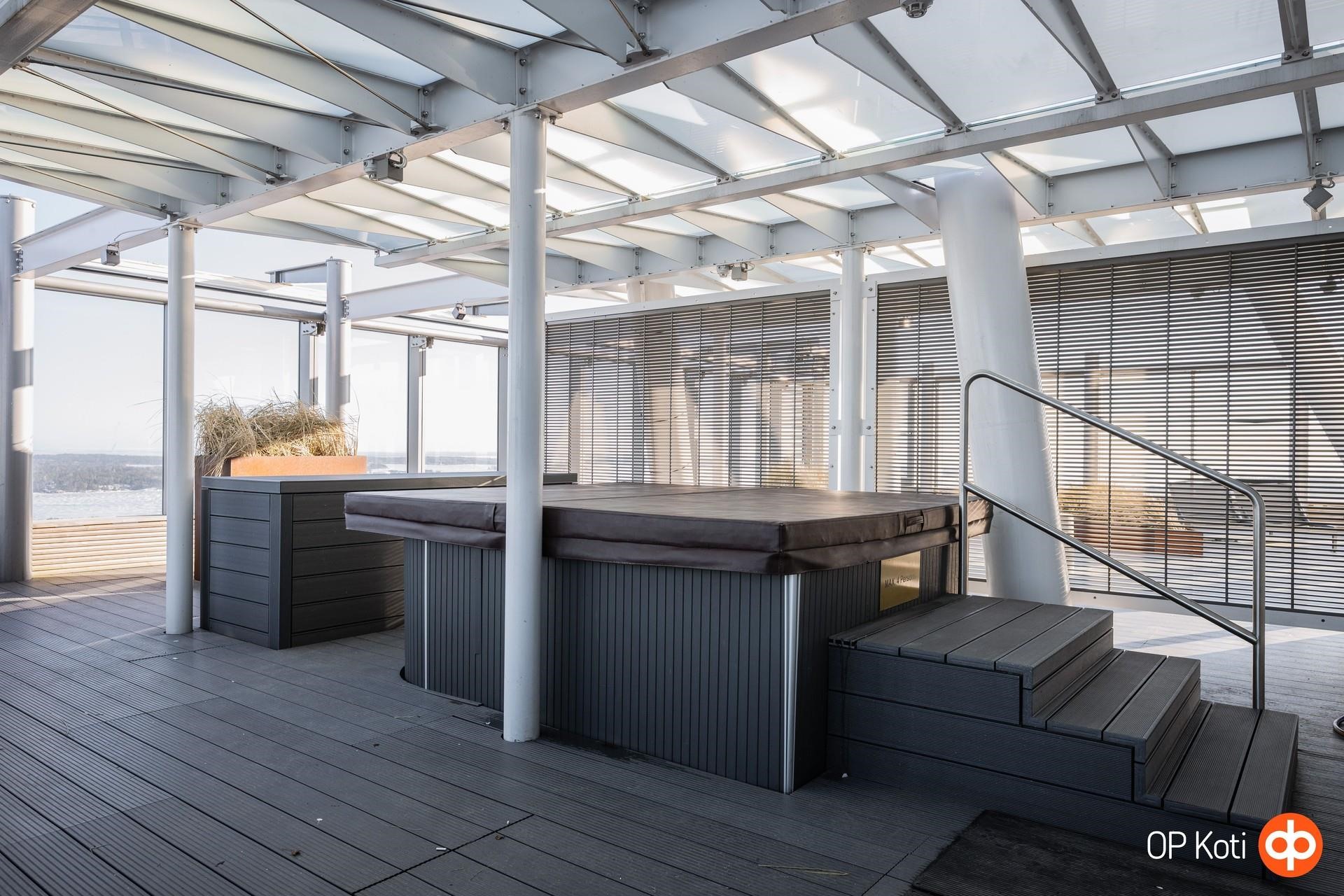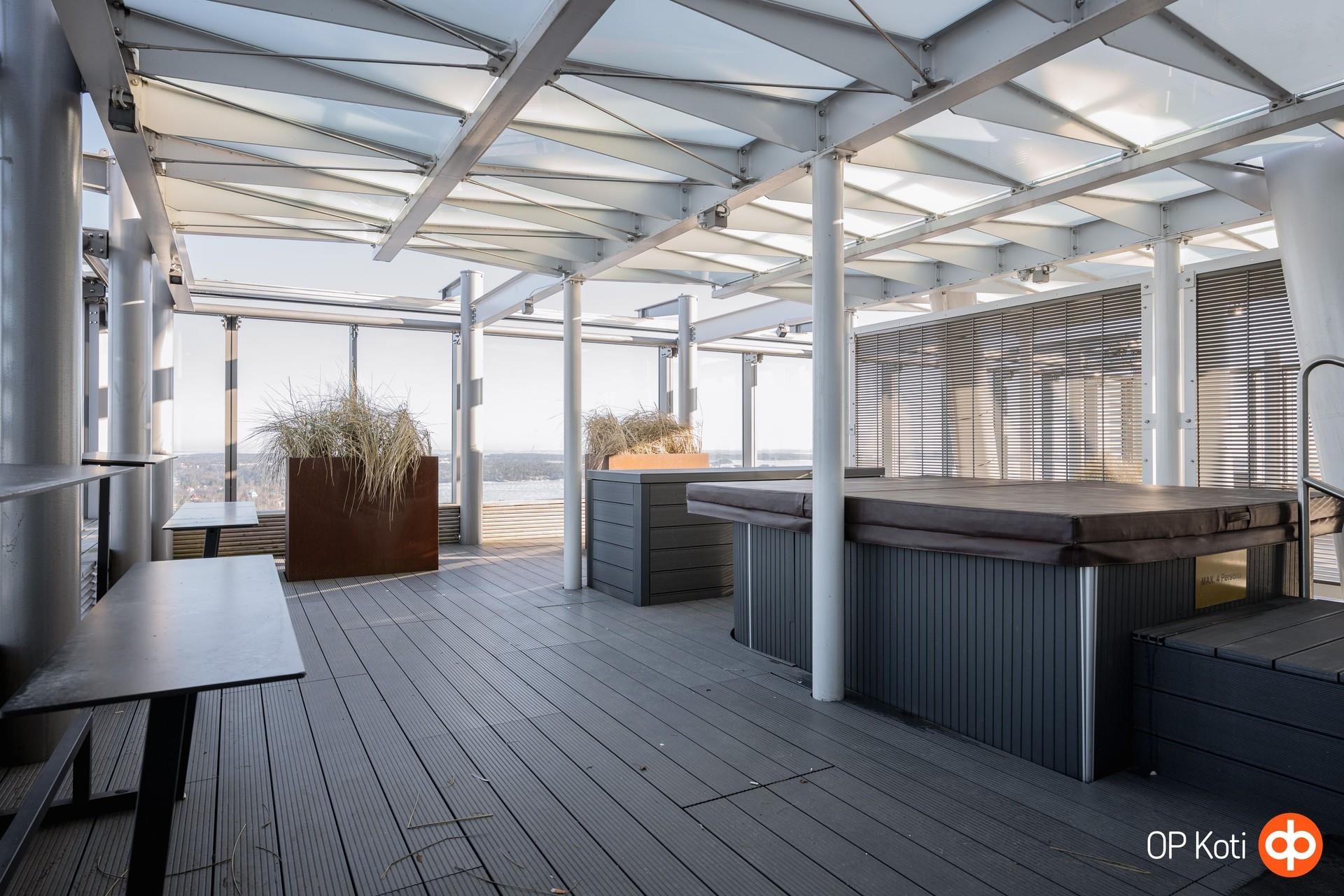 Taloyhtiön puitteet nostavat asumisen aivan omalle tasolleen. Upeat kattoterassit porealtaineen tarjoavat paikan rentoutumiseen ja ehkäpä kaupungin hienoimpien maisemien ihailuun korkealta kaiken yläpuolella. Laadukkaat saunatilat ja oma kuntosali tuovat arkeen luksusta ja helppoutta. Lisäksi yhtiön palvelut ja yhteiset tilat tekevät asumisesta sujuvaa ja huolettoman vaivatonta.