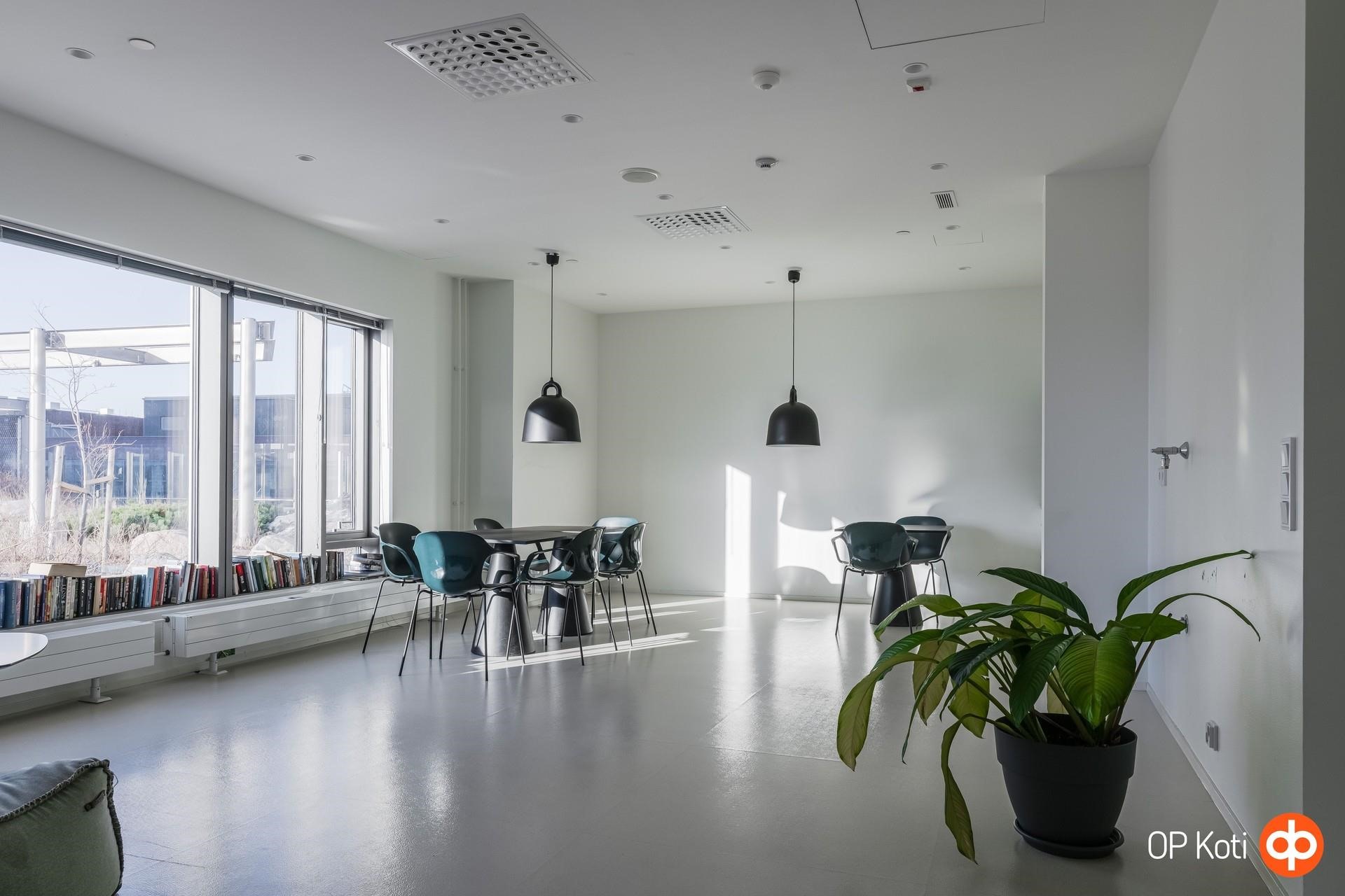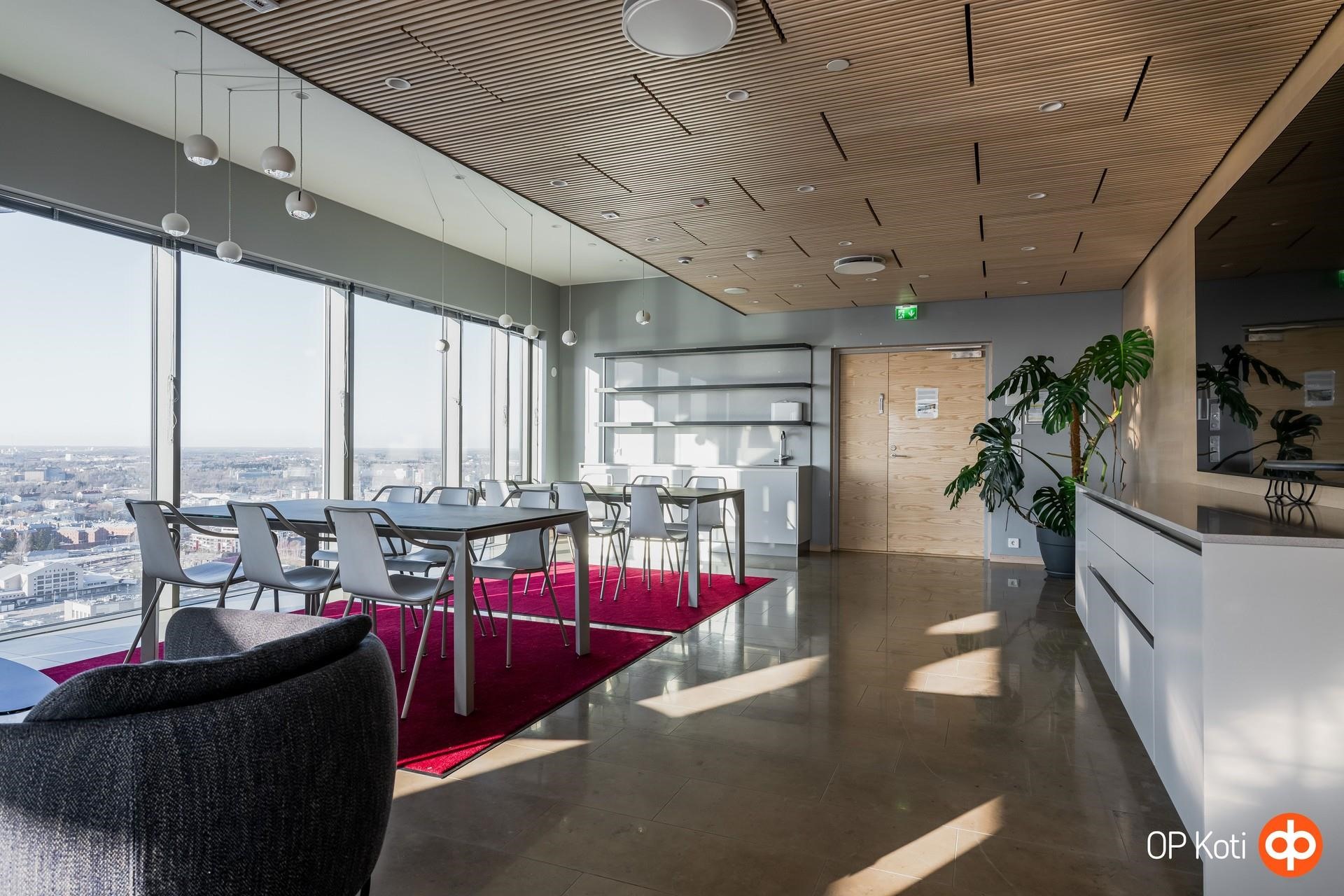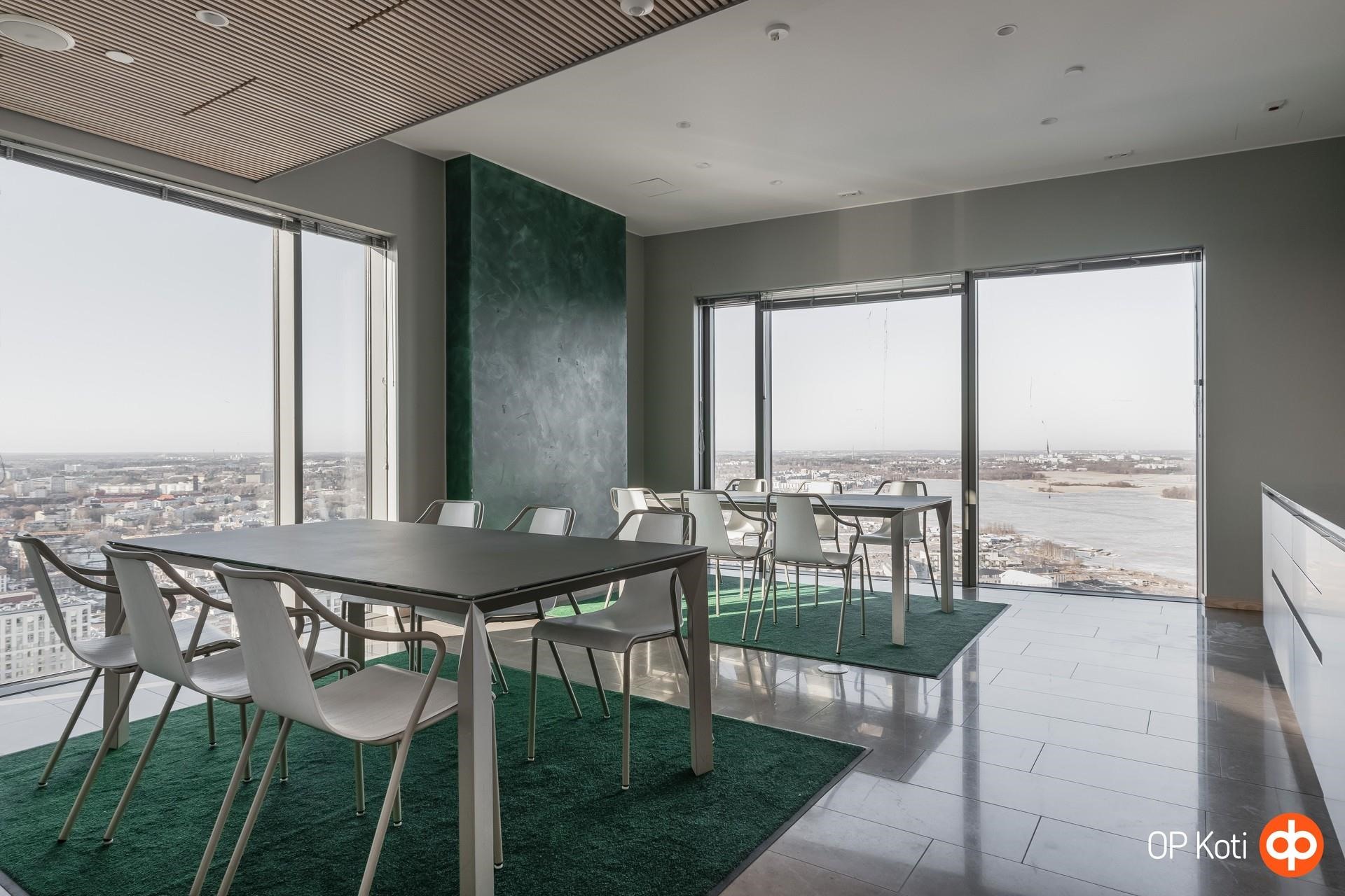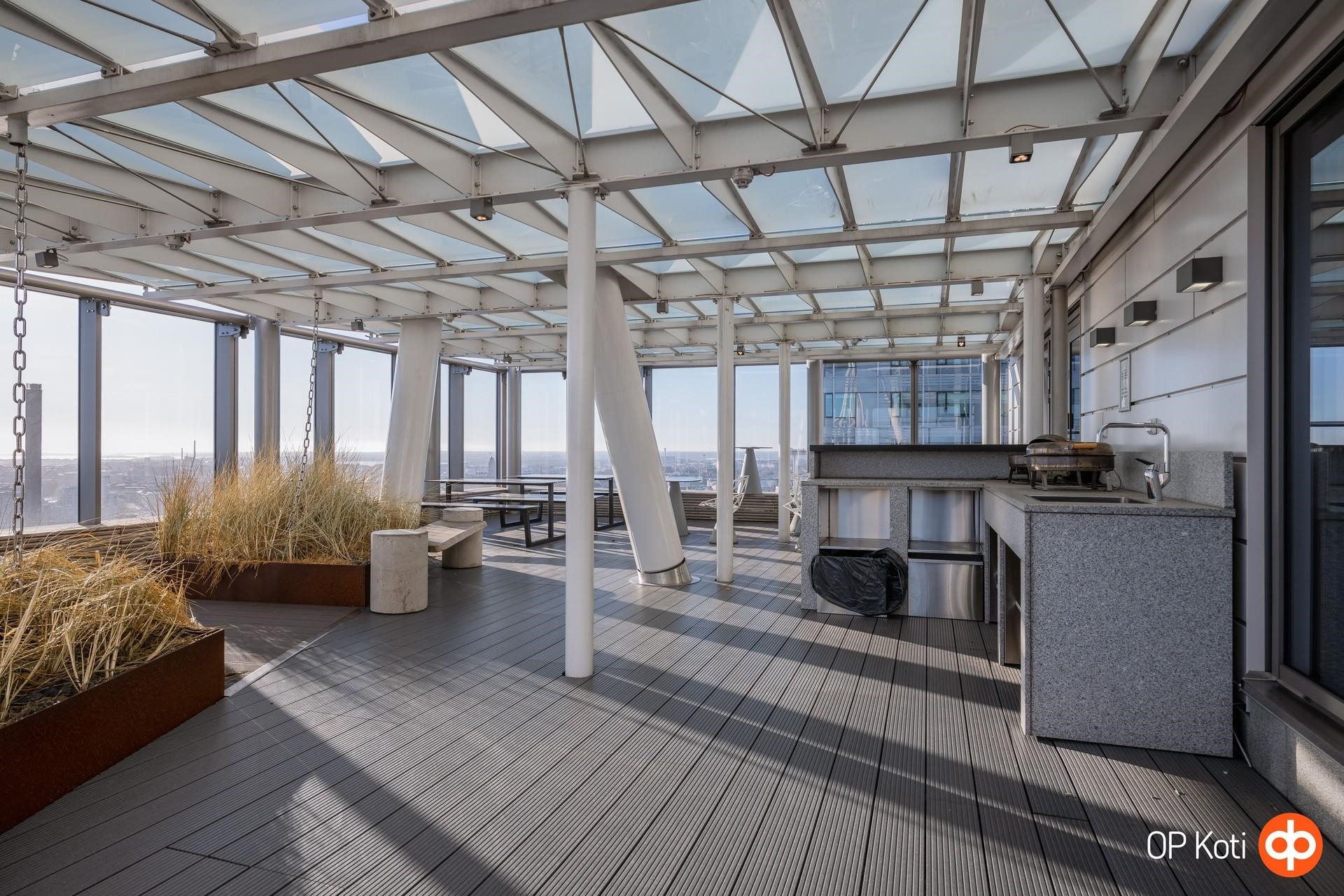 Taloyhtiön puitteet nostavat asumisen aivan omalle tasolleen. Upeat kattoterassit porealtaineen tarjoavat paikan rentoutumiseen ja ehkäpä kaupungin hienoimpien maisemien ihailuun korkealta kaiken yläpuolella. Laadukkaat saunatilat ja oma kuntosali tuovat arkeen luksusta ja helppoutta. Lisäksi yhtiön palvelut ja yhteiset tilat tekevät asumisesta sujuvaa ja huolettoman vaivatonta.
