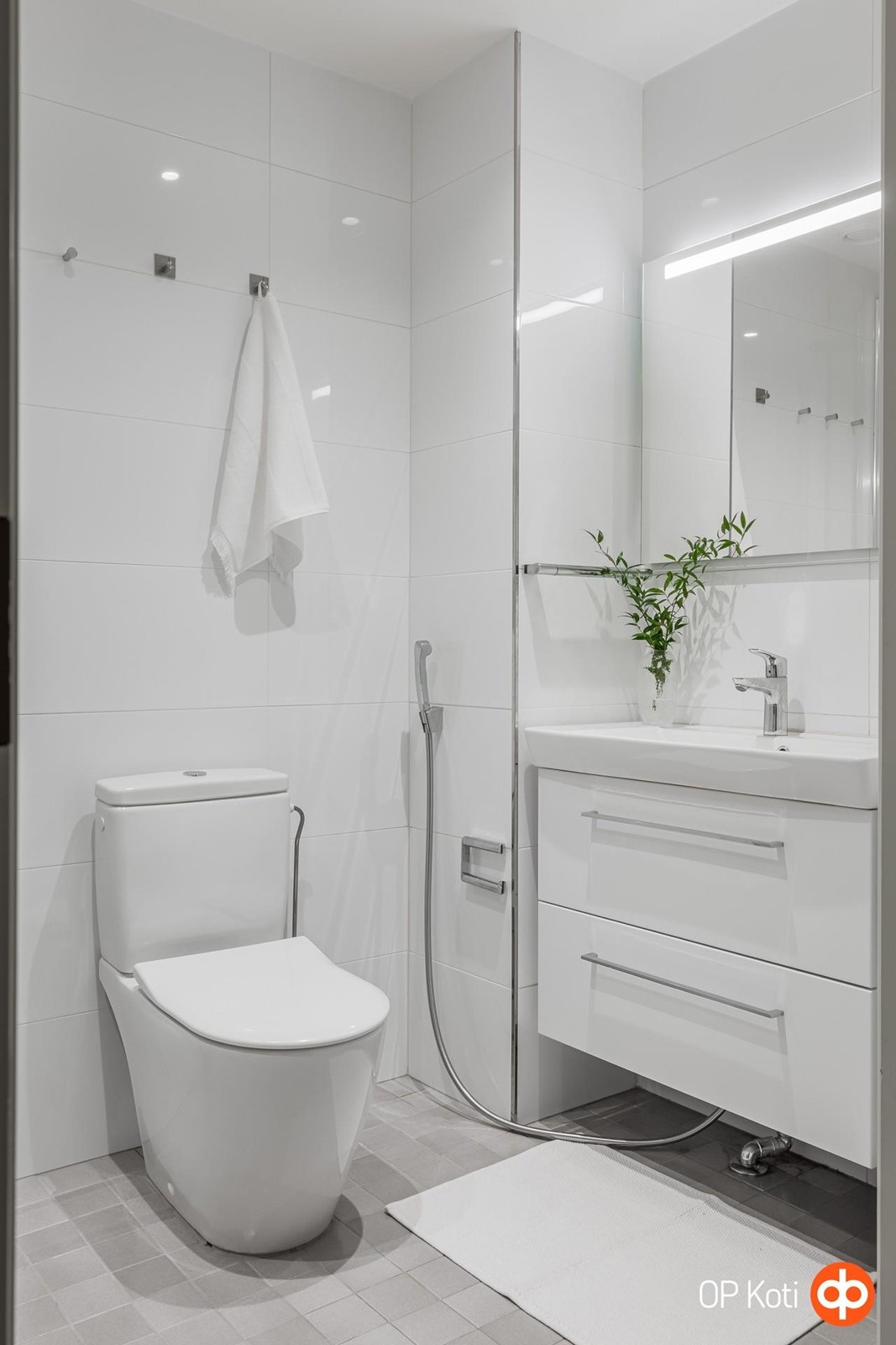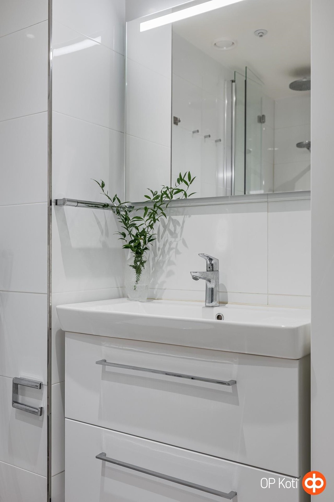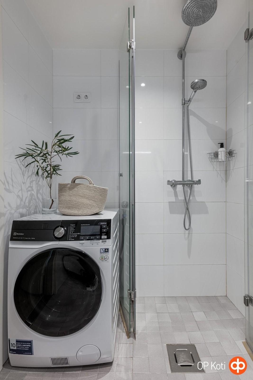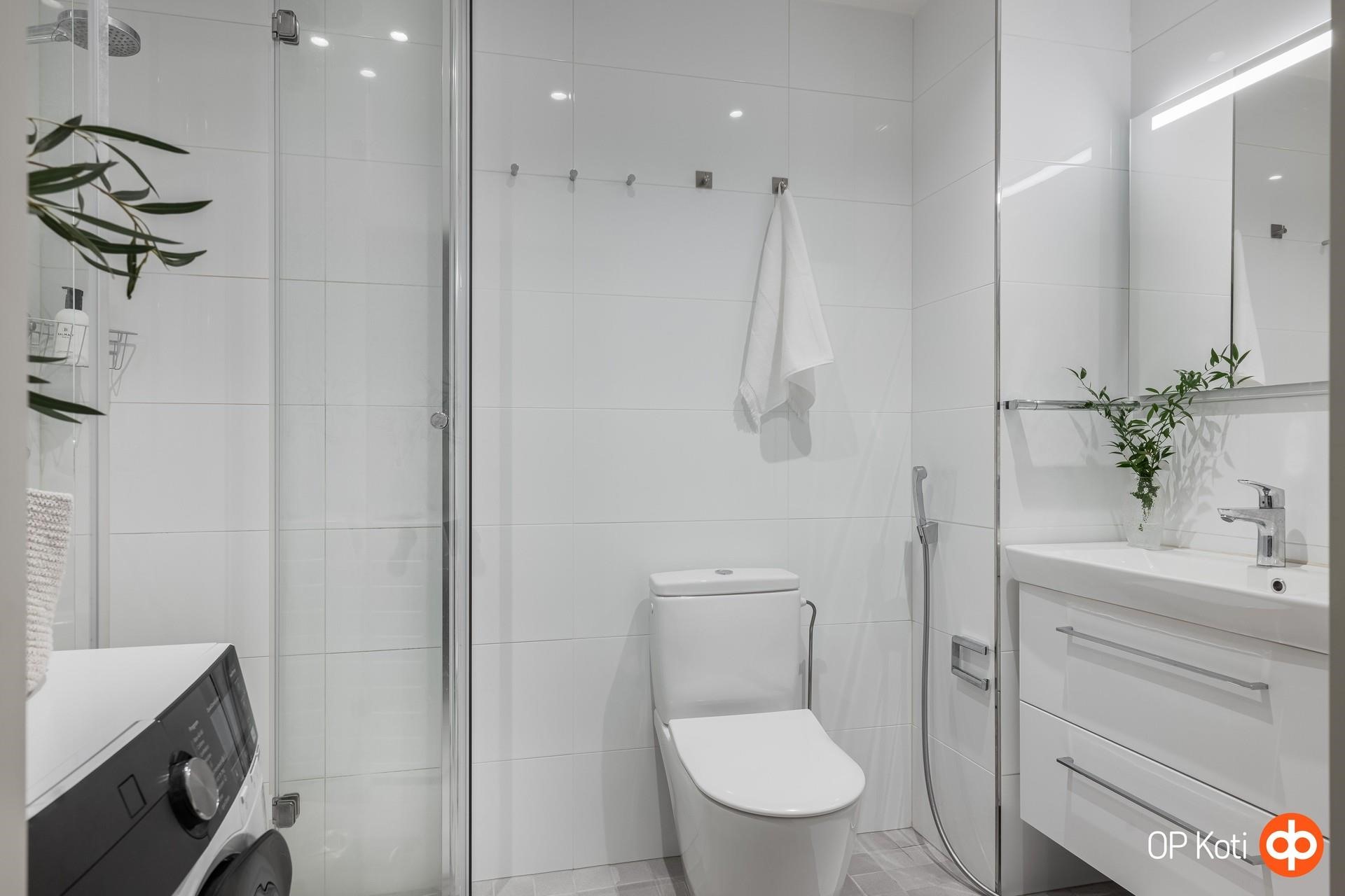 - Kylpyhuone, suihku, suihkuseinä suihkukulma, peilit, allaskaappi, pesukoneliitäntä, lattialämmitys, kiinteät valaisimet.