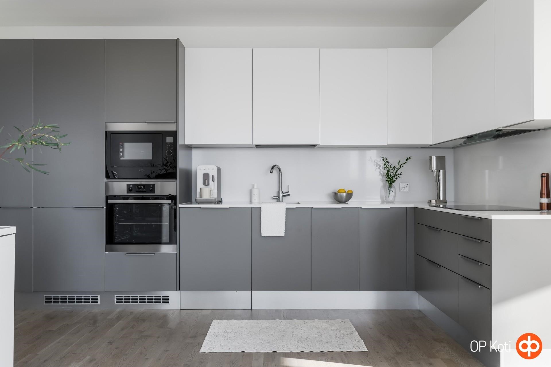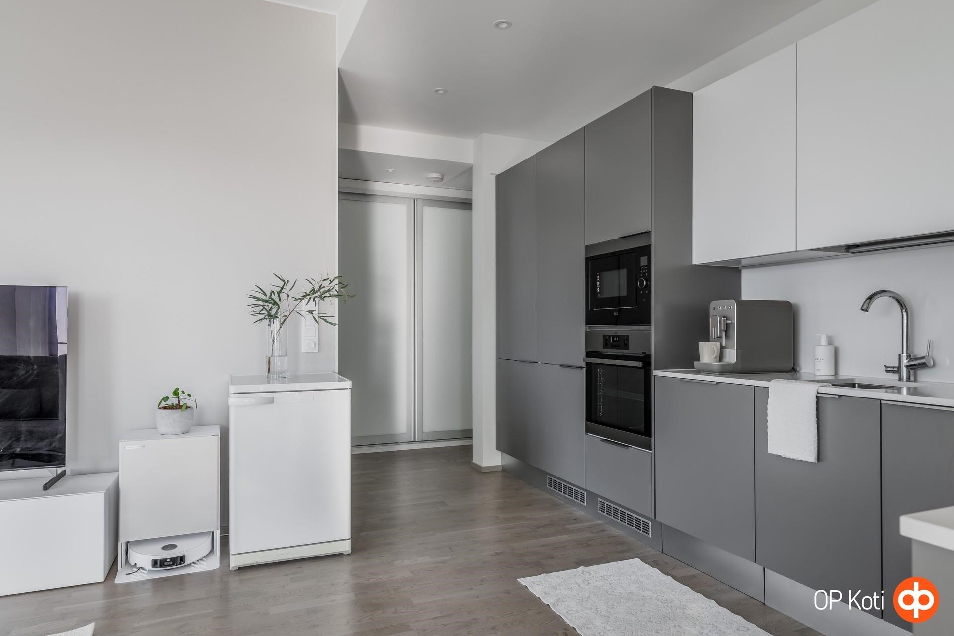 - Jääkaappipakastin integroitu, erillisuuni integroitu, liesitaso, induktioliesi, liesituuletin, mikroaaltouuni integroitu, astianpesukone integroitu, kaapistot, kiinteät valaisimet välitilassa.