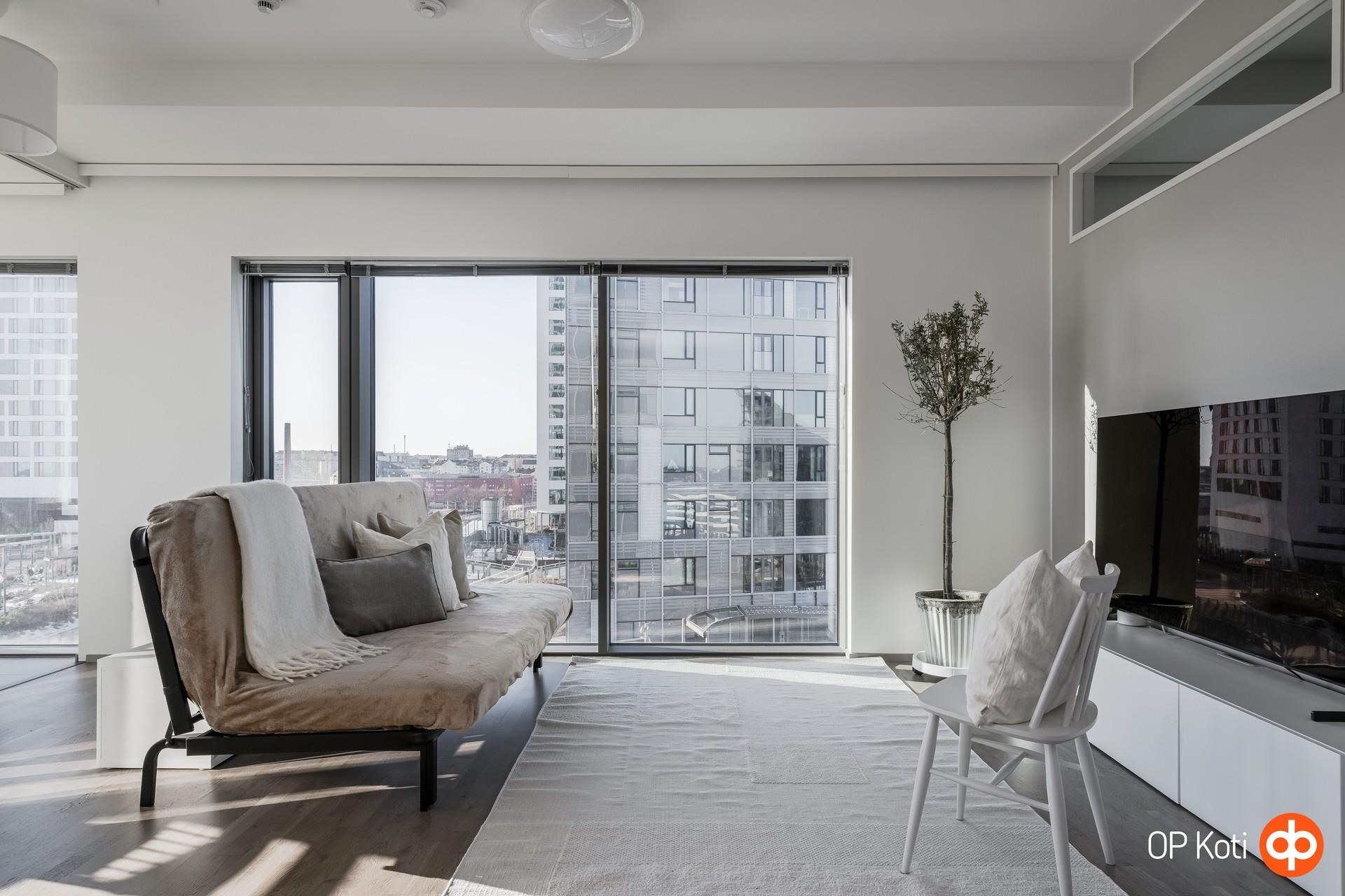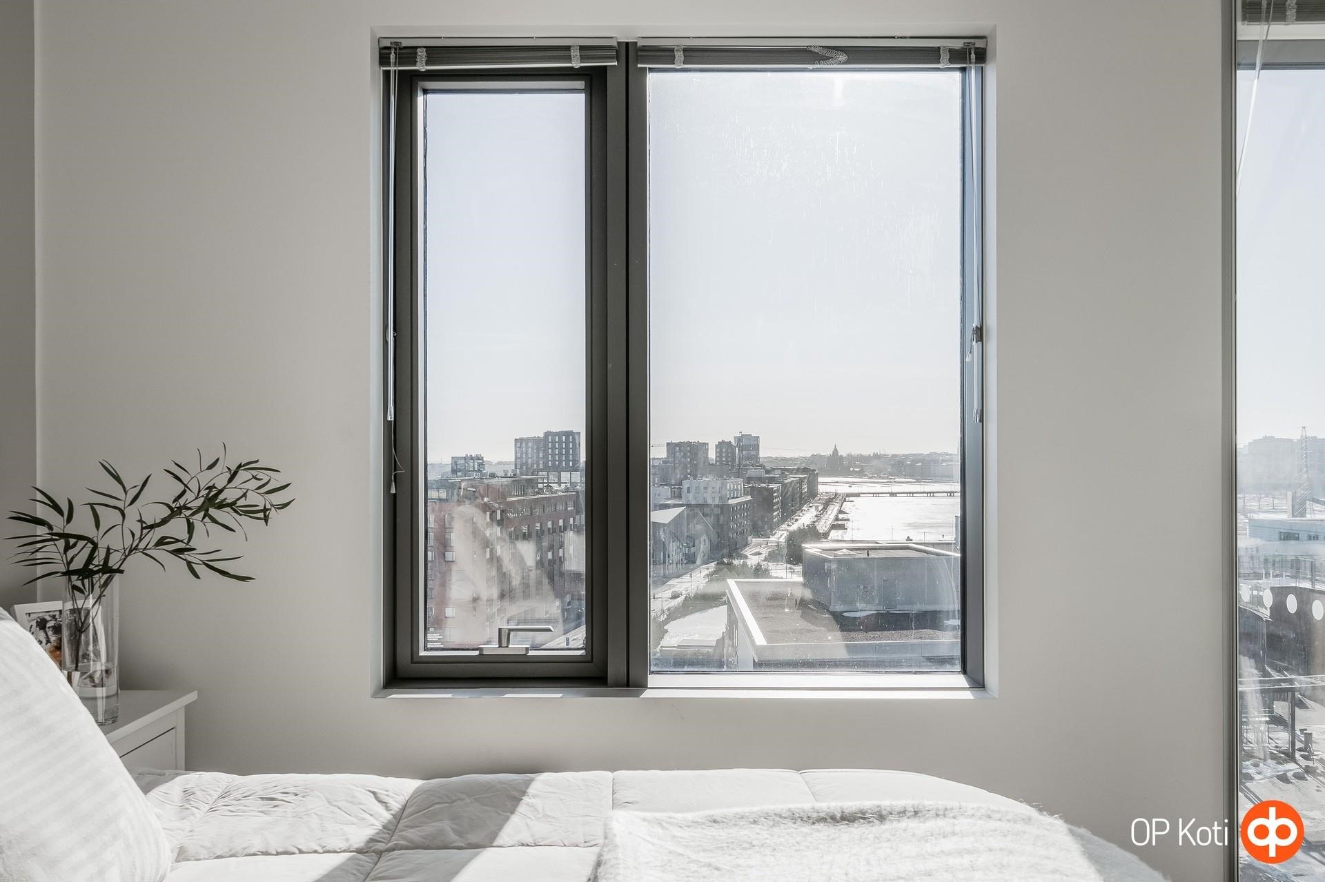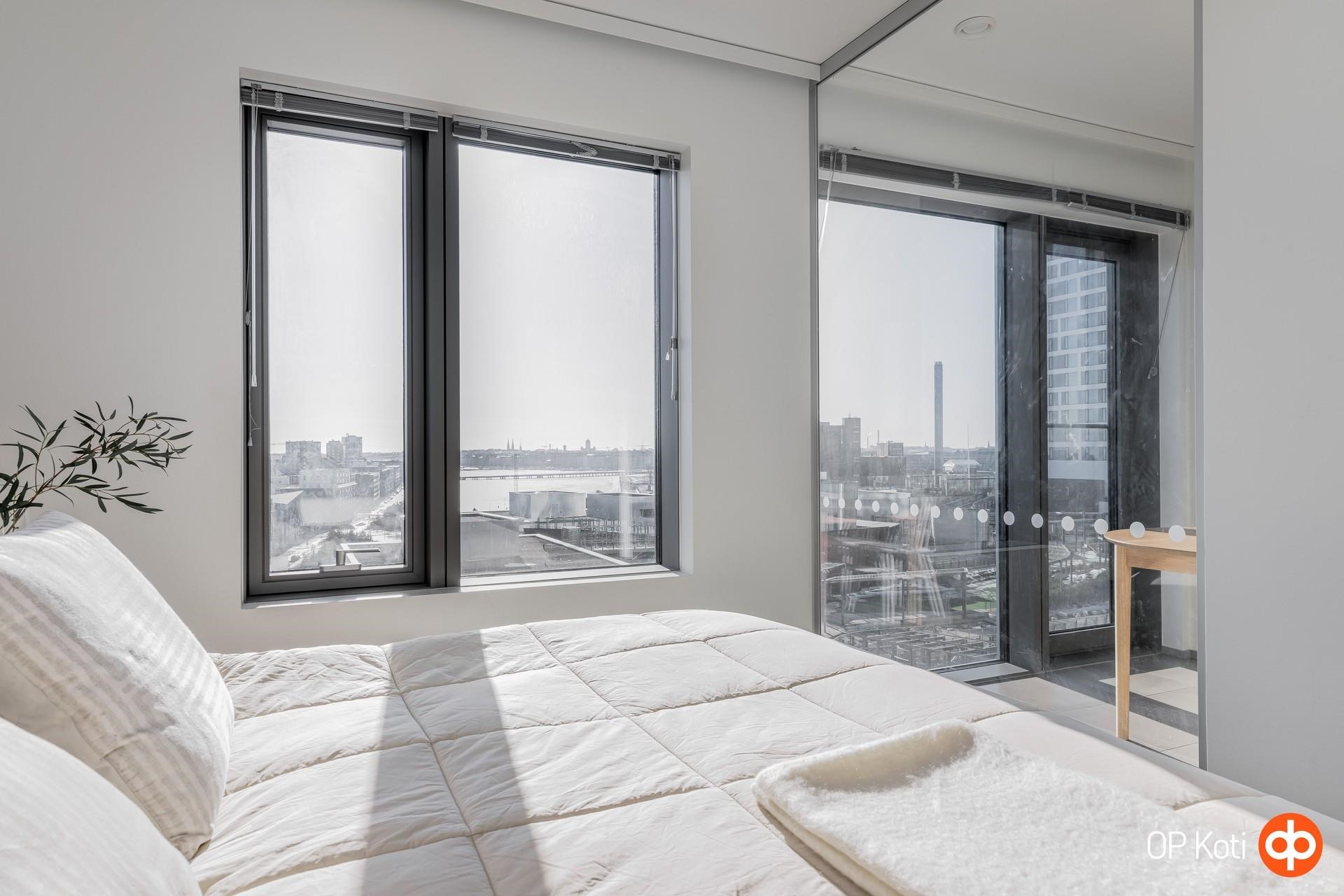 Tämä 64,5 m² kolmio tarjoaa toimivan ja tehokkaan pohjaratkaisun sekä upeat näkymät 8. kerroksesta yli kaupungin ja merelle. Kaksi makuuhuonetta tekevät kodista monikäyttöisen kokonaisuuden niin pariskunnalle, pienelle perheelle kuin työhuonetta tarvitsevalle. Suuret ikkunapinnat tuovat runsaasti luonnonvaloa ja tekevät maisemasta olennaisen osan asumiskokemusta.