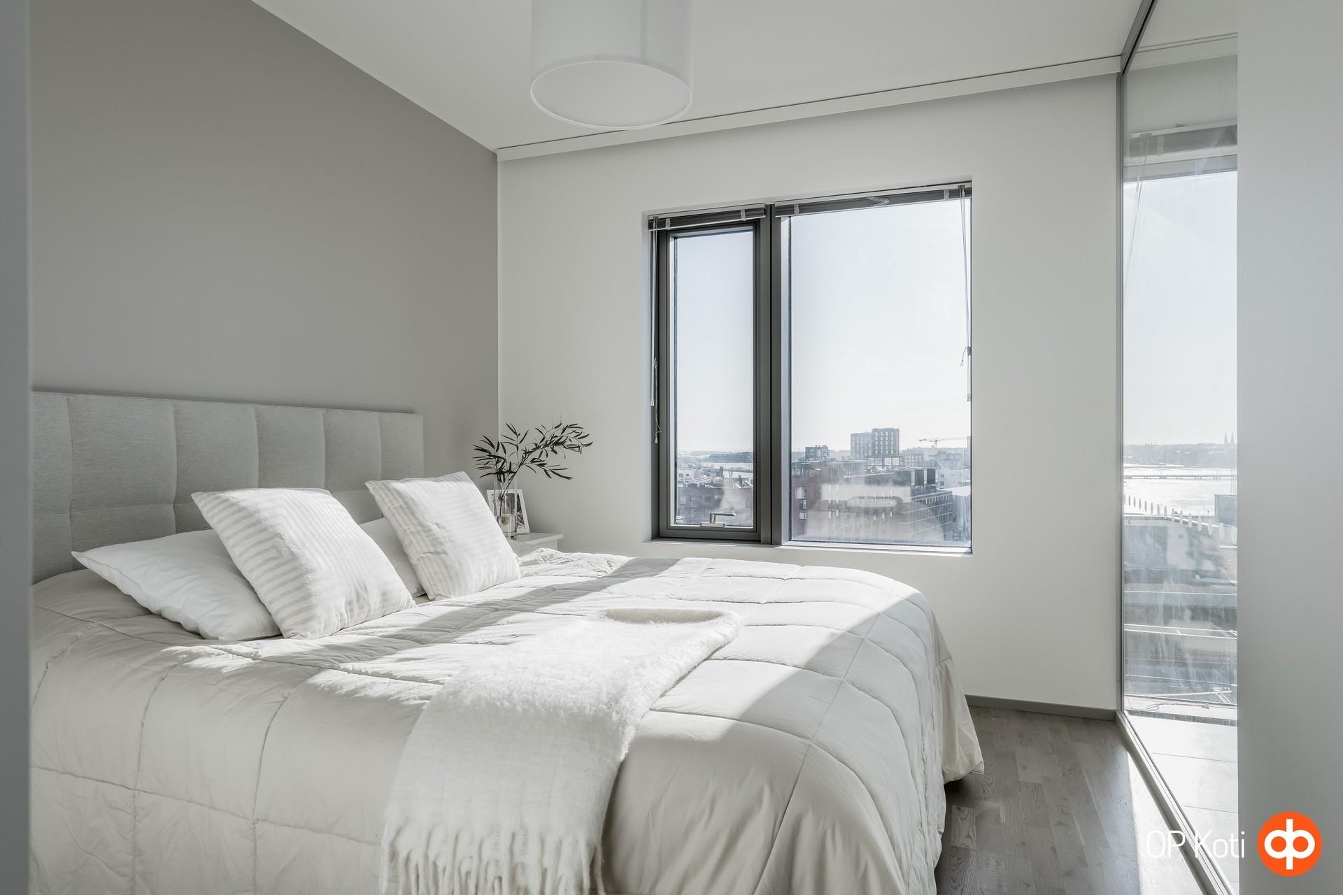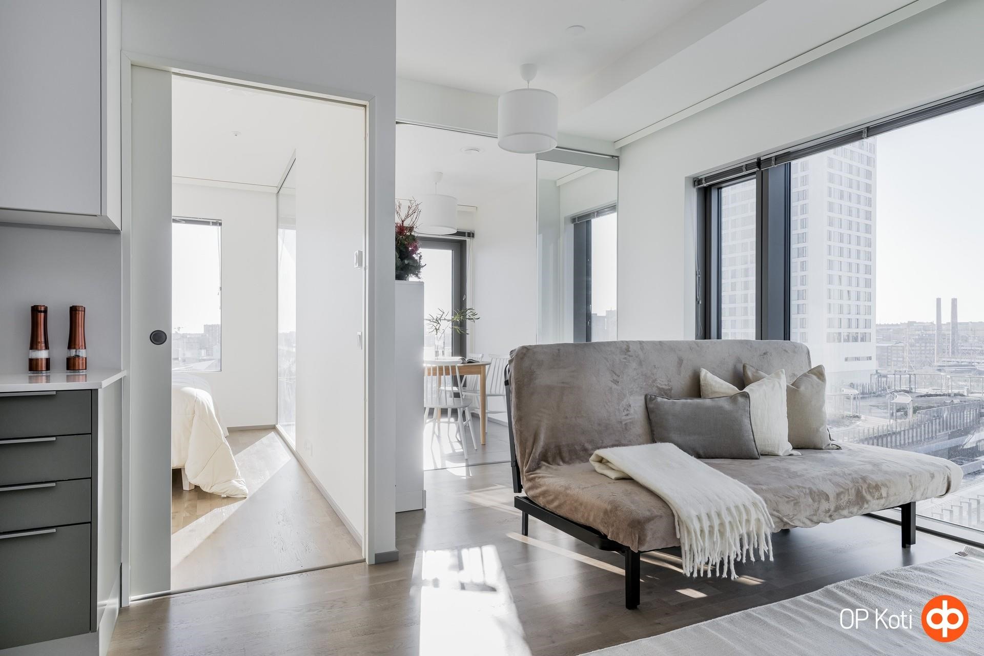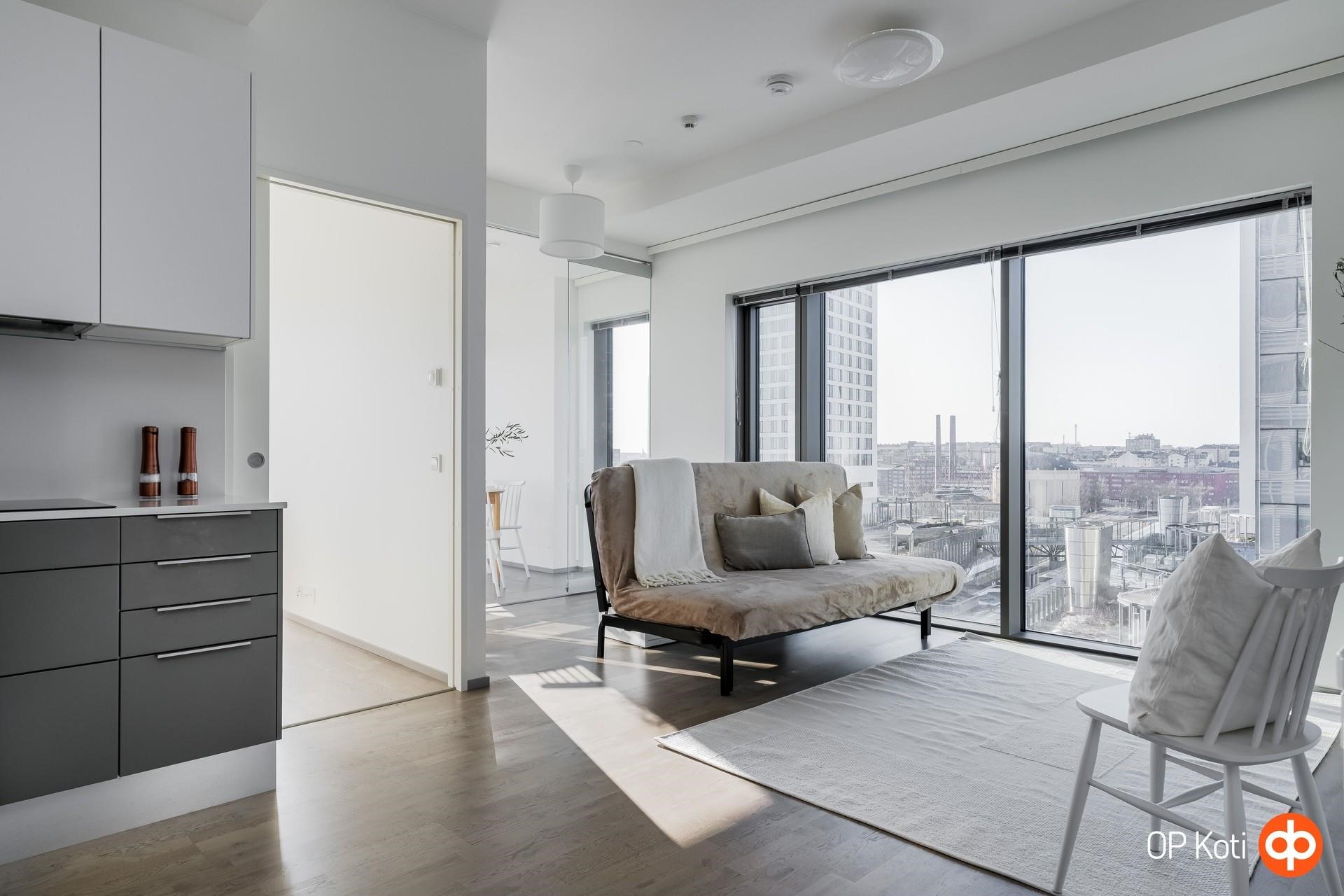 Tämä 64,5 m² kolmio tarjoaa toimivan ja tehokkaan pohjaratkaisun sekä upeat näkymät 8. kerroksesta yli kaupungin ja merelle. Kaksi makuuhuonetta tekevät kodista monikäyttöisen kokonaisuuden niin pariskunnalle, pienelle perheelle kuin työhuonetta tarvitsevalle. Suuret ikkunapinnat tuovat runsaasti luonnonvaloa ja tekevät maisemasta olennaisen osan asumiskokemusta.