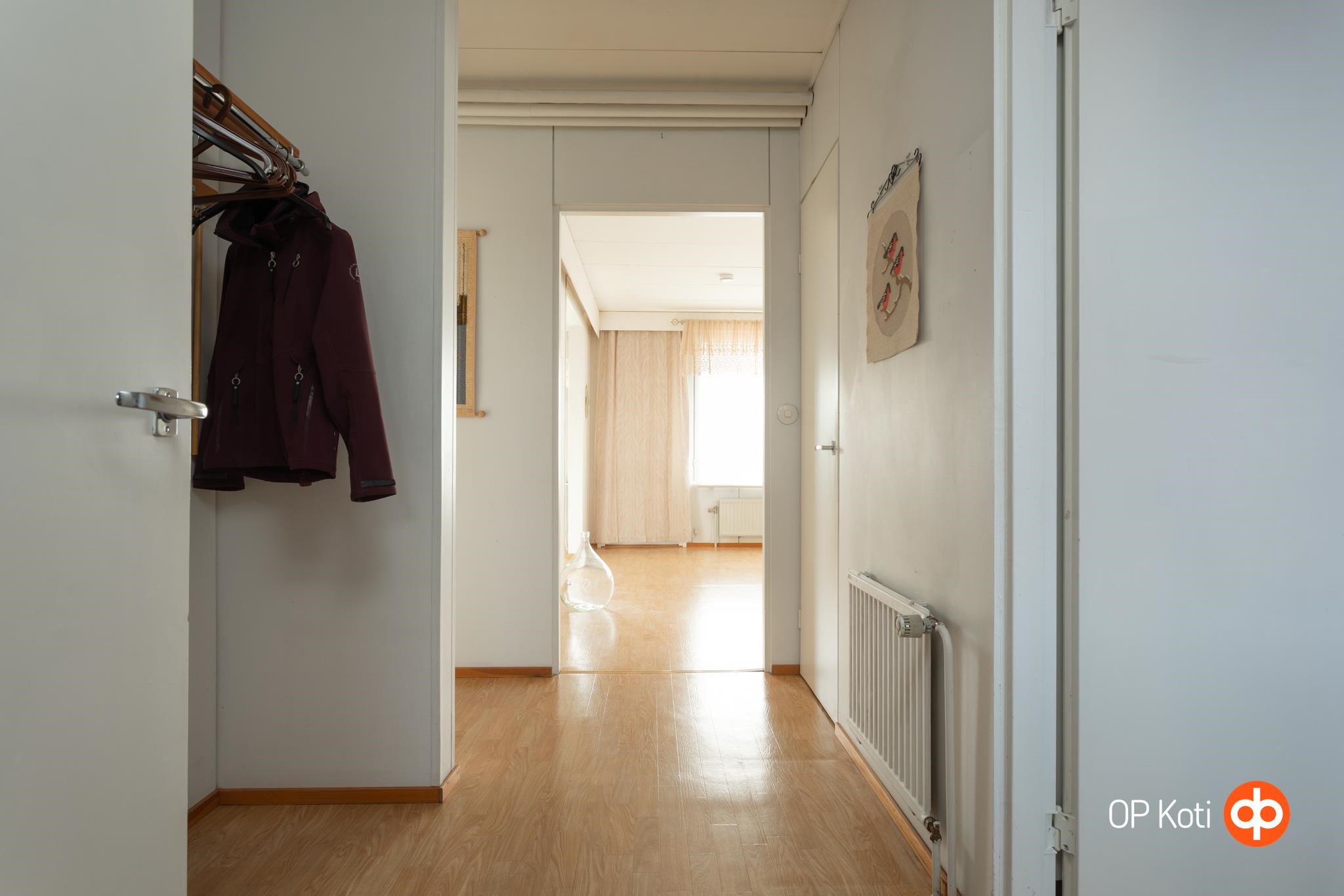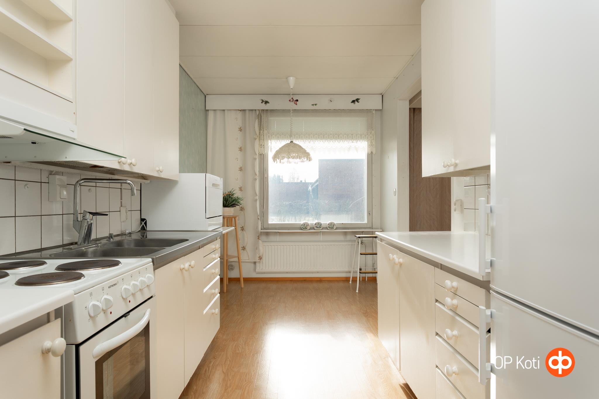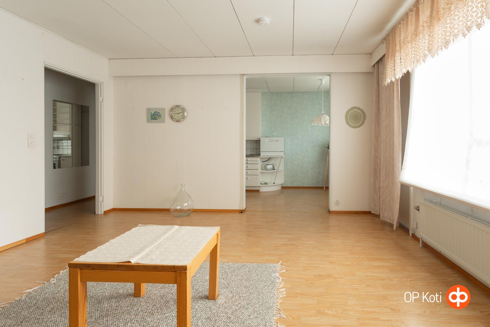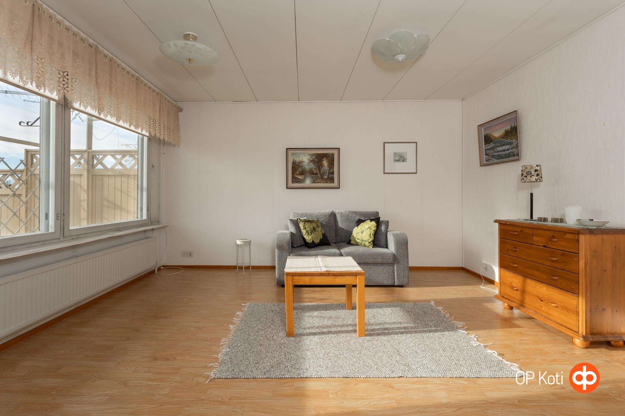 Huonejärjestys antaa asumiselle selkeyttä: erillinen keittiö ja ruokailutila mahdollistavat yhteiset hetket ruoanlaiton parissa, kun taas olohuone tarjoaa rauhallisen paikan rentoutumiseen. Olohuoneesta on käynti takapihalle, joka suuntautuu kaakon suuntaan.