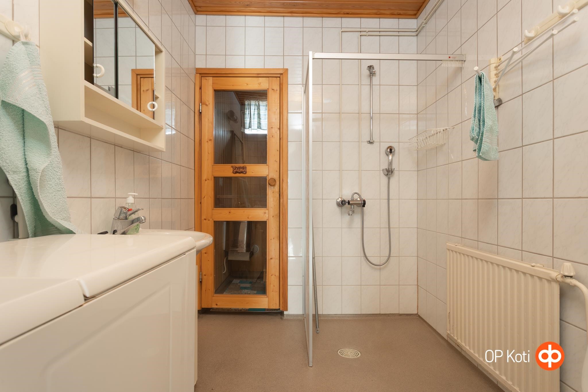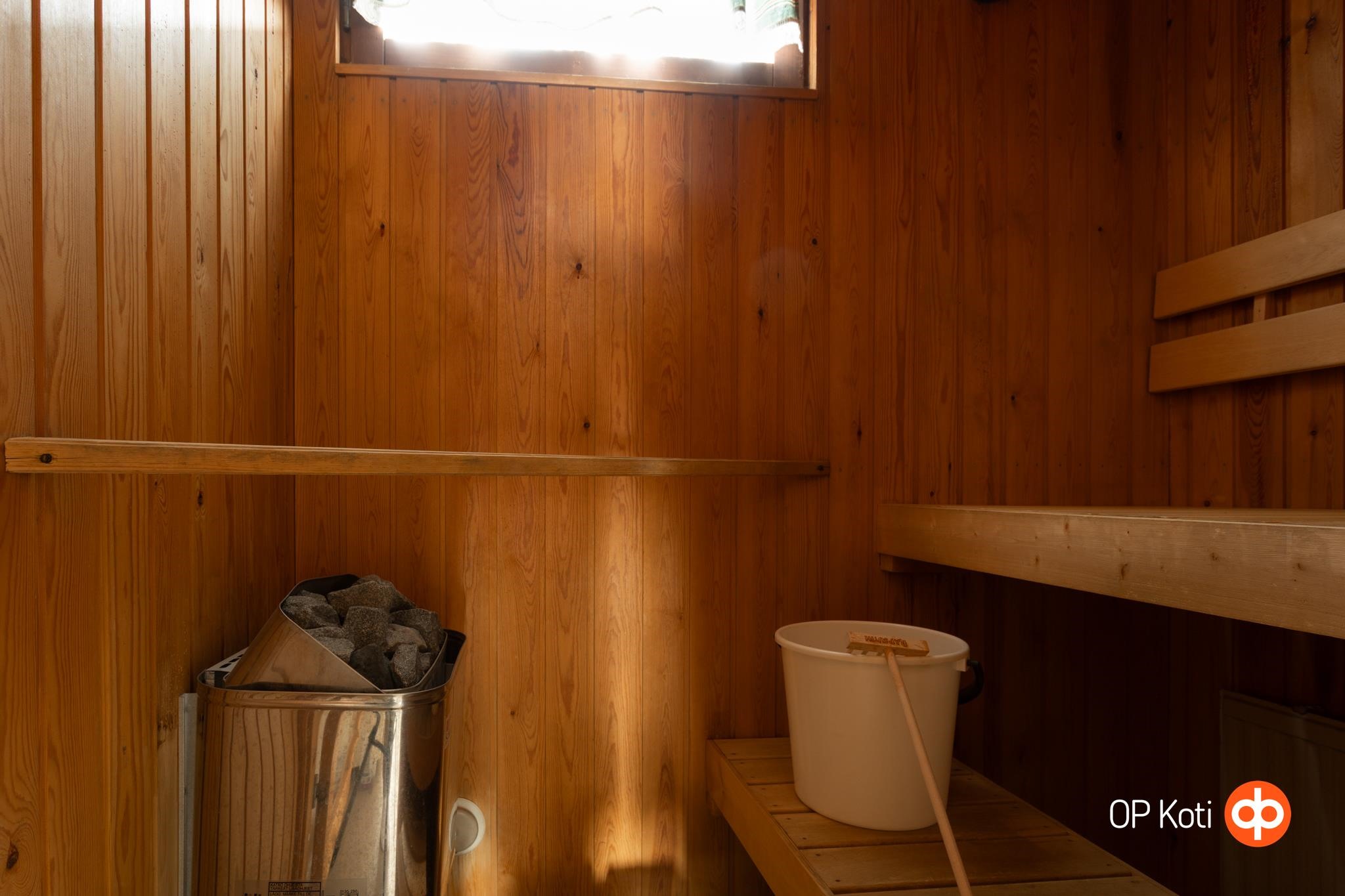 - Sauna, sähkökiuas, kylpyhuone, suihku, suihkuseinä, peilit, allaskaappi, pesukoneliitäntä, kiinteät valaisimet.