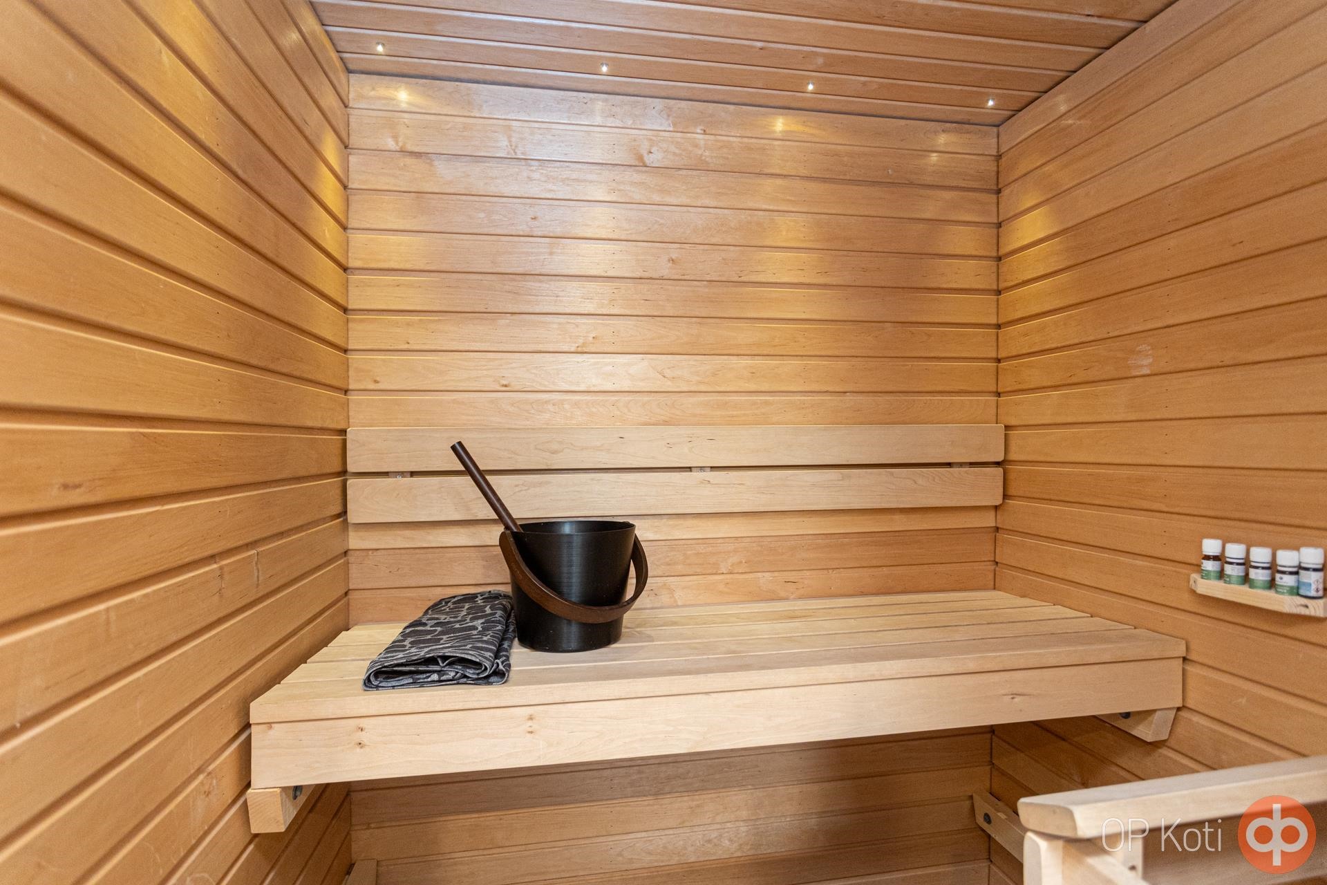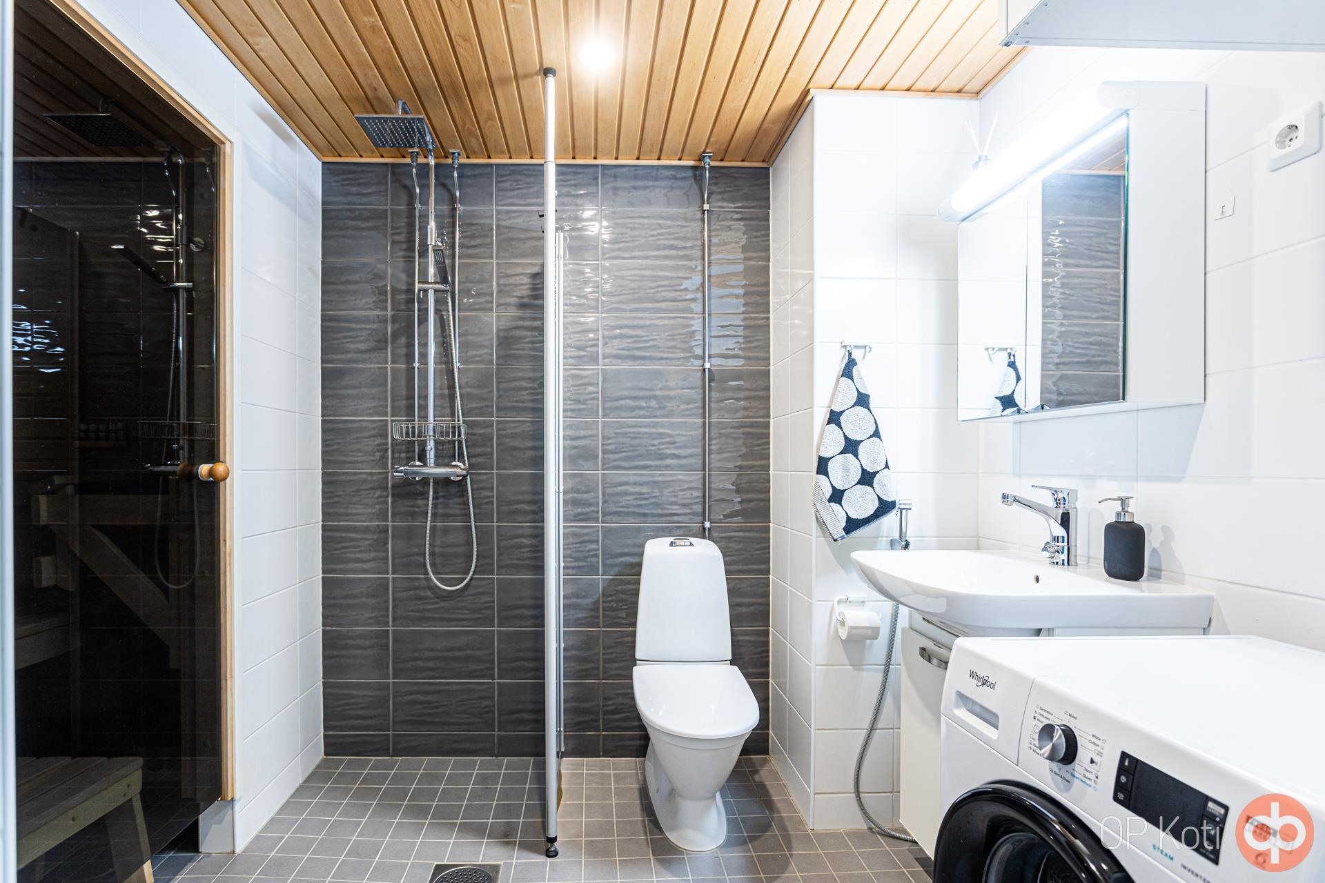 - Sauna, sähkökiuas, kylpyhuone, suihku, suihkuseinä, peilikaappi, allaskaappi, pesukoneliitäntä, lattialämmitys, kiinteät valaisimet.