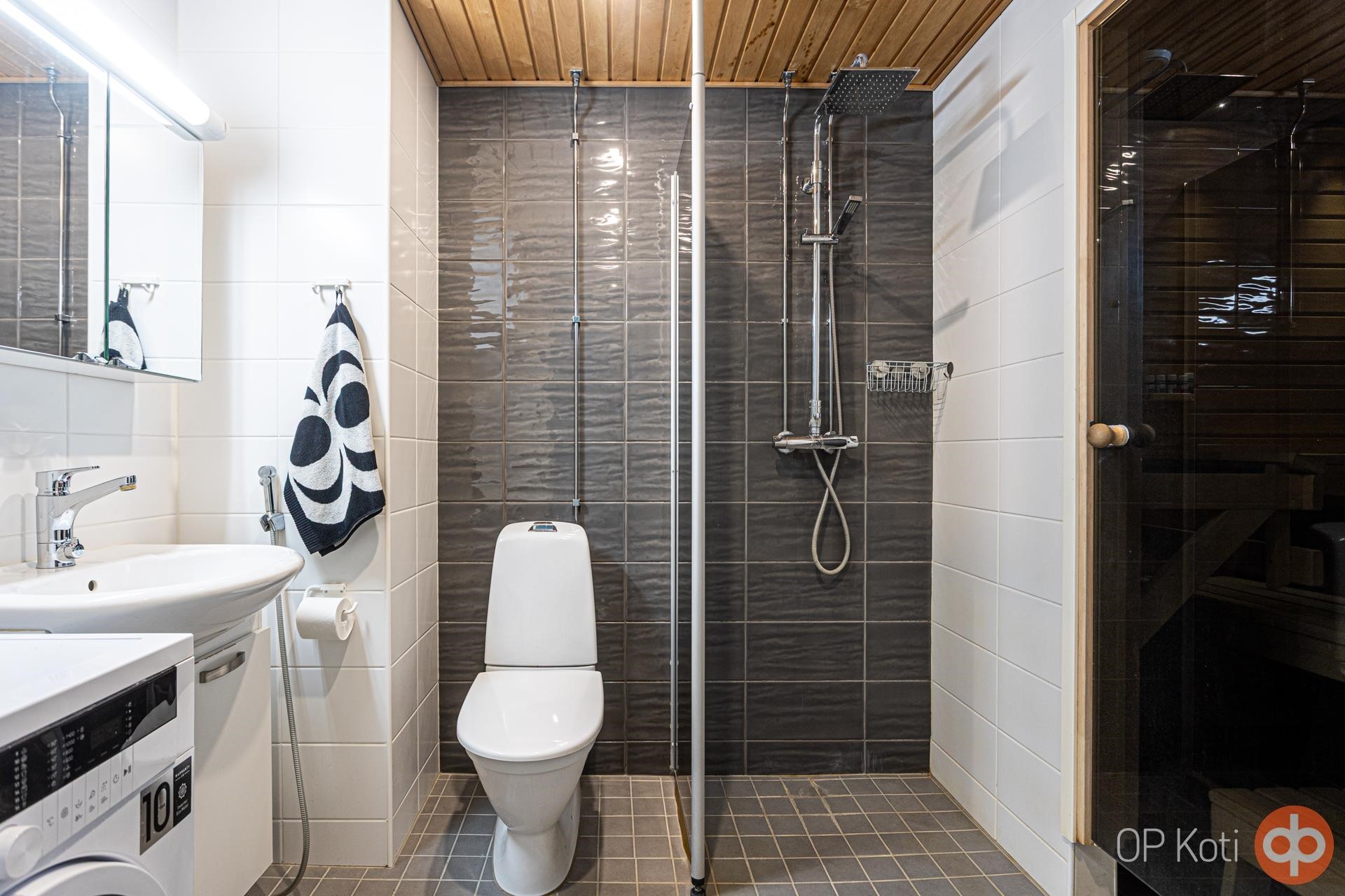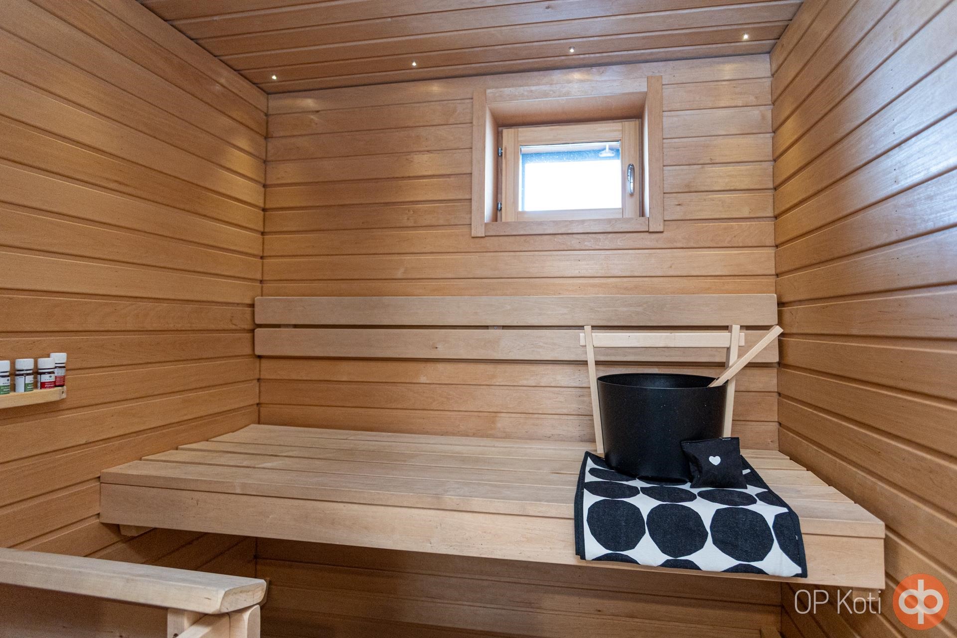 - Sauna, sähkökiuas, kylpyhuone, suihku, suihkuseinä, kaapit, allaskaappi, pesukoneliitäntä, lattialämmitys, kiinteät valaisimet.