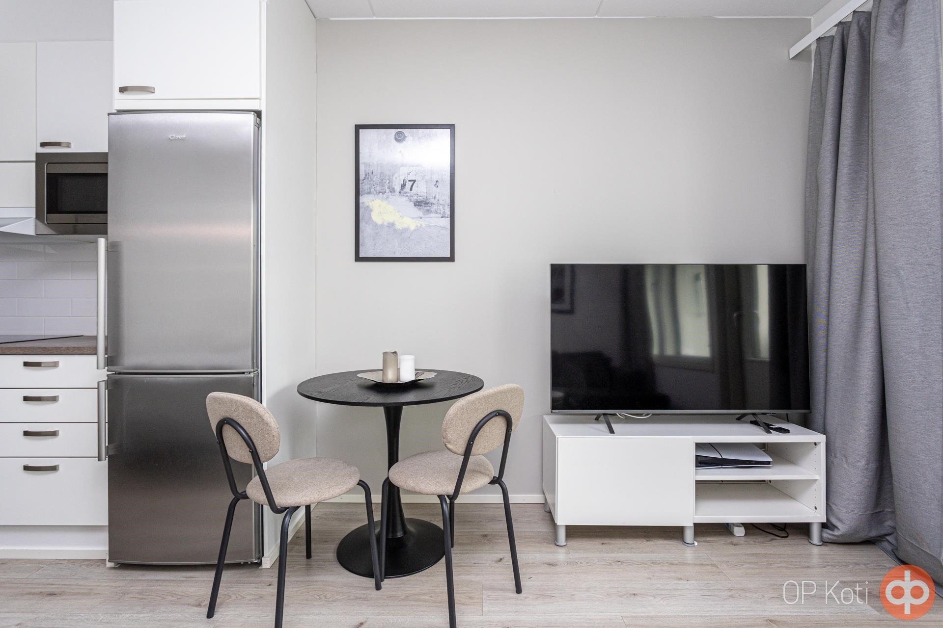 - Jääkaappipakastin, keraaminen liesi, liesituuletin, mikroaaltouuni, astianpesukone, kaapistot, kiinteät valaisimet.